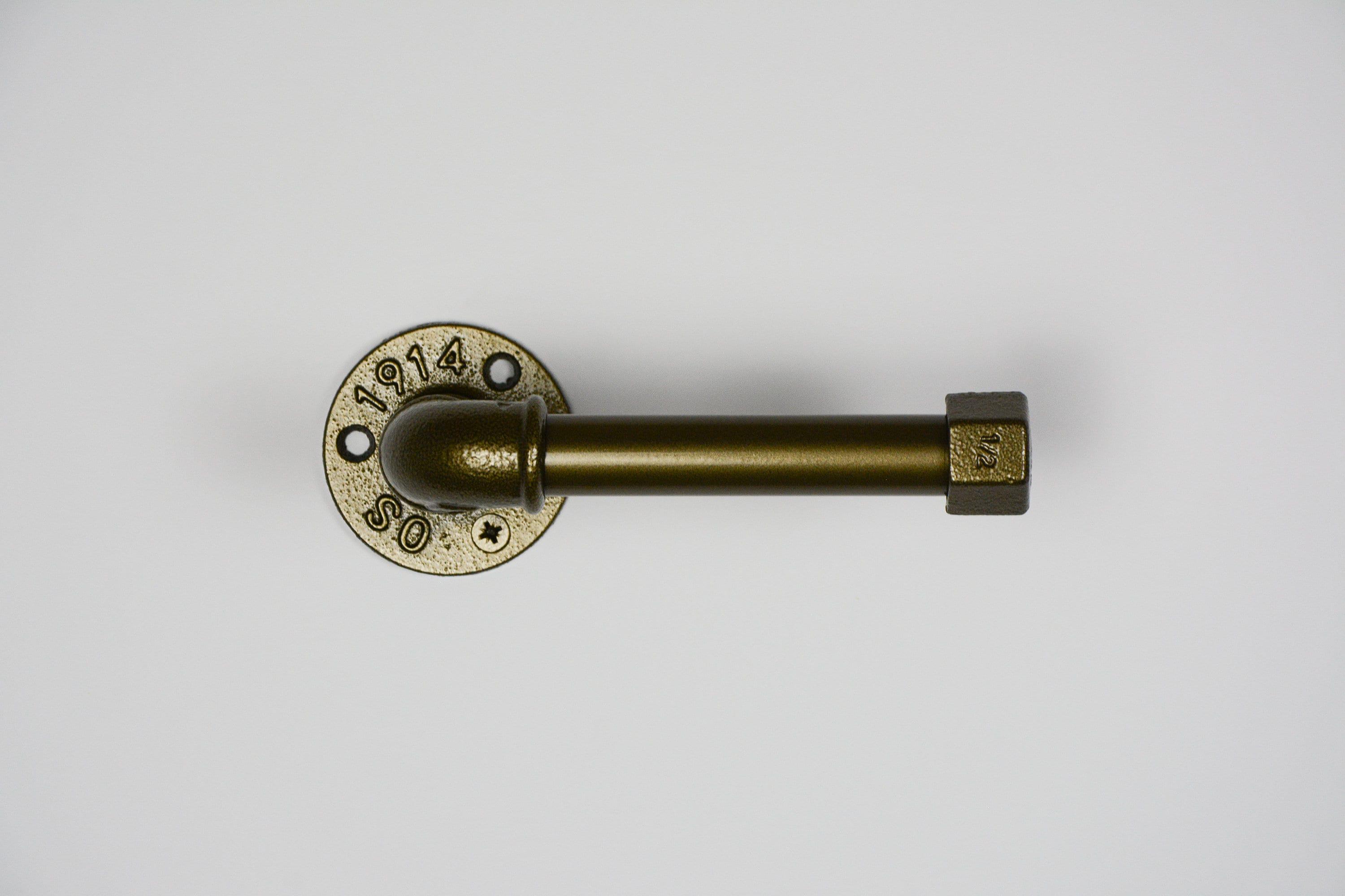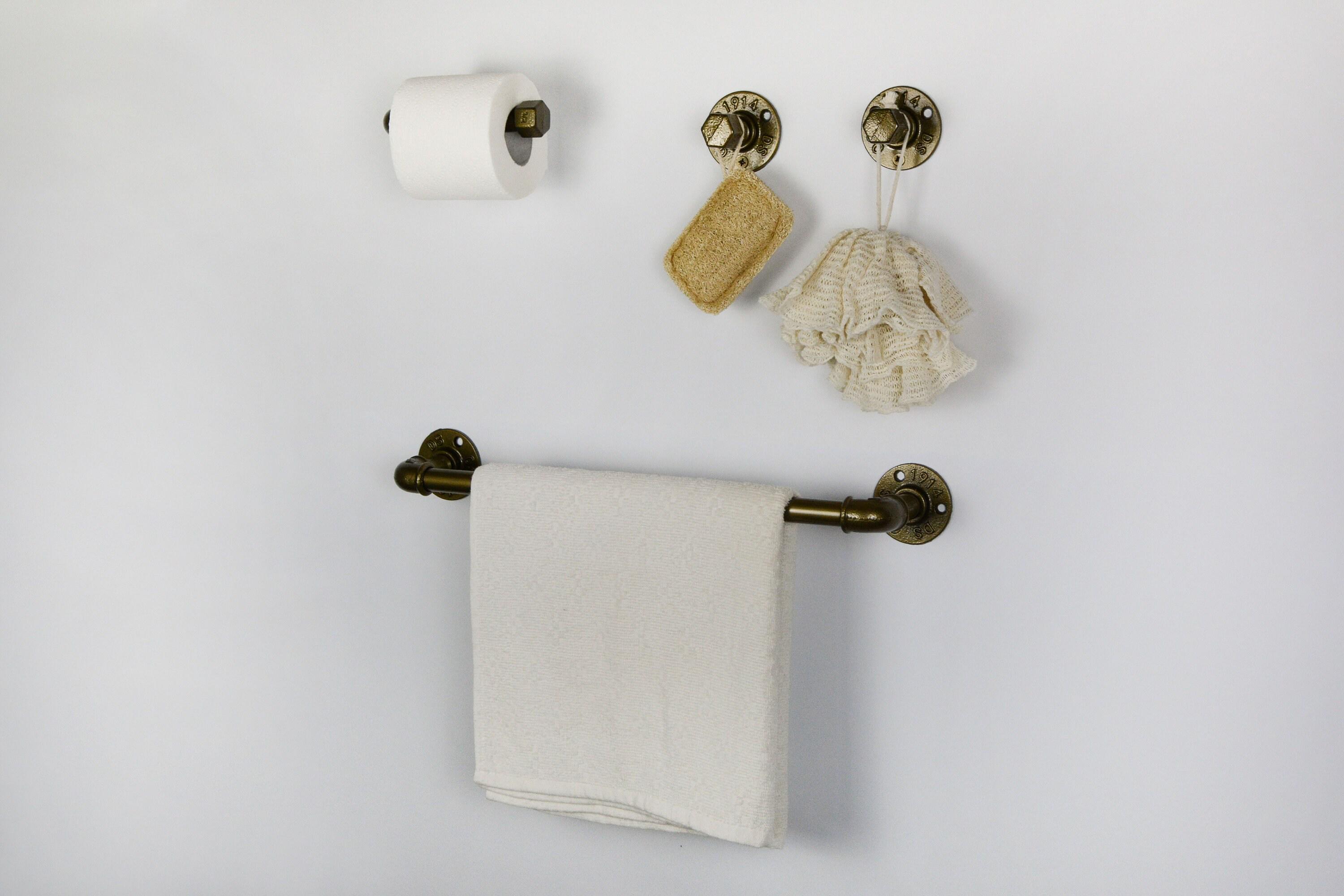This practical pipe bathroom set will be a beautiful yet functional piece in your home! Use this pipe towel rack, toilet roll holder and wall hooks to keep your home organized. The color of the set in the pictures is Aged Brass, however, it can be made in more than 65 colors!