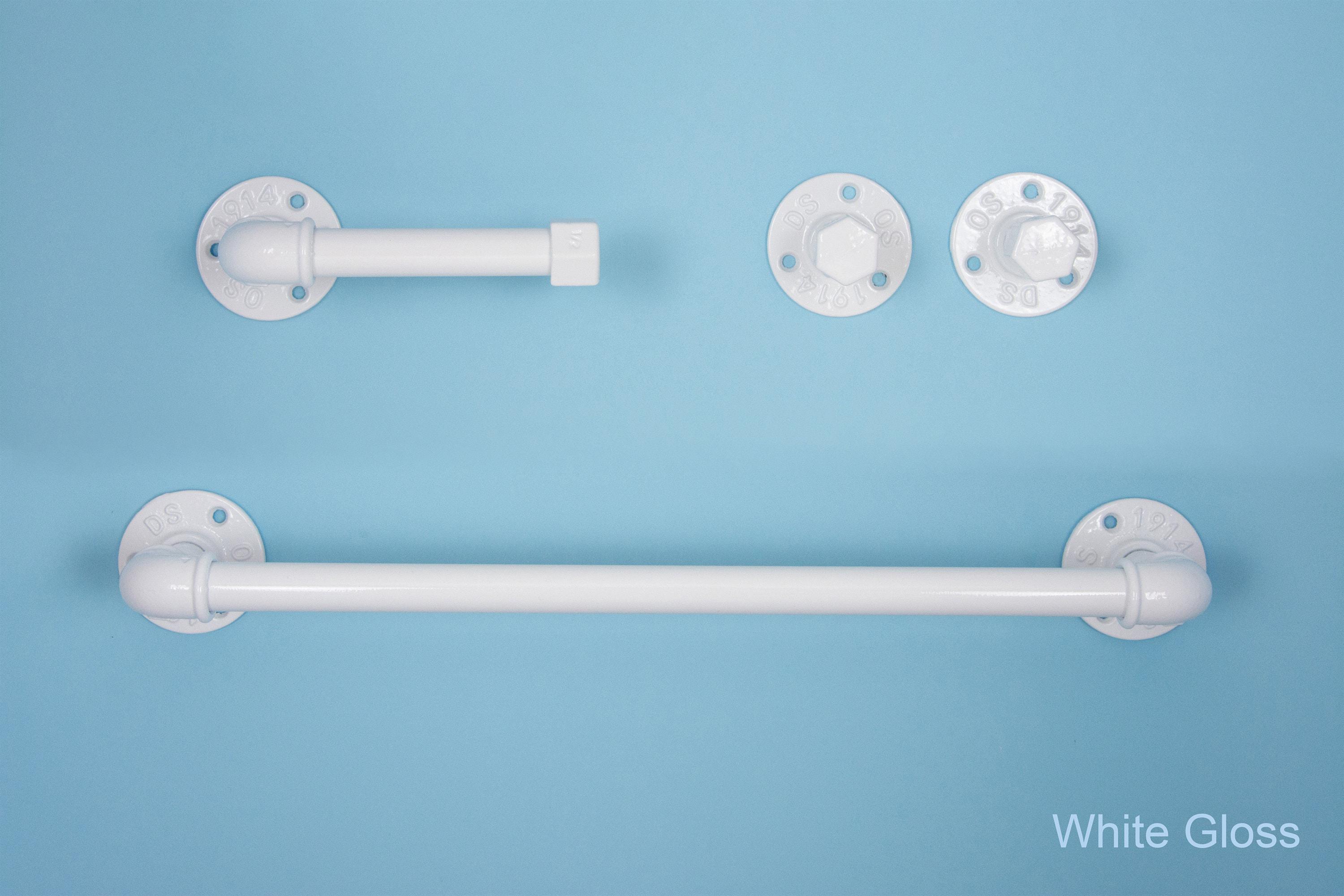 Create your own unique farmhouse bathroom with these pipe bathroom accessories set! This pipe towel rack together with rustic towel hooks will hold your robes and towels while creating an amazing look in your bathroom. The color of the set in the pictures is White Gloss, however, it can be made in more than 65 colors!
