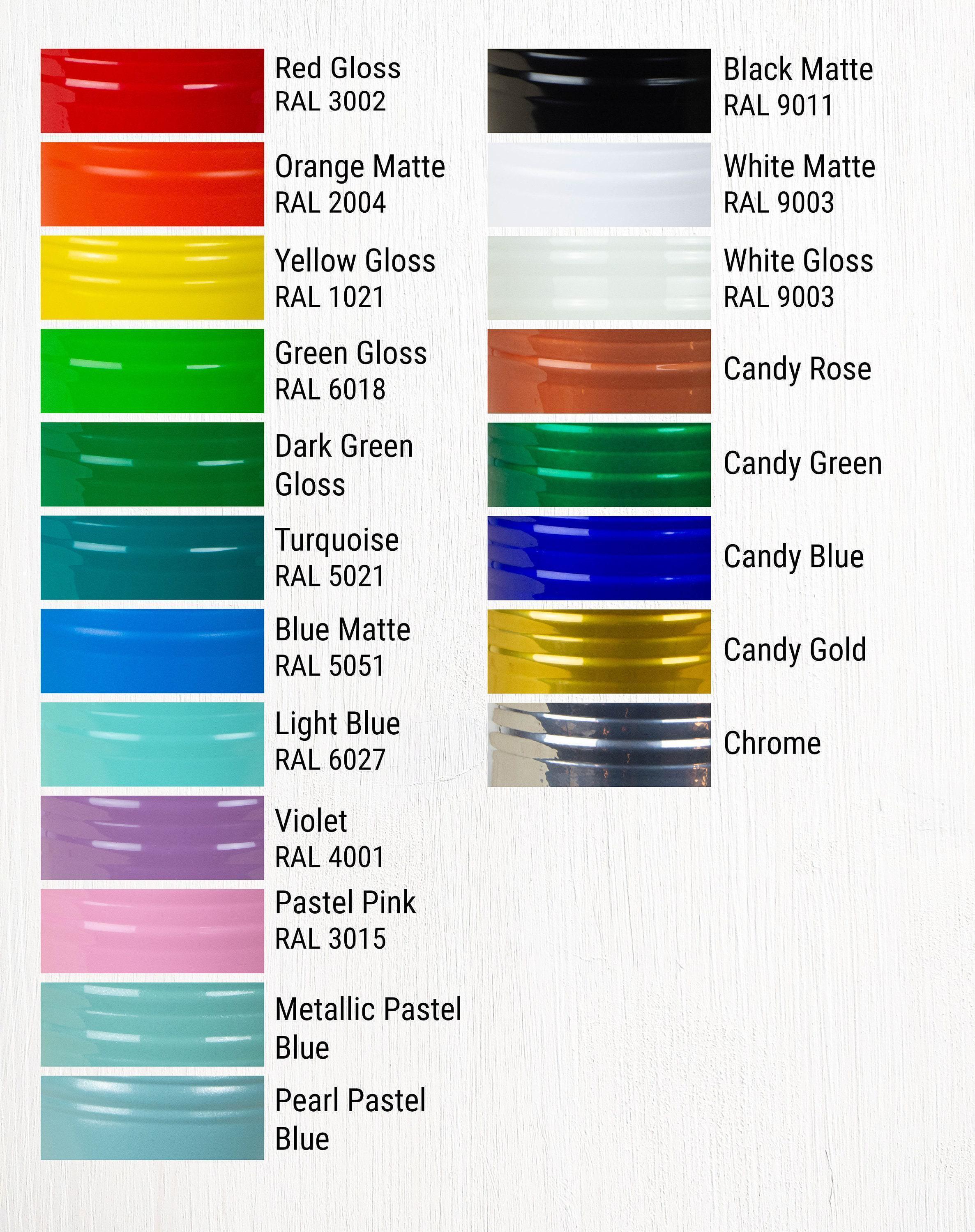 We offer more than 60 powder coat options and 15 wood shelf finish options. You can see all of the powder coat finishes we offer here: https://www.etsy.com/shop/UniqueWoodArtwork?section_id=29436268