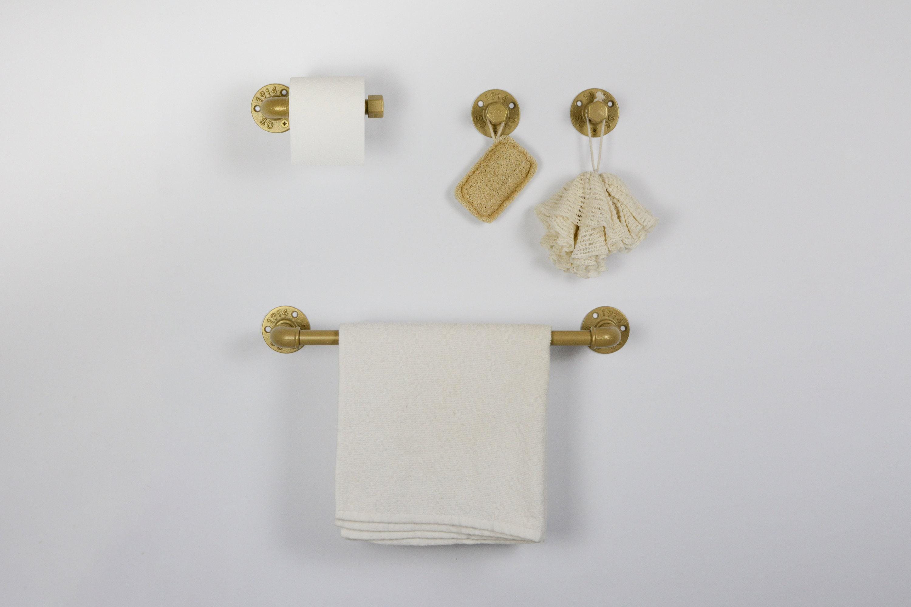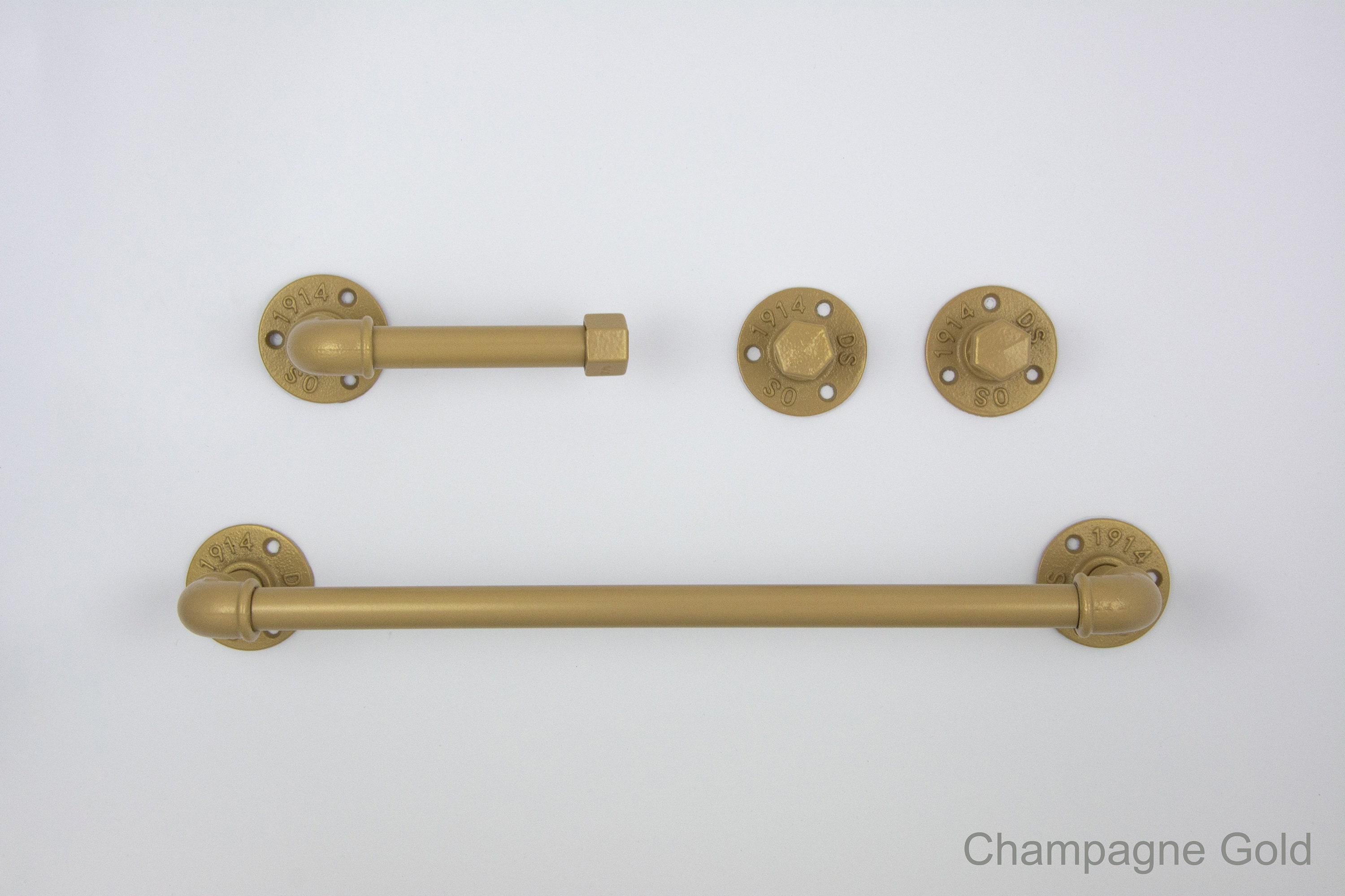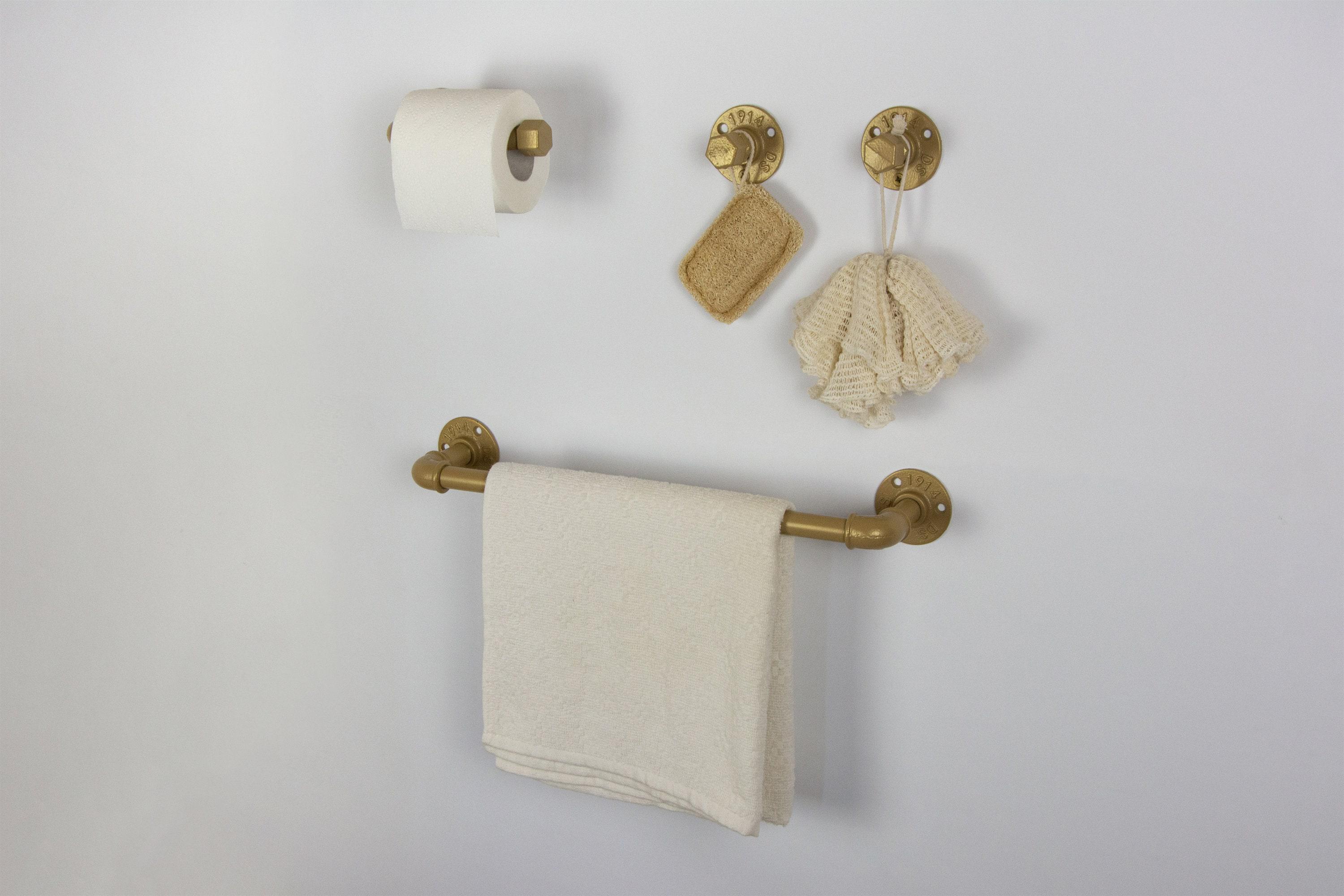 This practical steampunk bathroom set will add charm and sturdiness to any bathroom! These modern bathroom accessories that include a towel rack, two towel hooks, toilet paper holder will be sure to add a unique touch to your washroom. The color of the set in the pictures is Champagne Gold, however, it can be made in more than 65 colors!