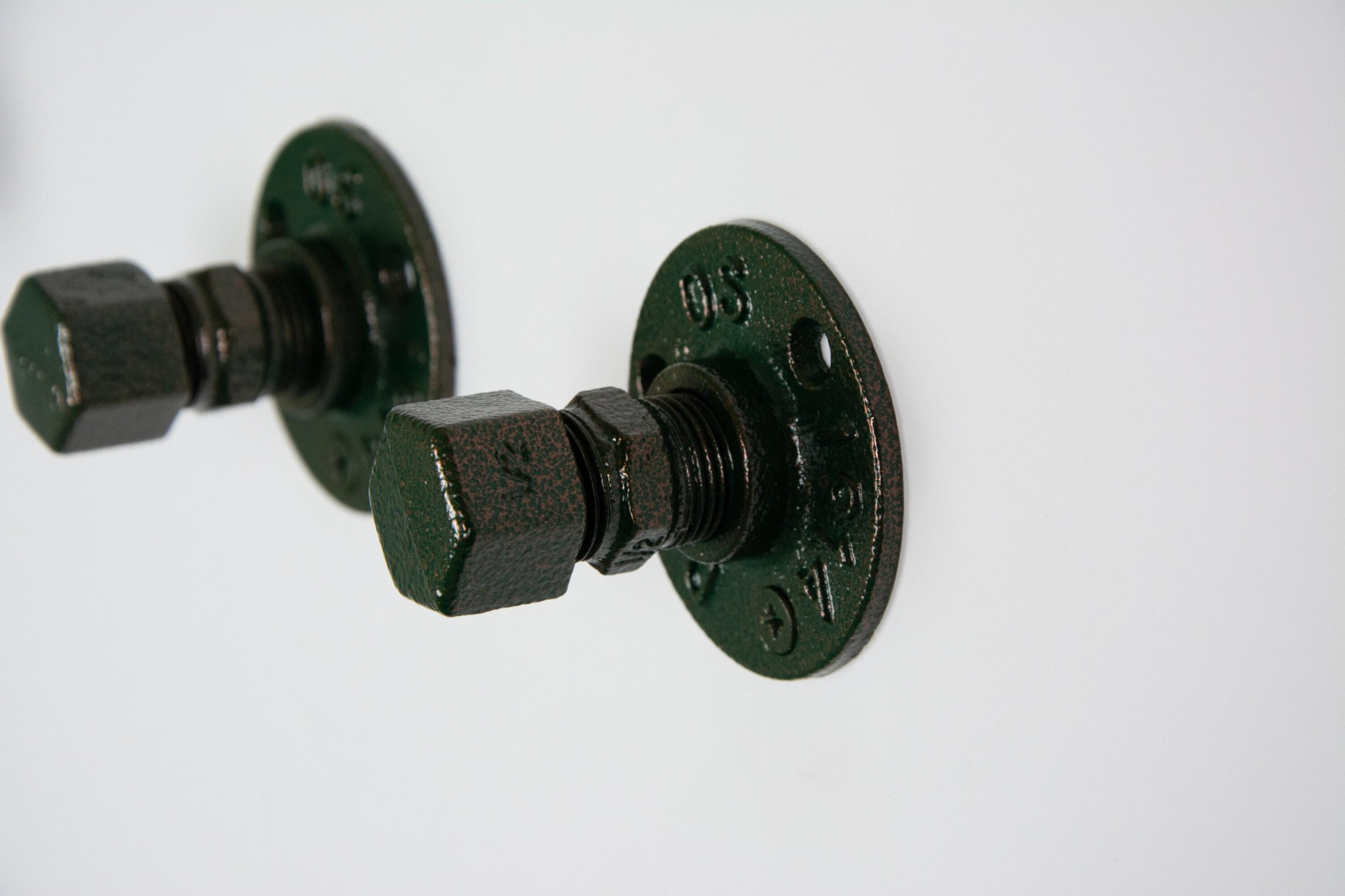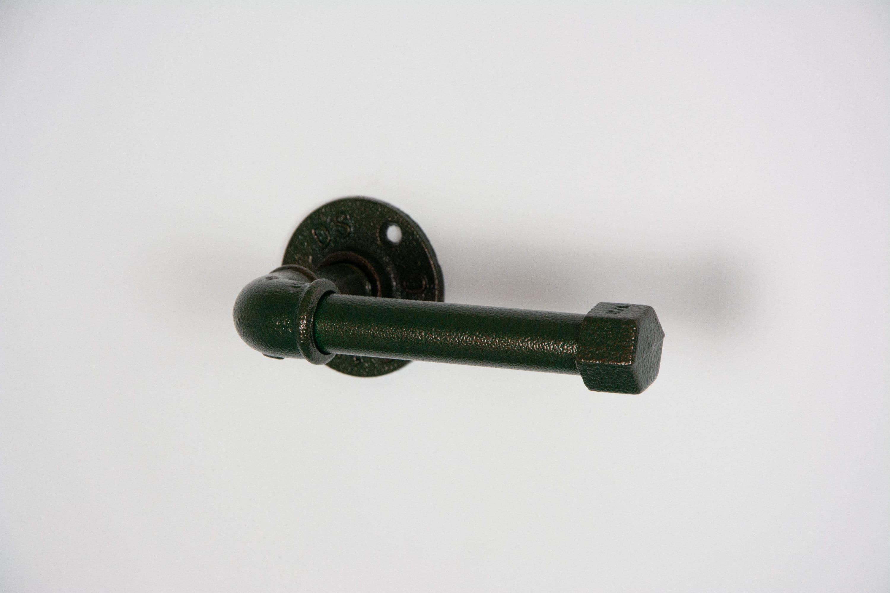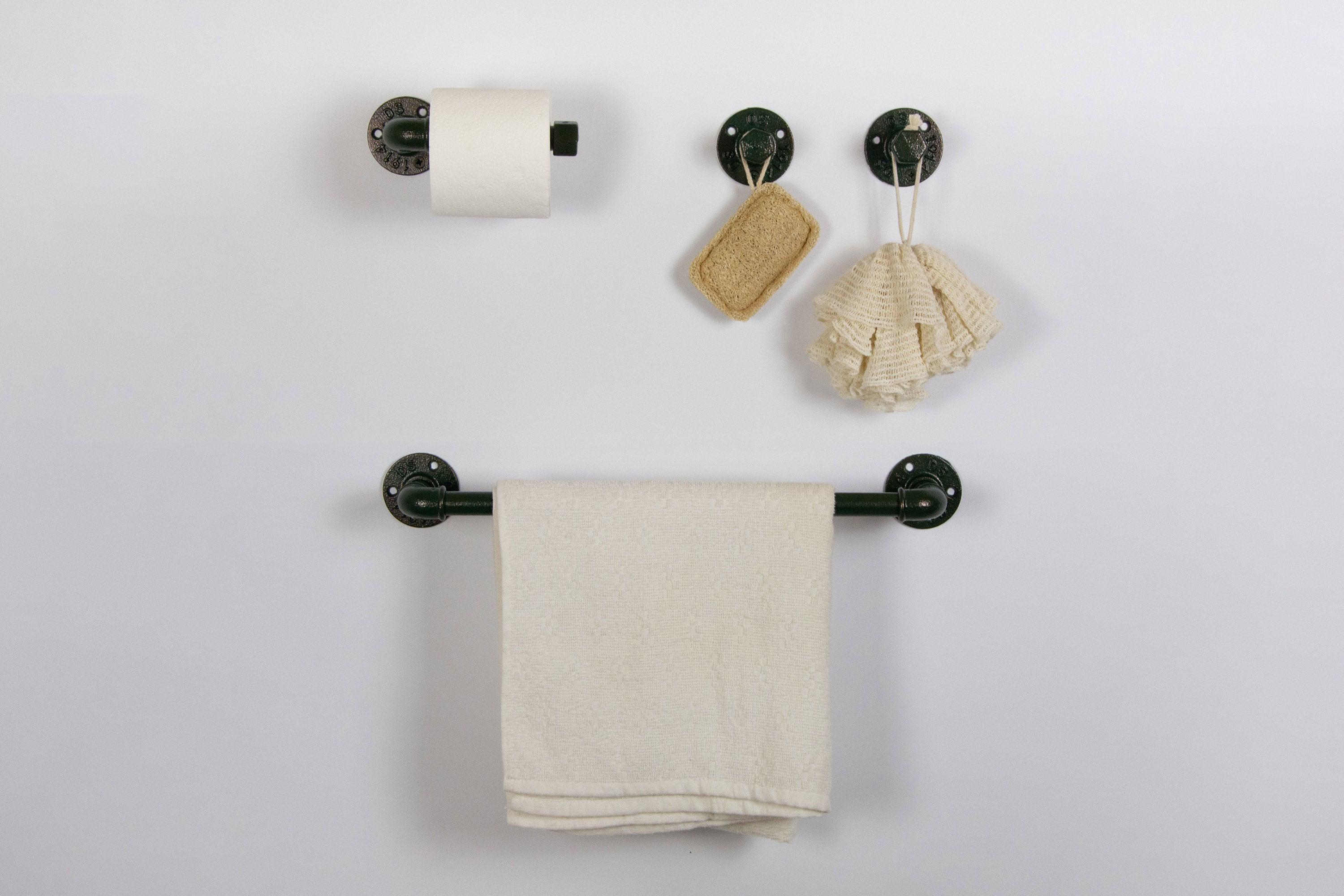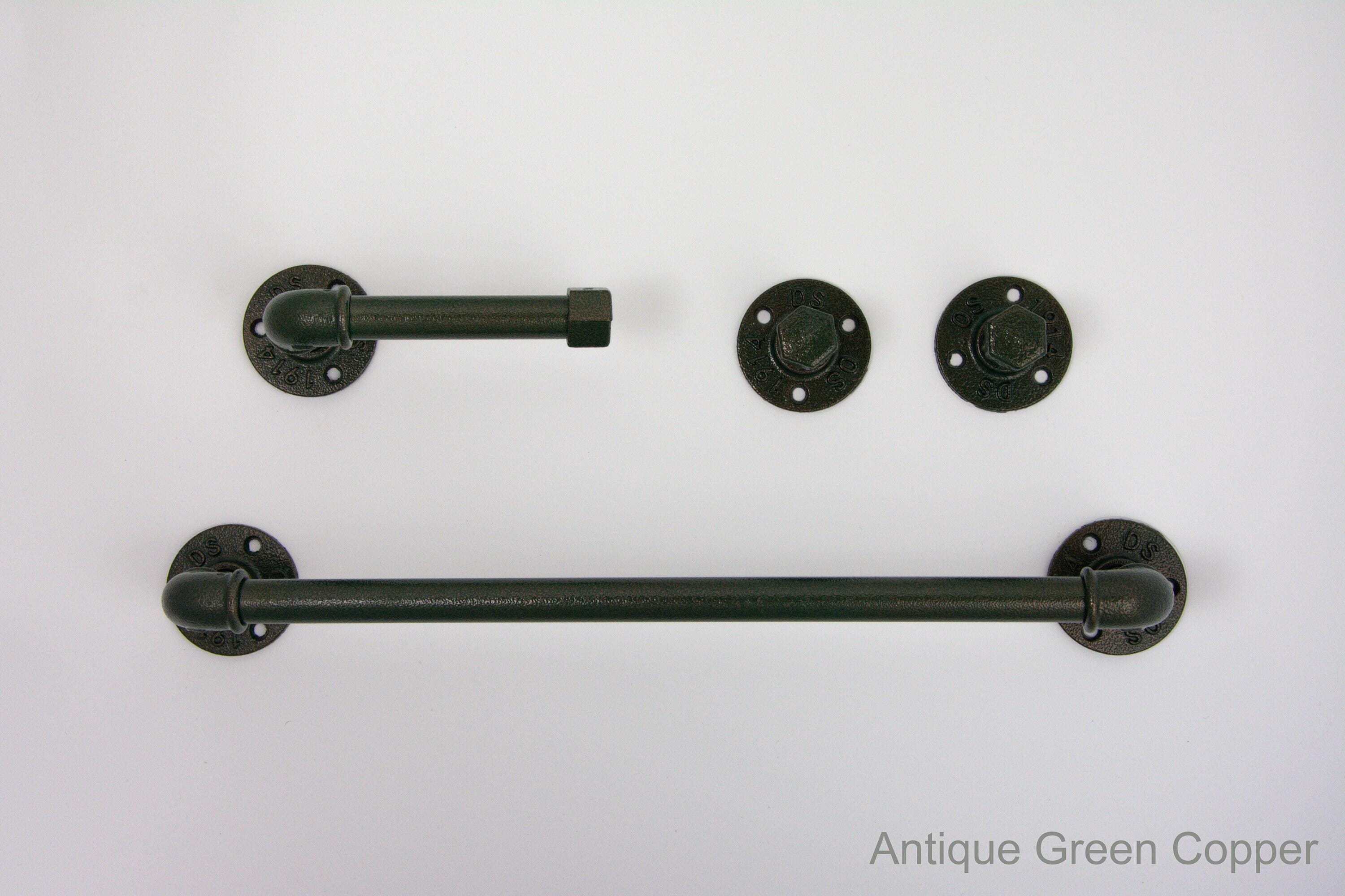 This practical steampunk bathroom set will add charm and sturdiness to any bathroom! These modern bathroom accessories that include a towel rack, two towel hooks, toilet paper holder will be sure to add a unique touch to your washroom. The color of the set in the pictures is Antique Green Copper, however, it can be made in more than 65 colors!