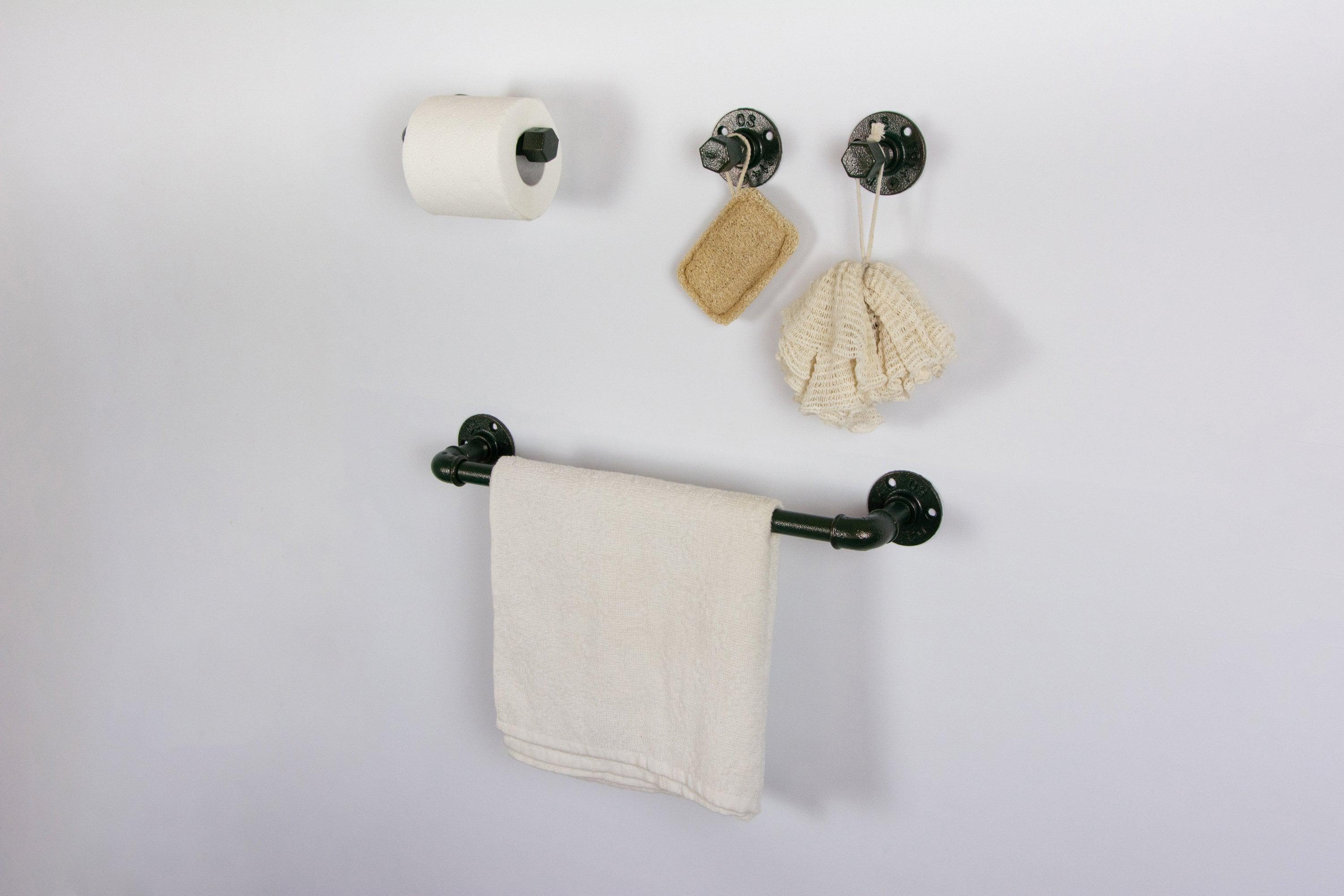 Steampunk Bathroom Accessories 4pcs Set, Includes Towel Rack, Two Towel Hooks, Toilet Paper Holder. Pipe Bathroom Set