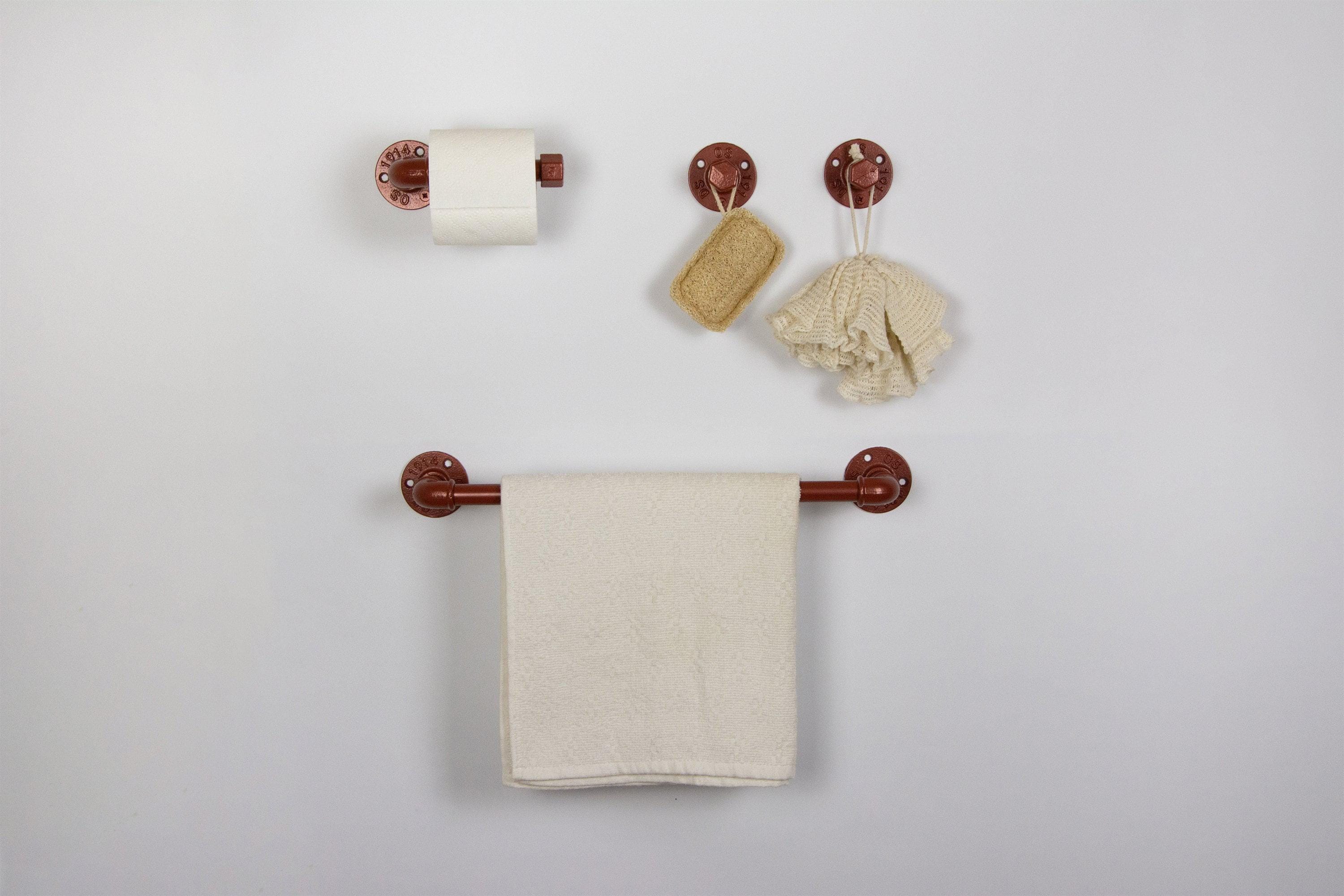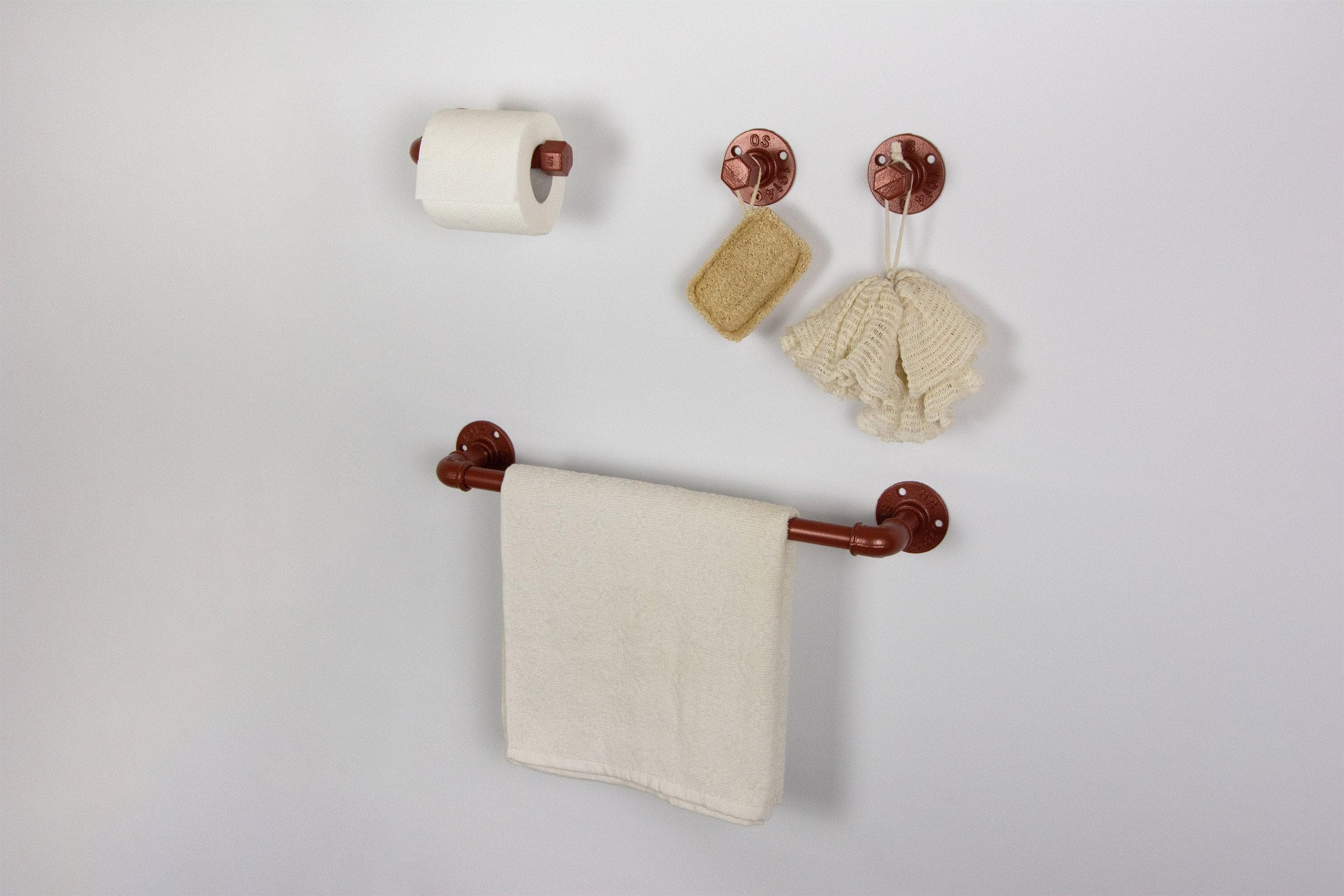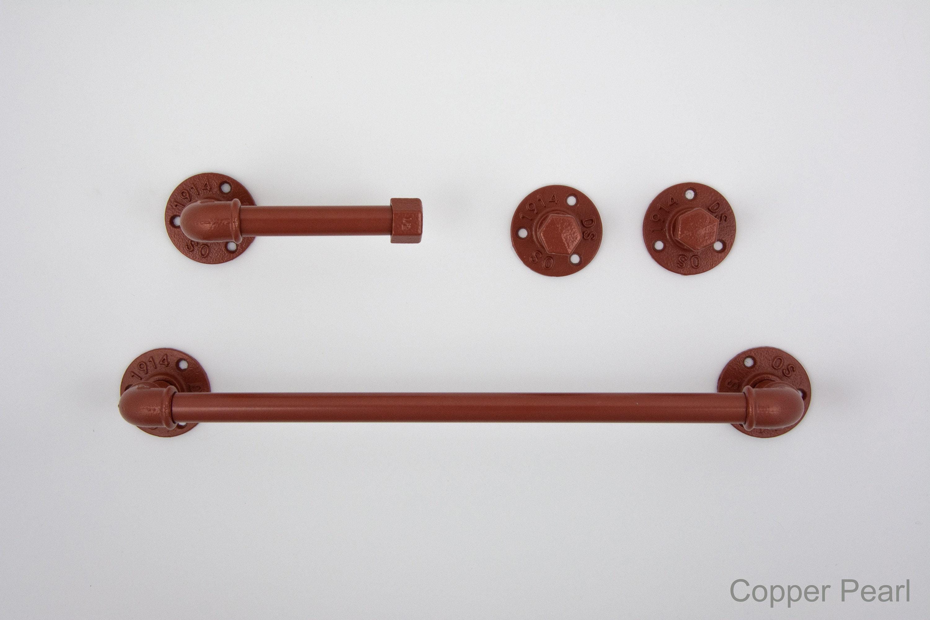 Create your own unique farmhouse bathroom with these pipe bathroom accessories set! This pipe towel rack together with rustic towel hooks will hold your robes and towels while creating an amazing look in your bathroom. The color of the set in the pictures is Copper Pearl, however, it can be made in more than 65 colors!