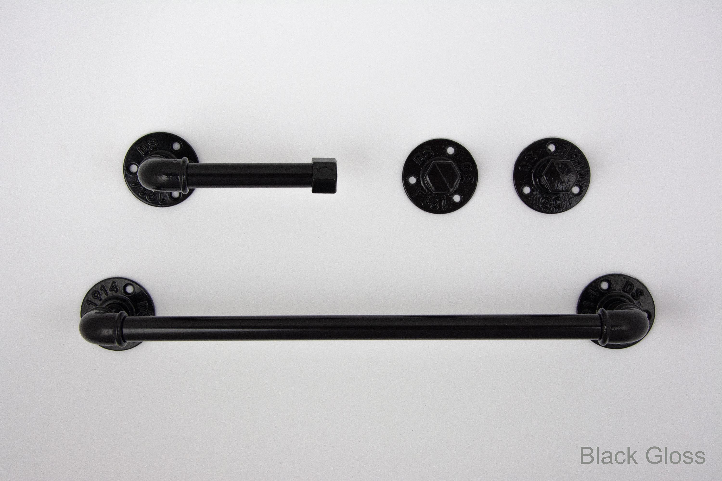 This practical steampunk bathroom set will add charm and sturdiness to any bathroom! These modern bathroom accessories that include a towel rack, two towel hooks, toilet paper holder will be sure to add a unique touch to your washroom. The color of the set in the pictures is Black Gloss, however, it can be made in more than 65 colors!