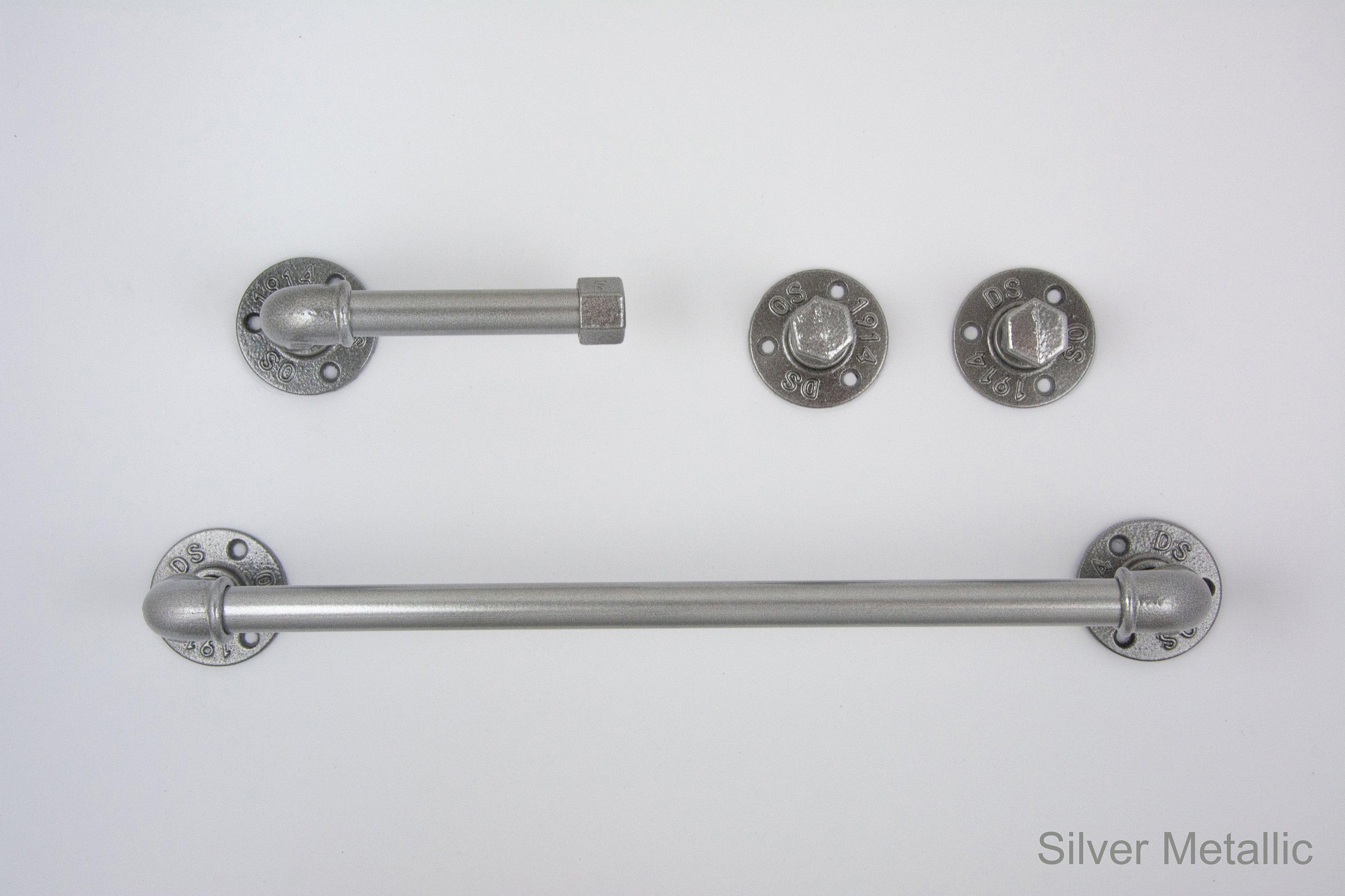 This practical pipe bathroom set will be a beautiful yet functional piece in your home! Use this pipe towel rack, toilet roll holder and wall hooks to keep your home organized. The color of the set in the pictures is Silver Metallic, however, it can be made in more than 65 colors!