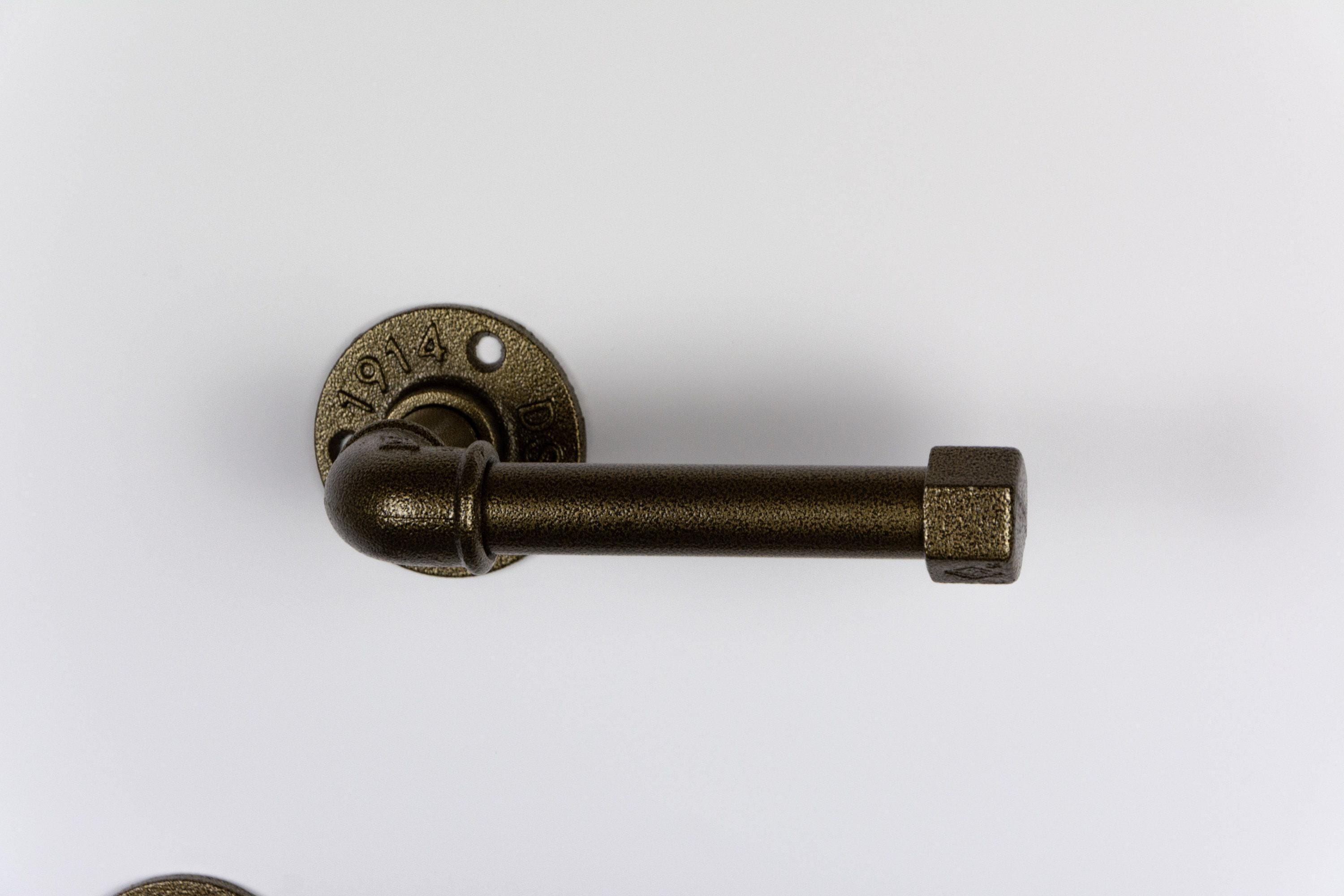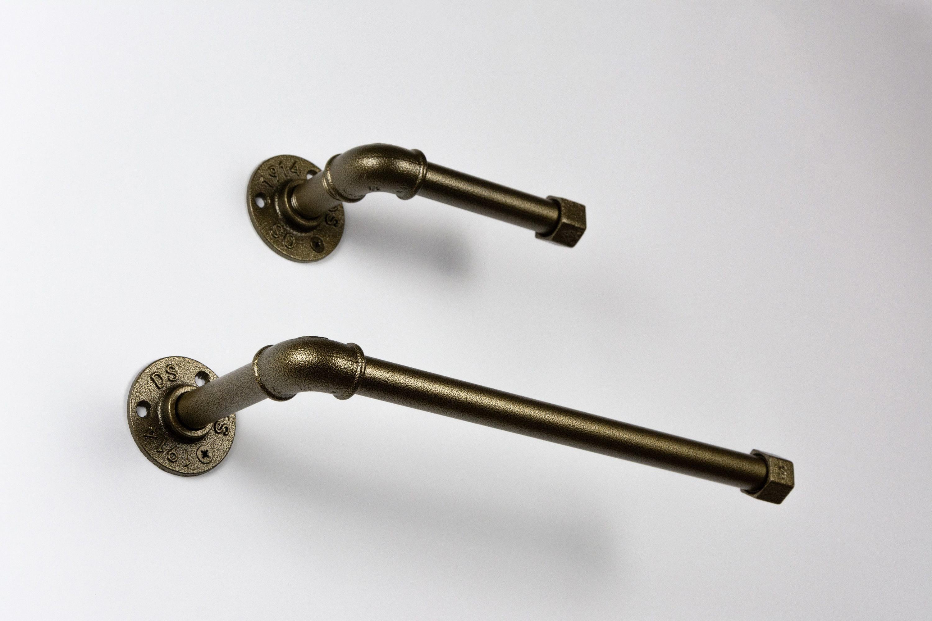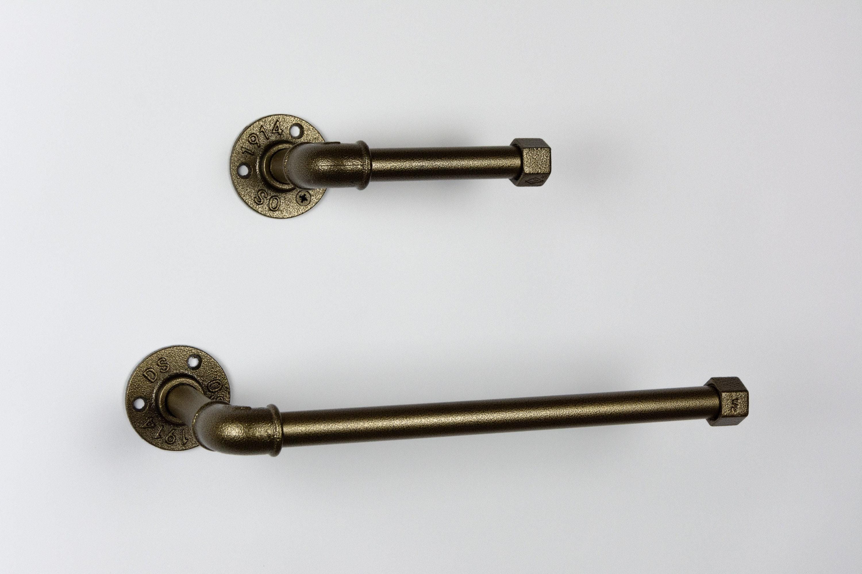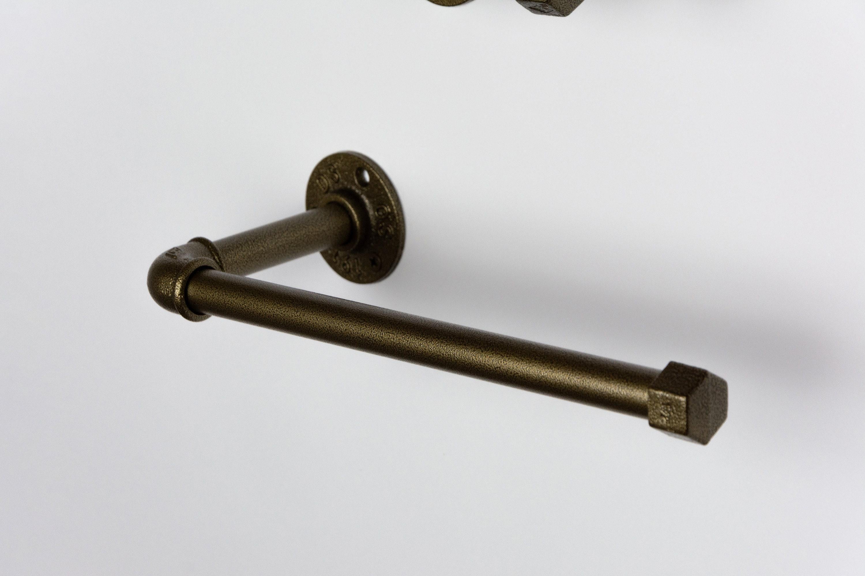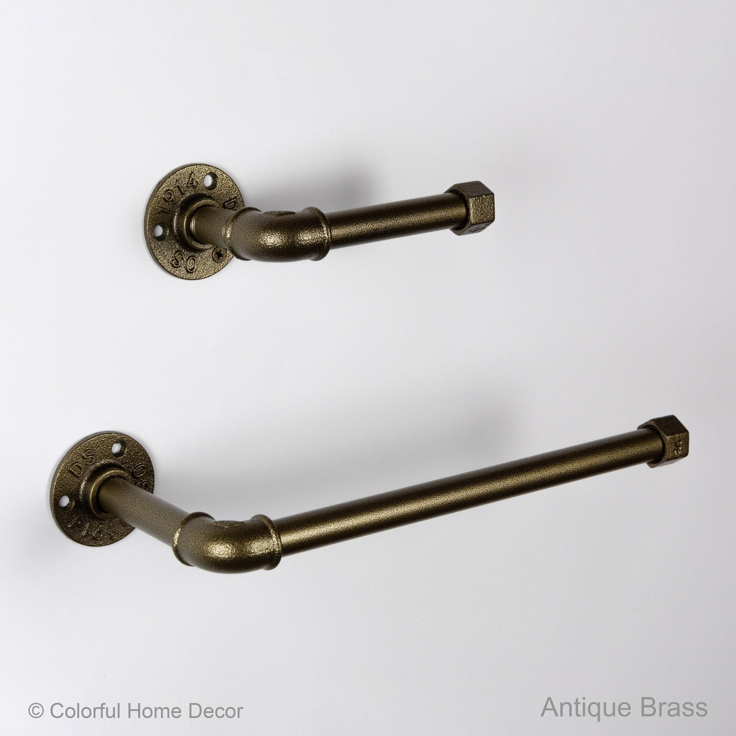 Your own industrial bathroom will look great with a sturdy toilet paper holder piece or towel rack for your restroom! Color in the pictures is antique brass.