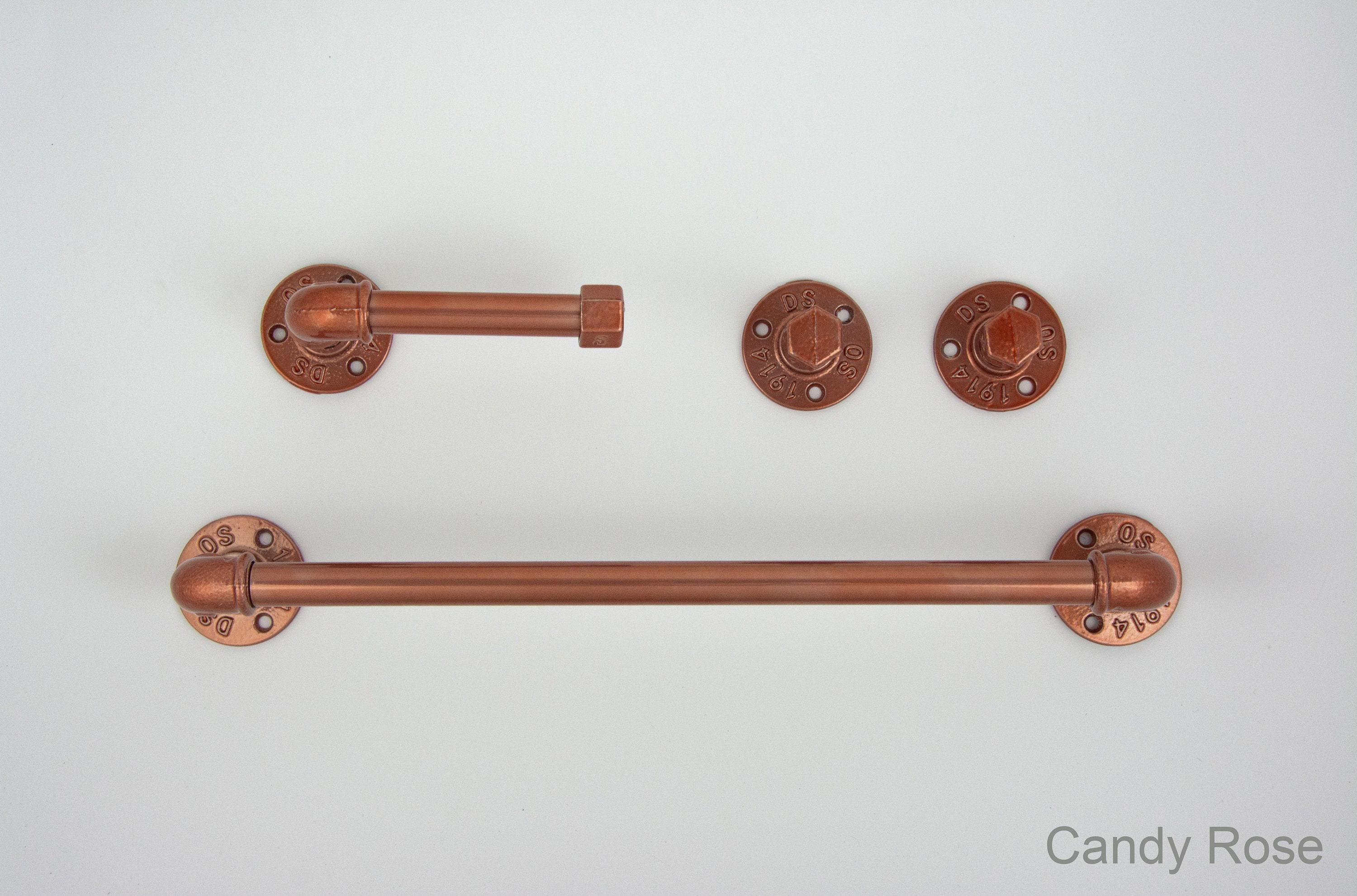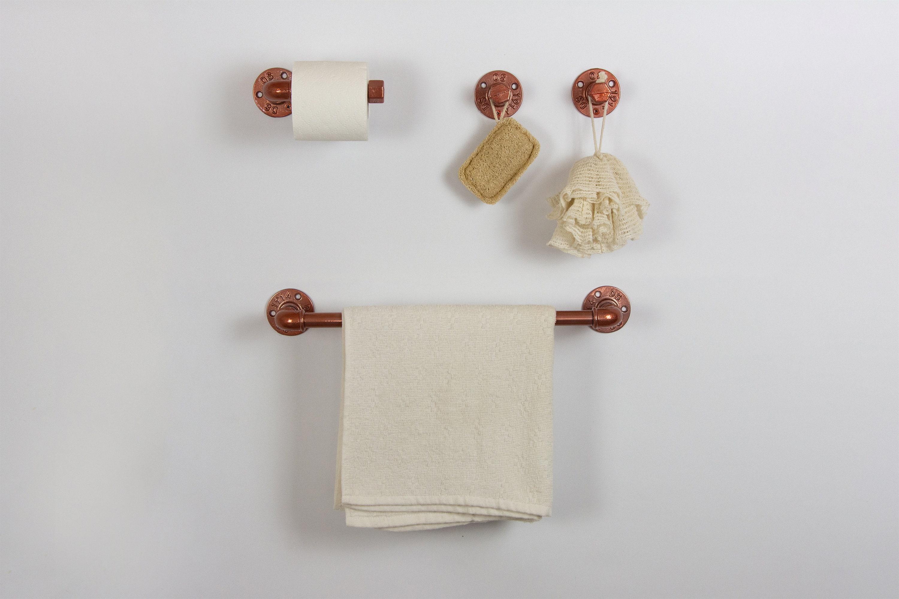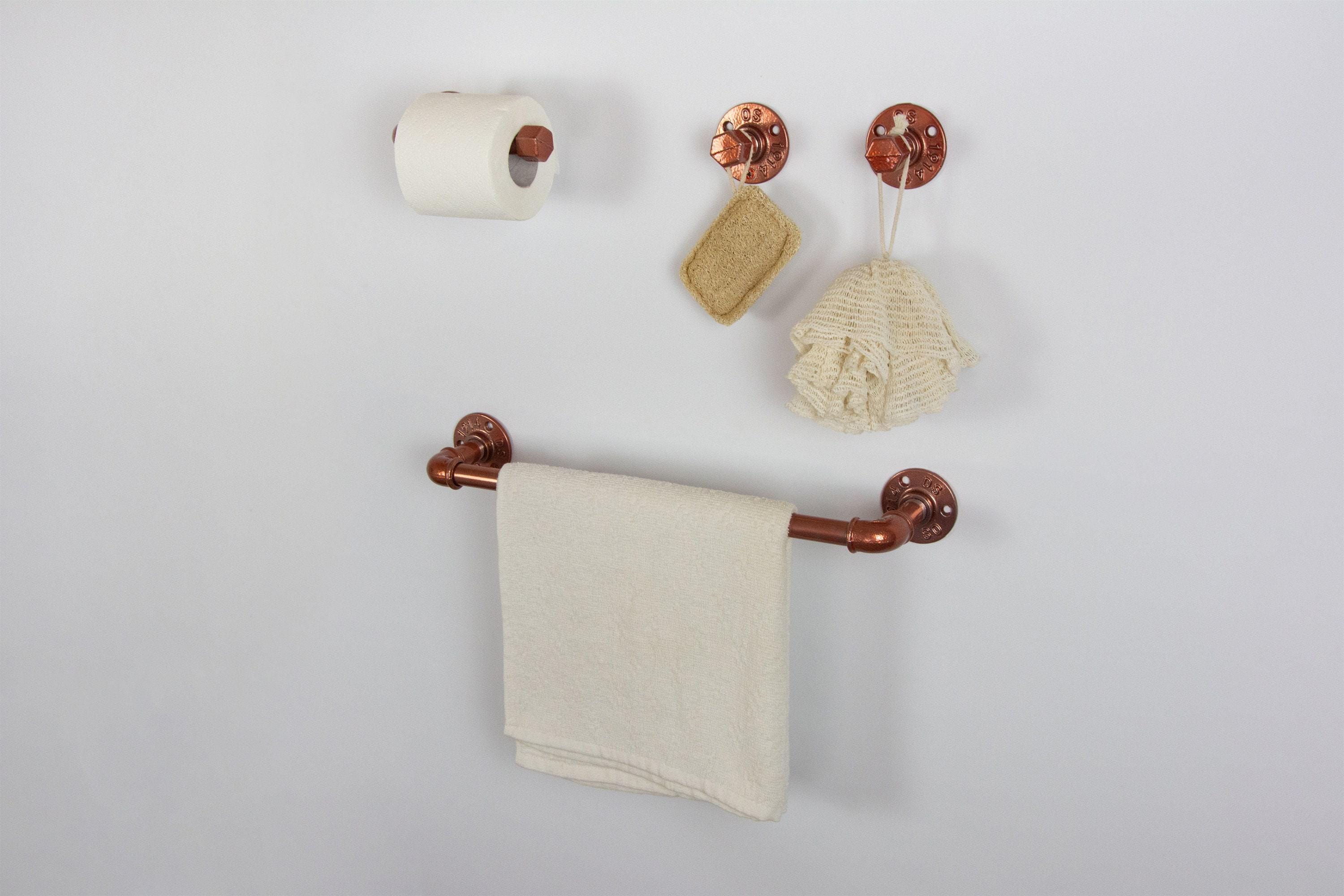 This practical steampunk bathroom set will add charm and sturdiness to any bathroom! These modern bathroom accessories that include a towel rack, two towel hooks, toilet paper holder will be sure to add a unique touch to your washroom. The color of the set in the pictures is Candy Rose, however, it can be made in more than 65 colors!