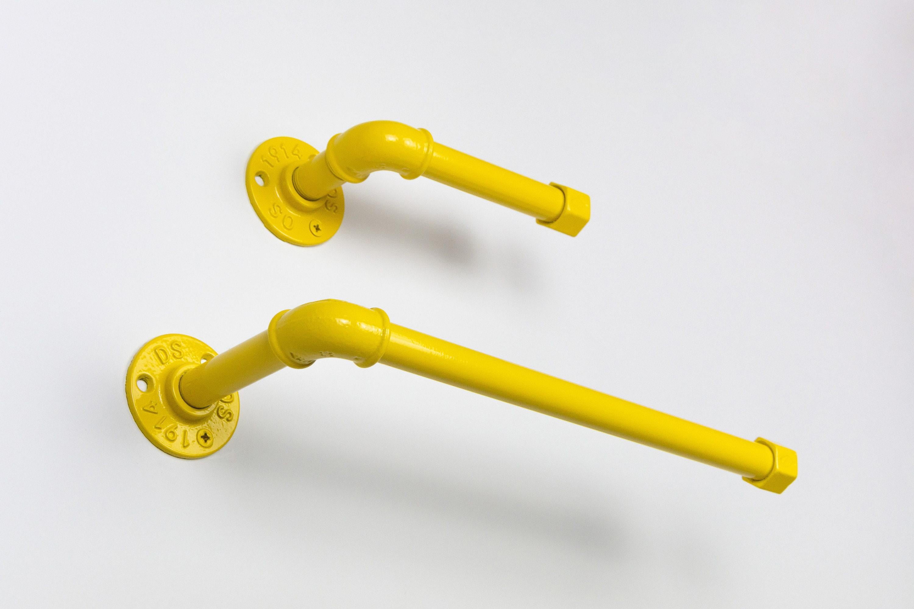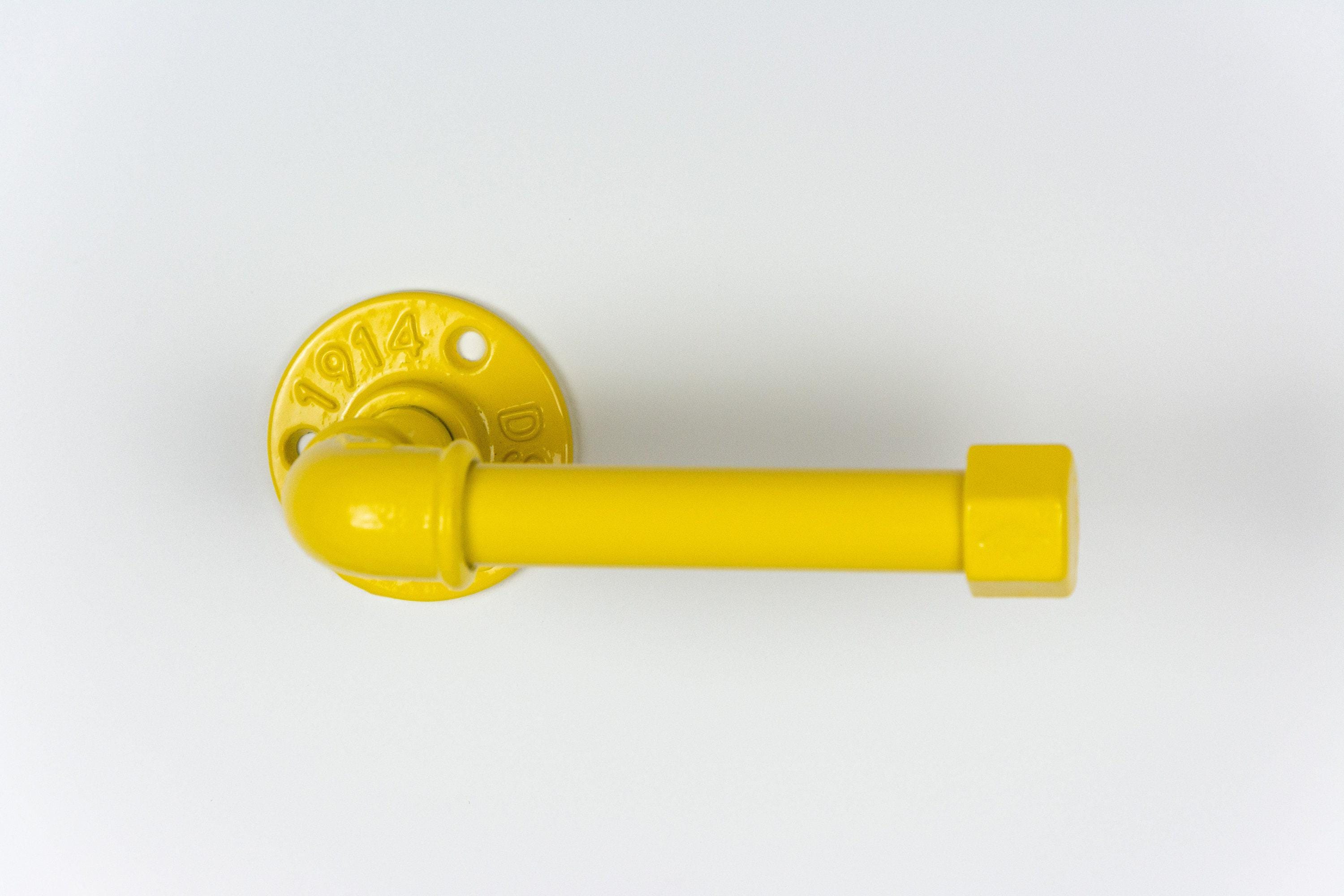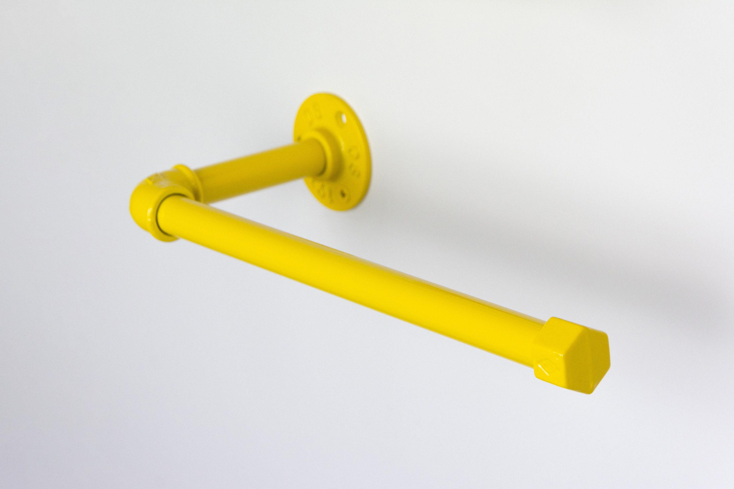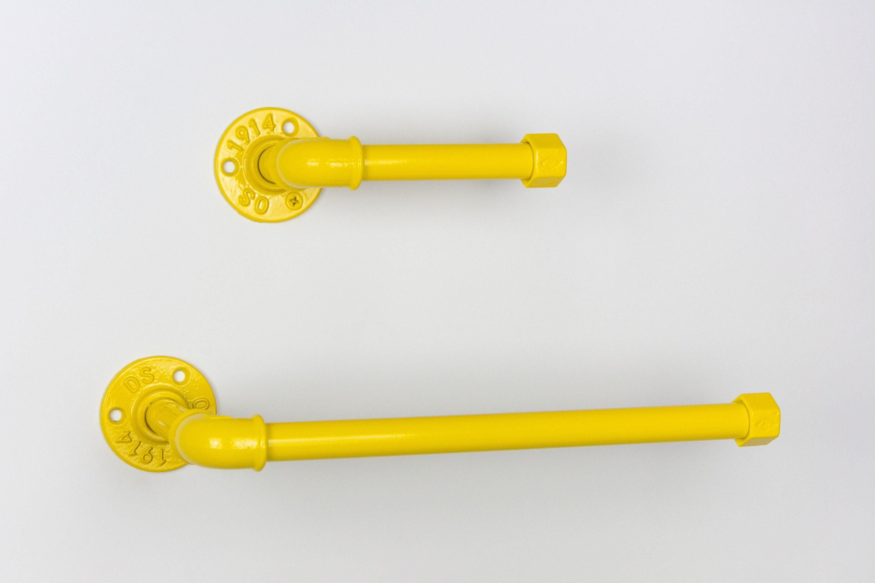 When in need of space saver piece choose from our new industrial bathroom pieces - toilet paper holder and paper towel holder made from pipe! We offer a variety of 60+ color finishes and the color pictured is Yellow Gloss.