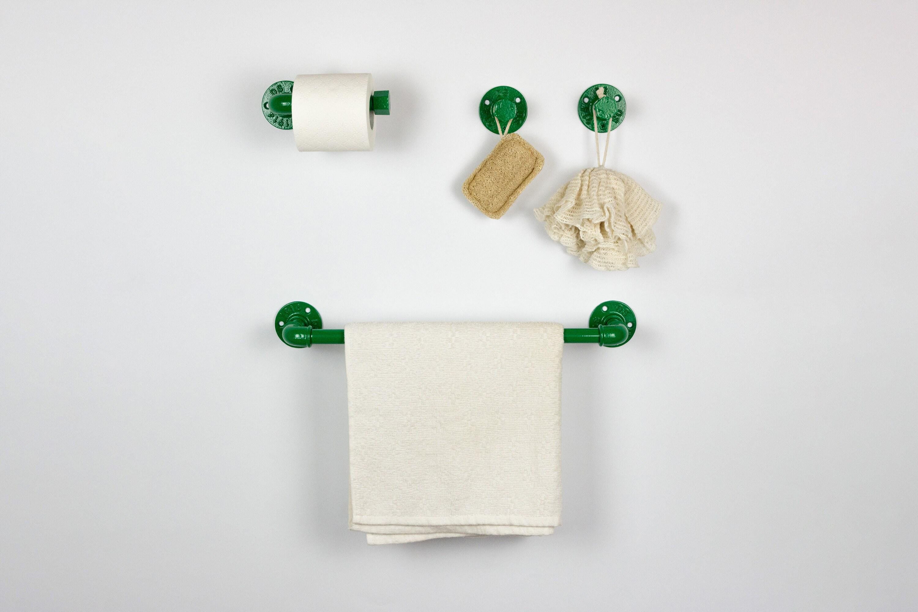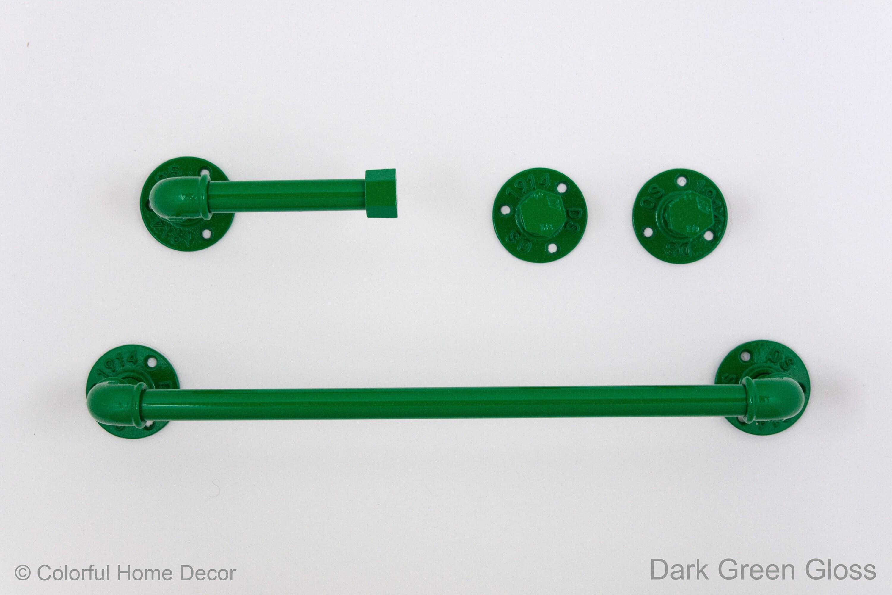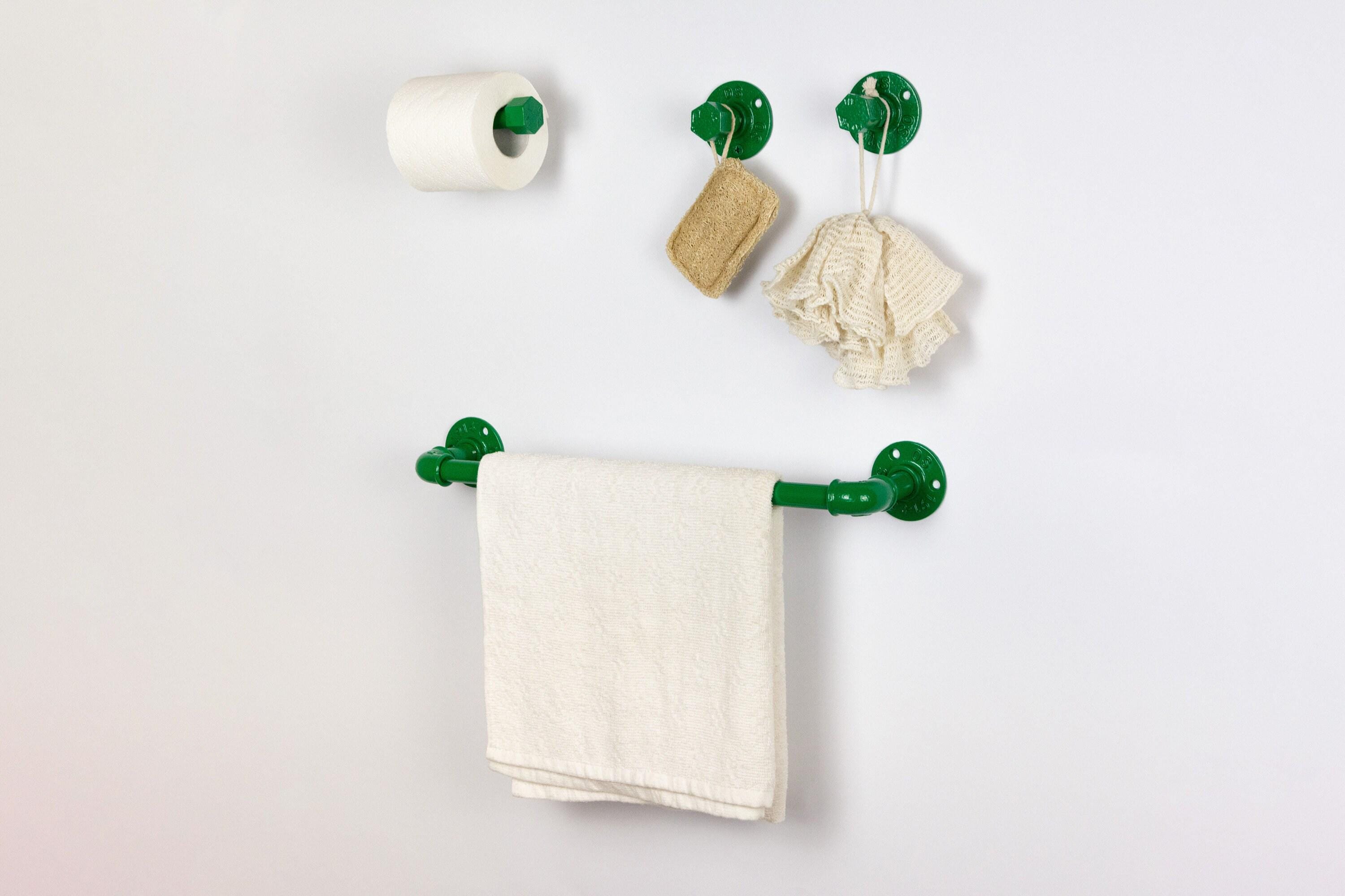 This practical steampunk bathroom set will add charm and sturdiness to any bathroom! These modern bathroom accessories that include a towel rack, two towel hooks, toilet paper holder will be sure to add a unique touch to your washroom. The color of the set in the pictures is Dark Green Gloss, however, it can be made in more than 65 colors!