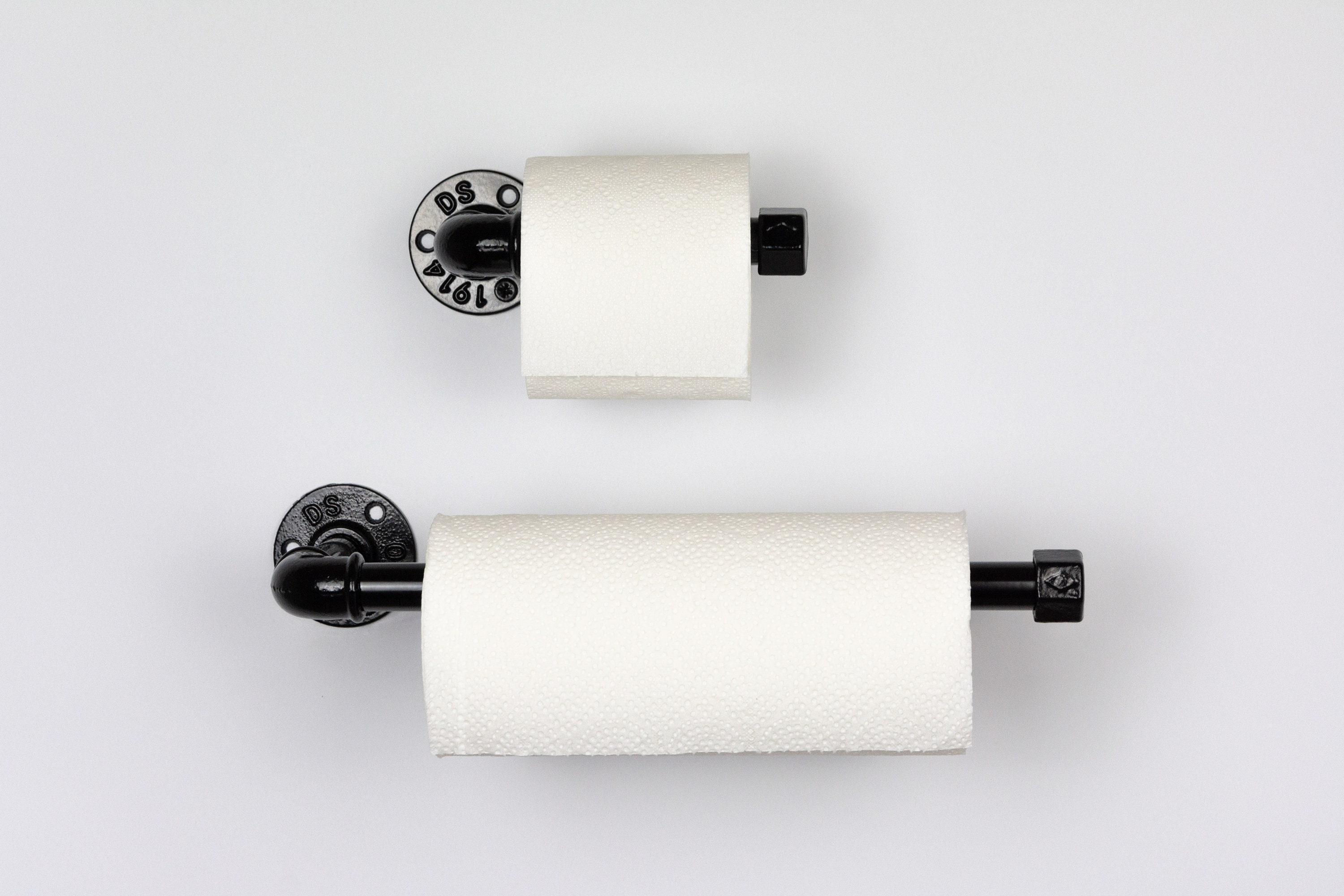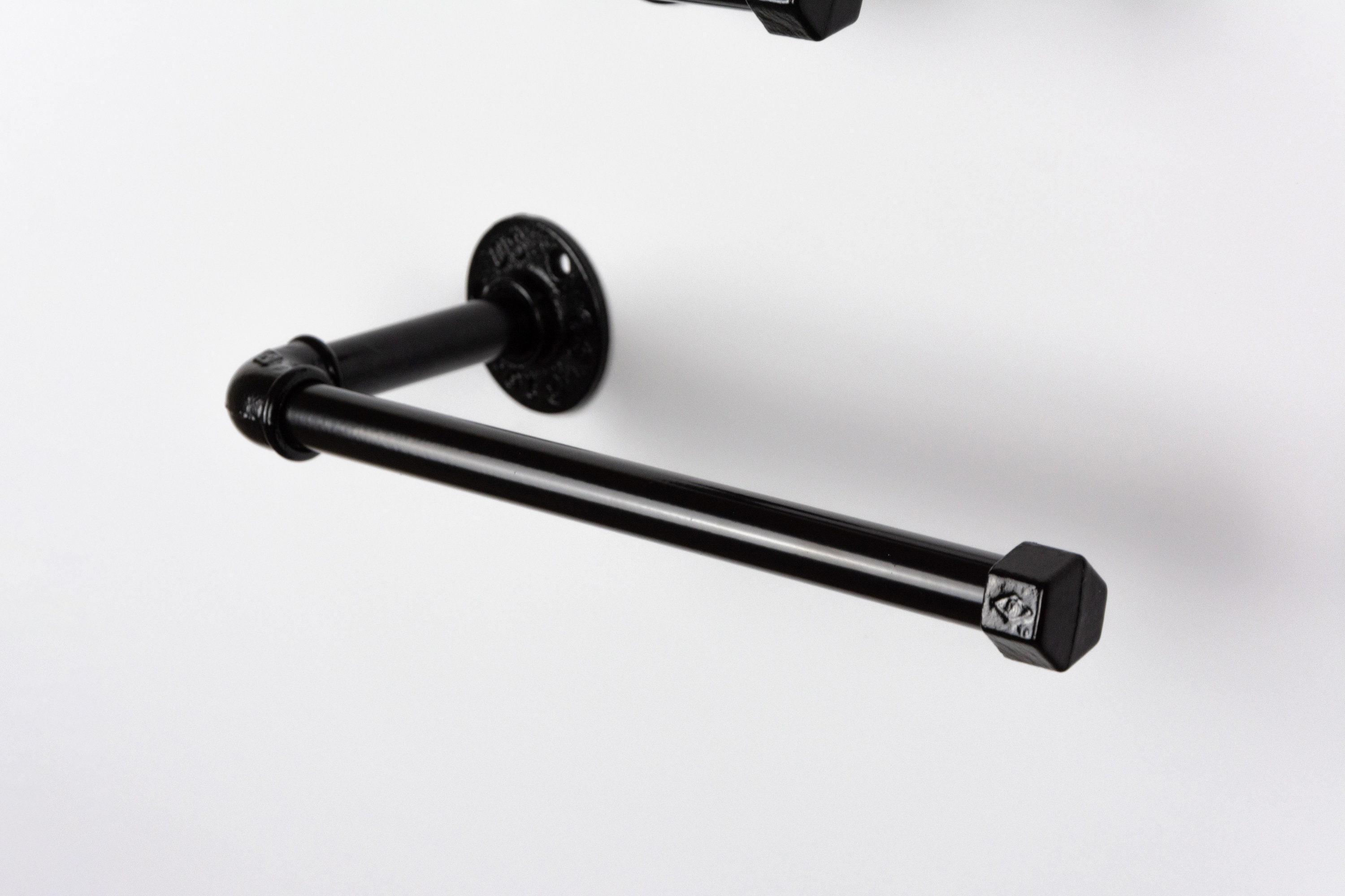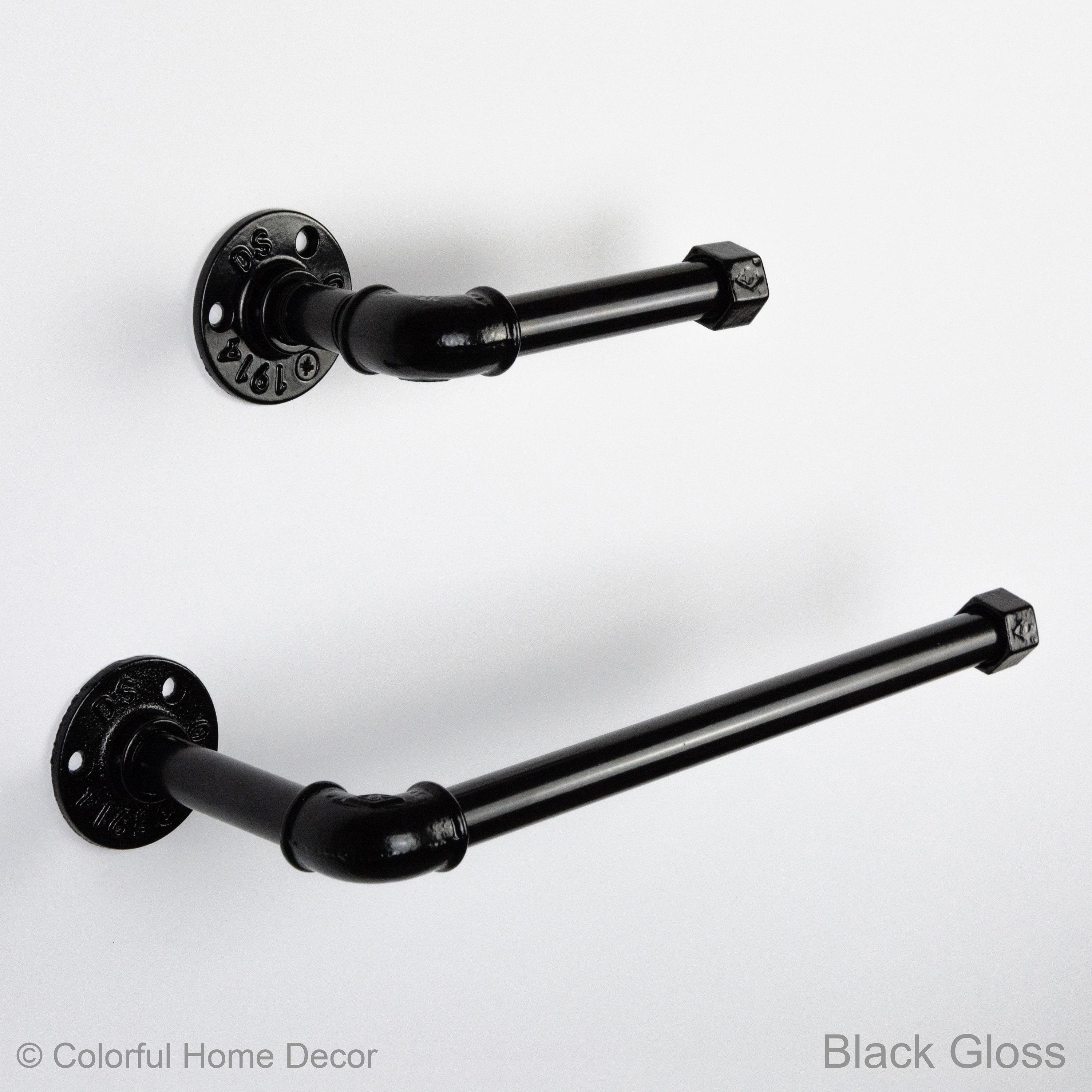 Does your toilet paper or paper towels have no hanging place in your home? Solve this problem with ease by using rustic home decor pieces like toilet paper holder or paper towel holder made from pipe! They can come in more than 60+ color finishes and the color pictured here is Black Gloss .