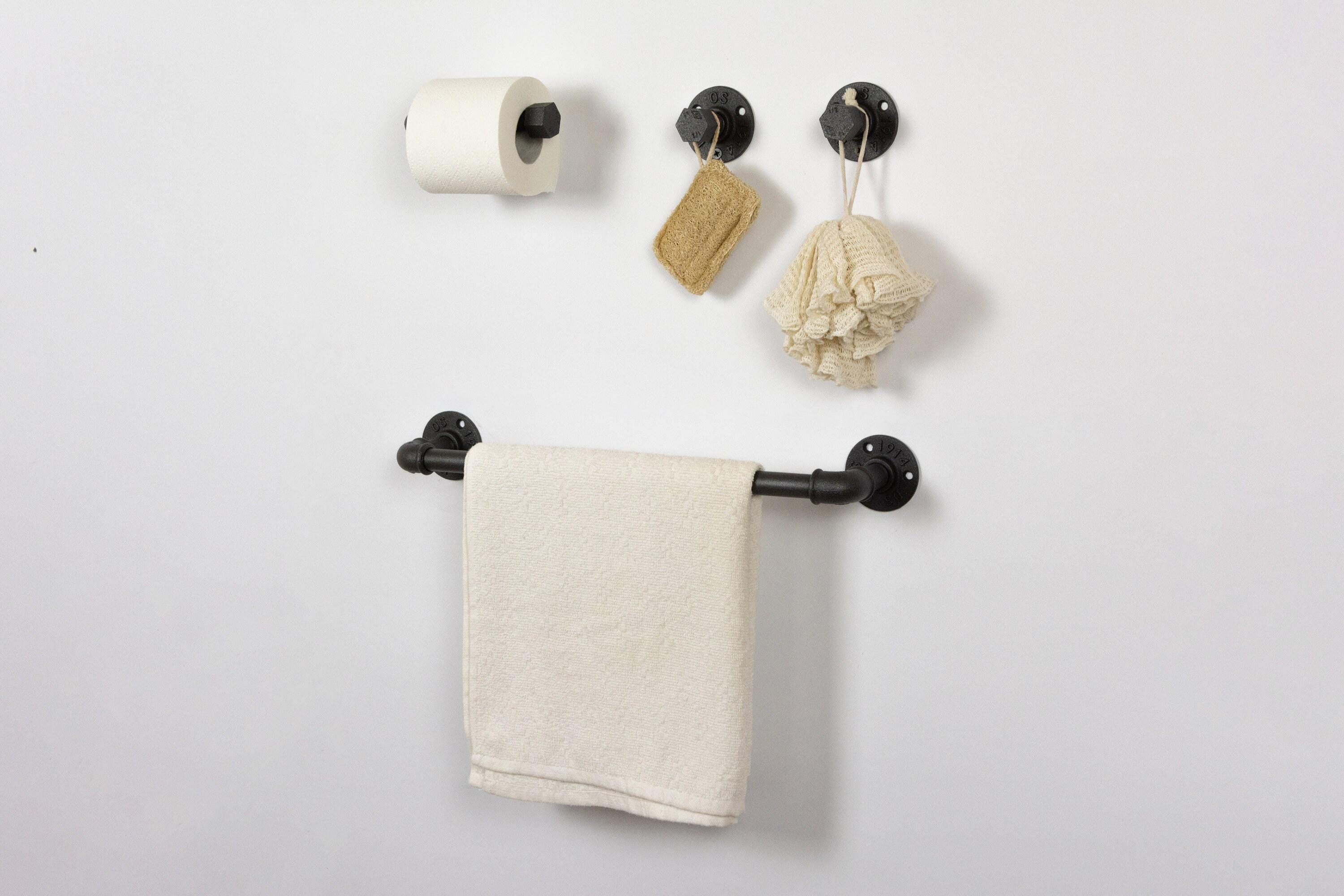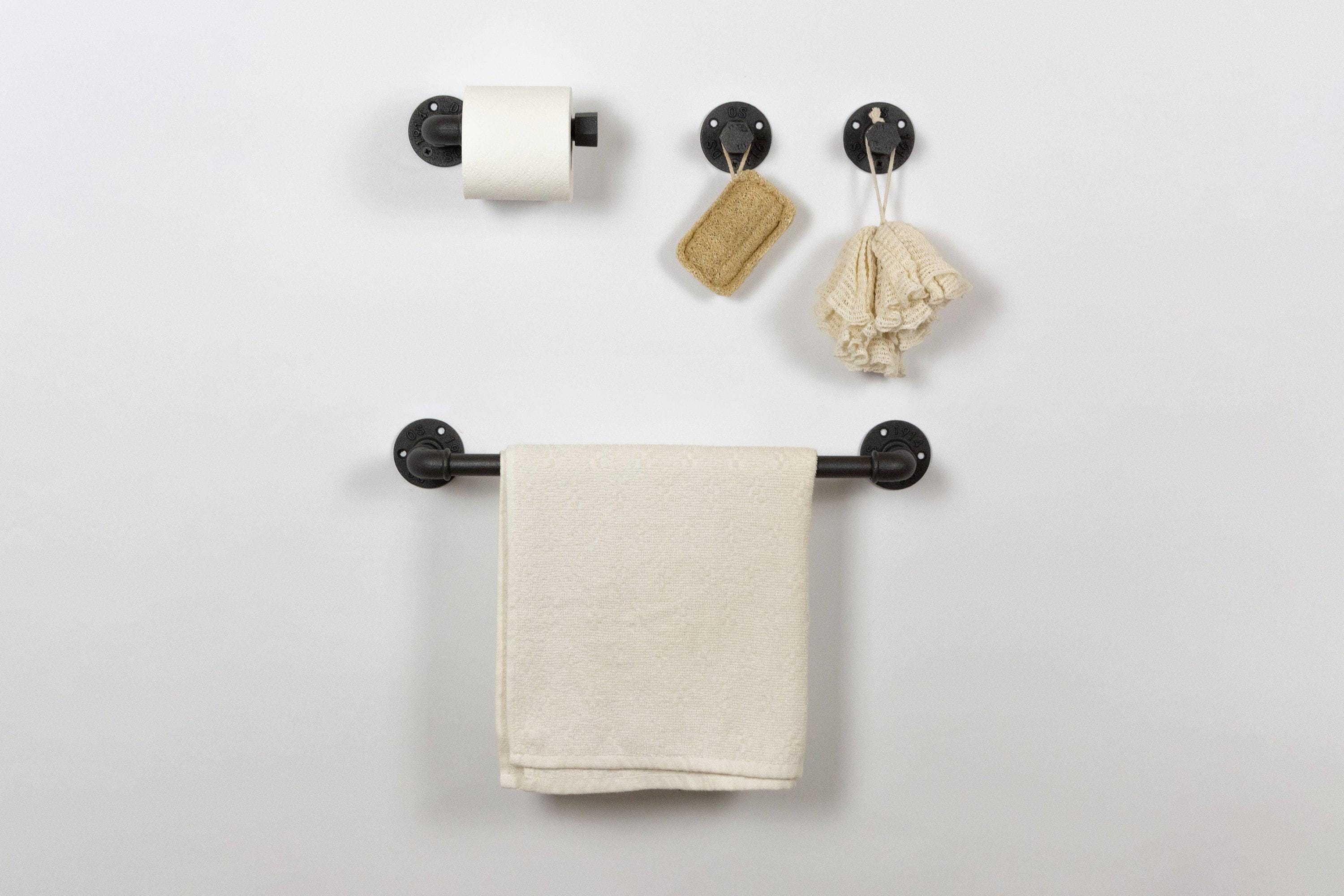Steampunk Bathroom Accessories 4pcs Set, Includes Towel Rack, Two Towel Hooks, Toilet Paper Holder. Pipe Bathroom Set