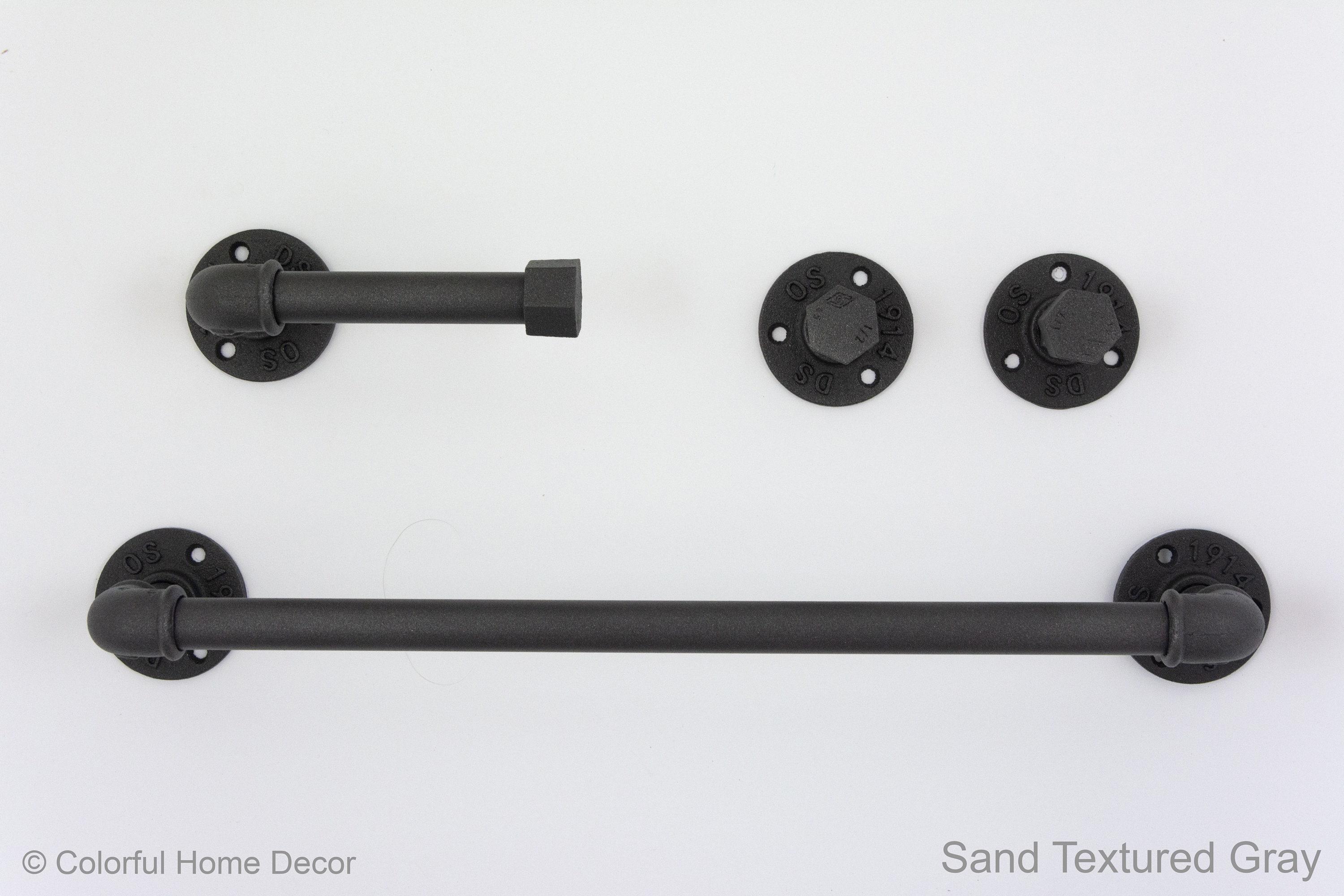This practical steampunk bathroom set will add charm and sturdiness to any bathroom! These modern bathroom accessories that include a towel rack, two towel hooks, toilet paper holder will be sure to add a unique touch to your washroom. The color of the set in the pictures is Sand Textured Gray, however, it can be made in more than 65 colors!