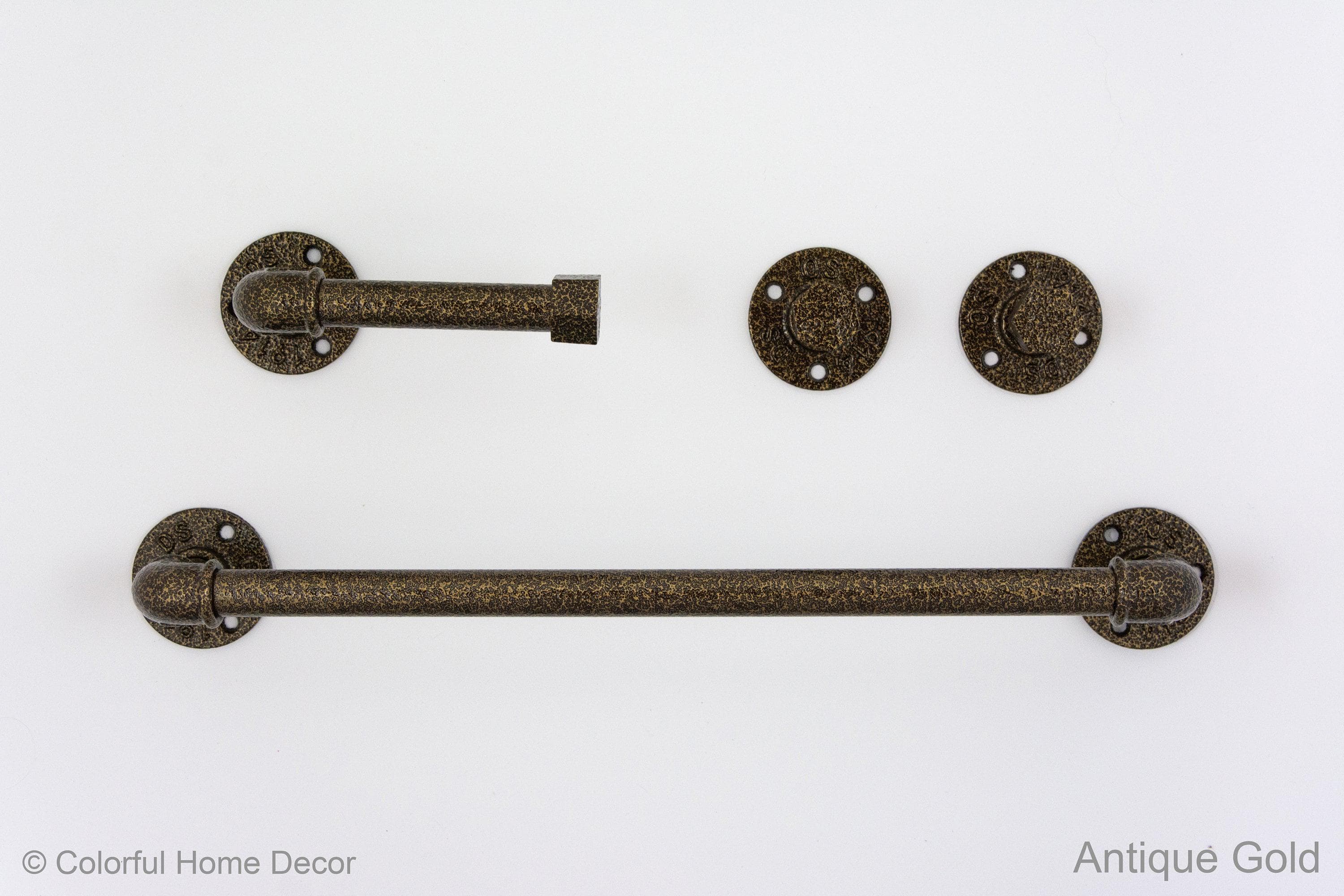 This practical pipe bathroom set will be a beautiful yet functional piece in your home! Use this pipe towel rack, toilet roll holder and wall hooks to keep your home organized. The color of the set in the pictures is Antique Gold, however, it can be made in more than 65 colors!