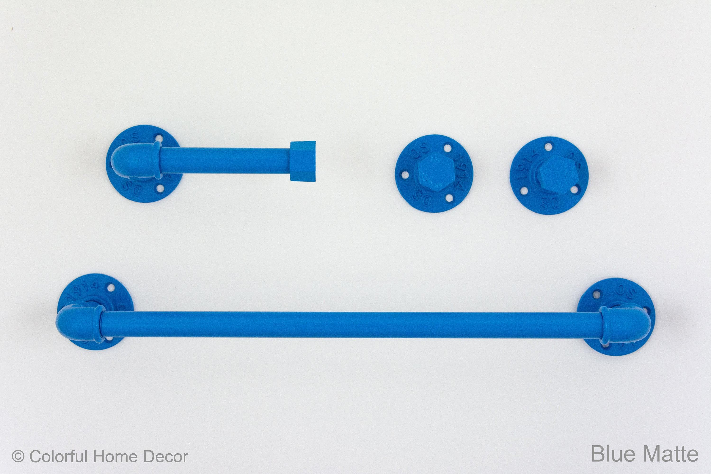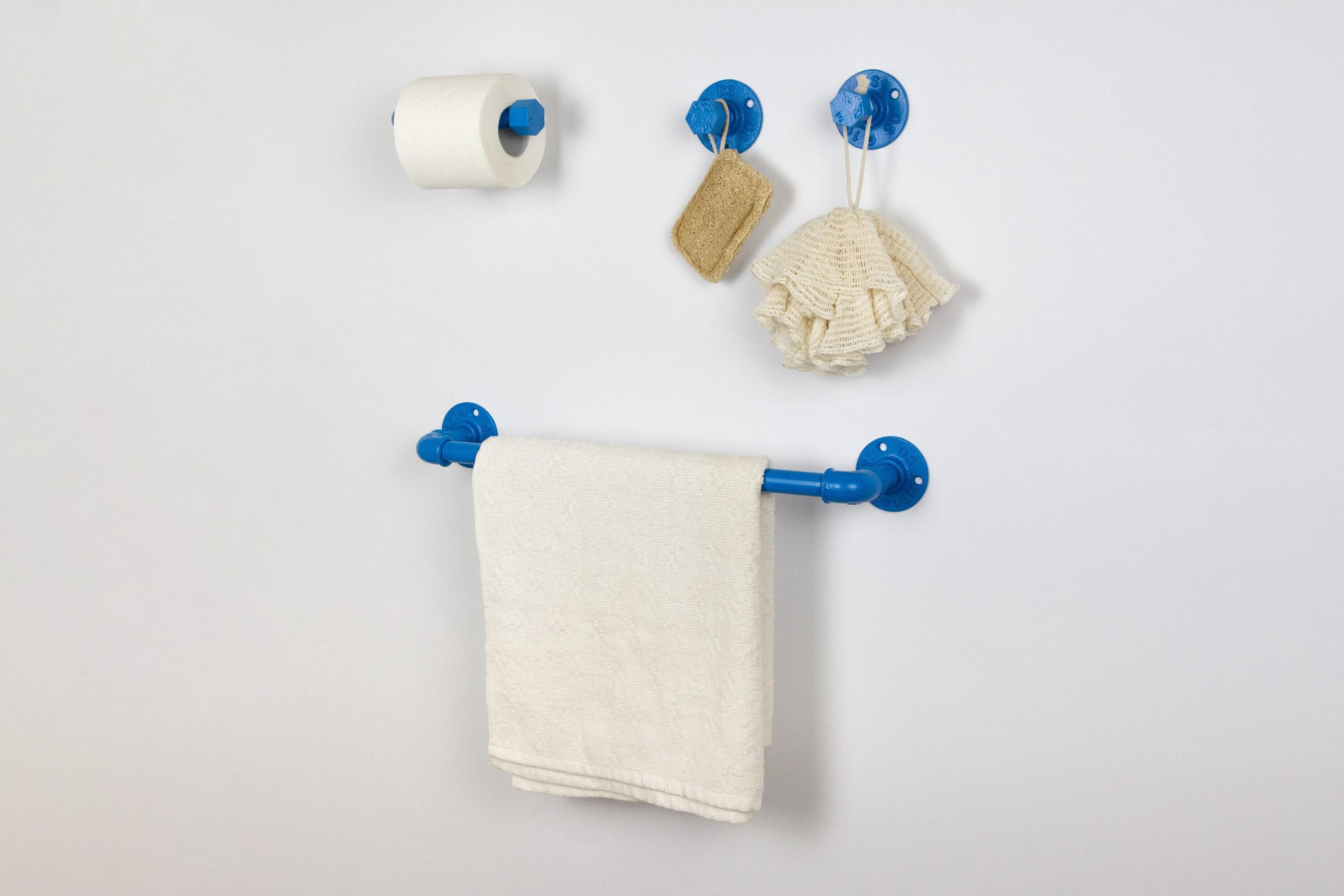 Create your own unique farmhouse bathroom with these pipe bathroom accessories set! This pipe towel rack together with rustic towel hooks will hold your robes and towels while creating an amazing look in your bathroom. The color of the set in the pictures is Blue Matte, however, it can be made in more than 65 colors!