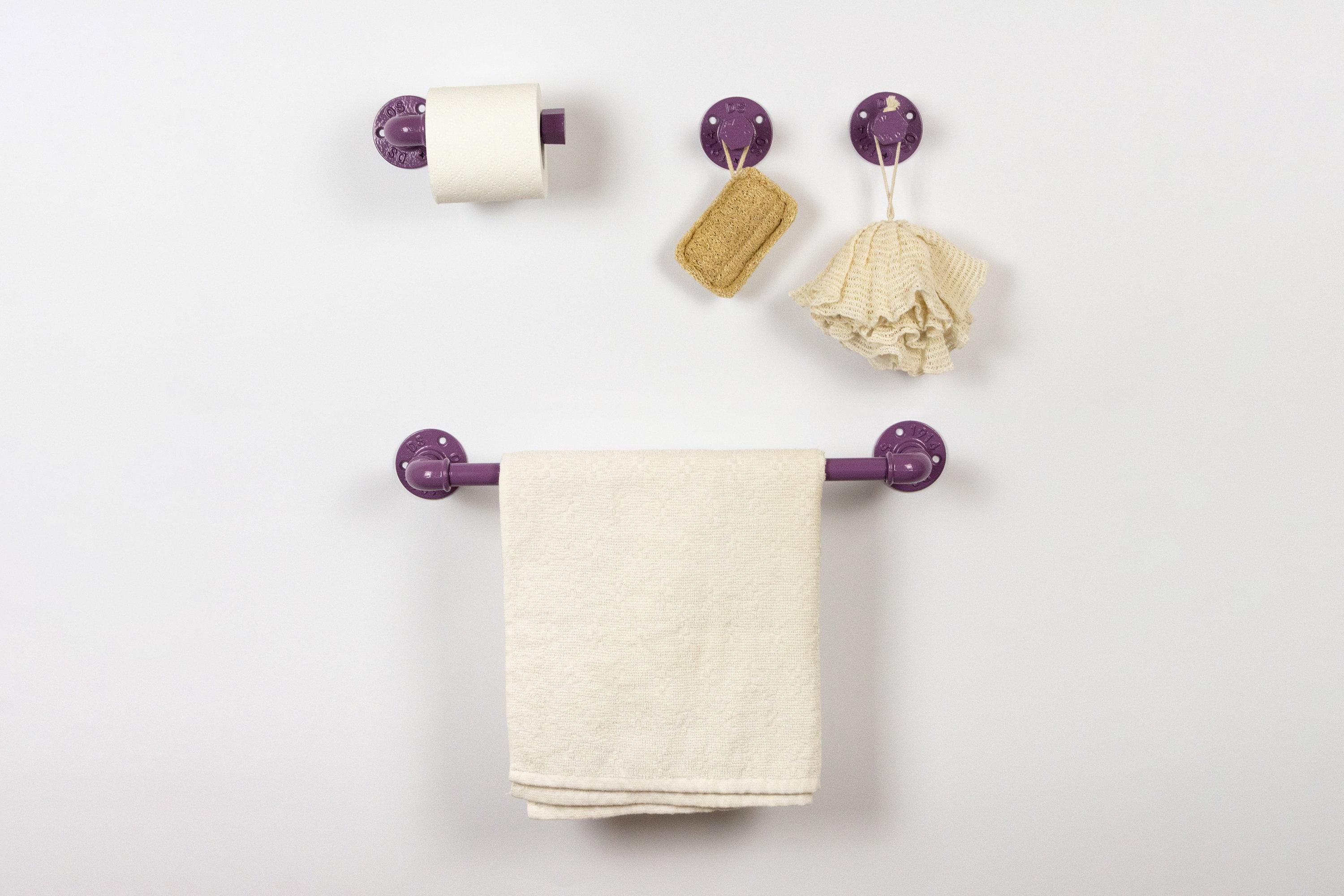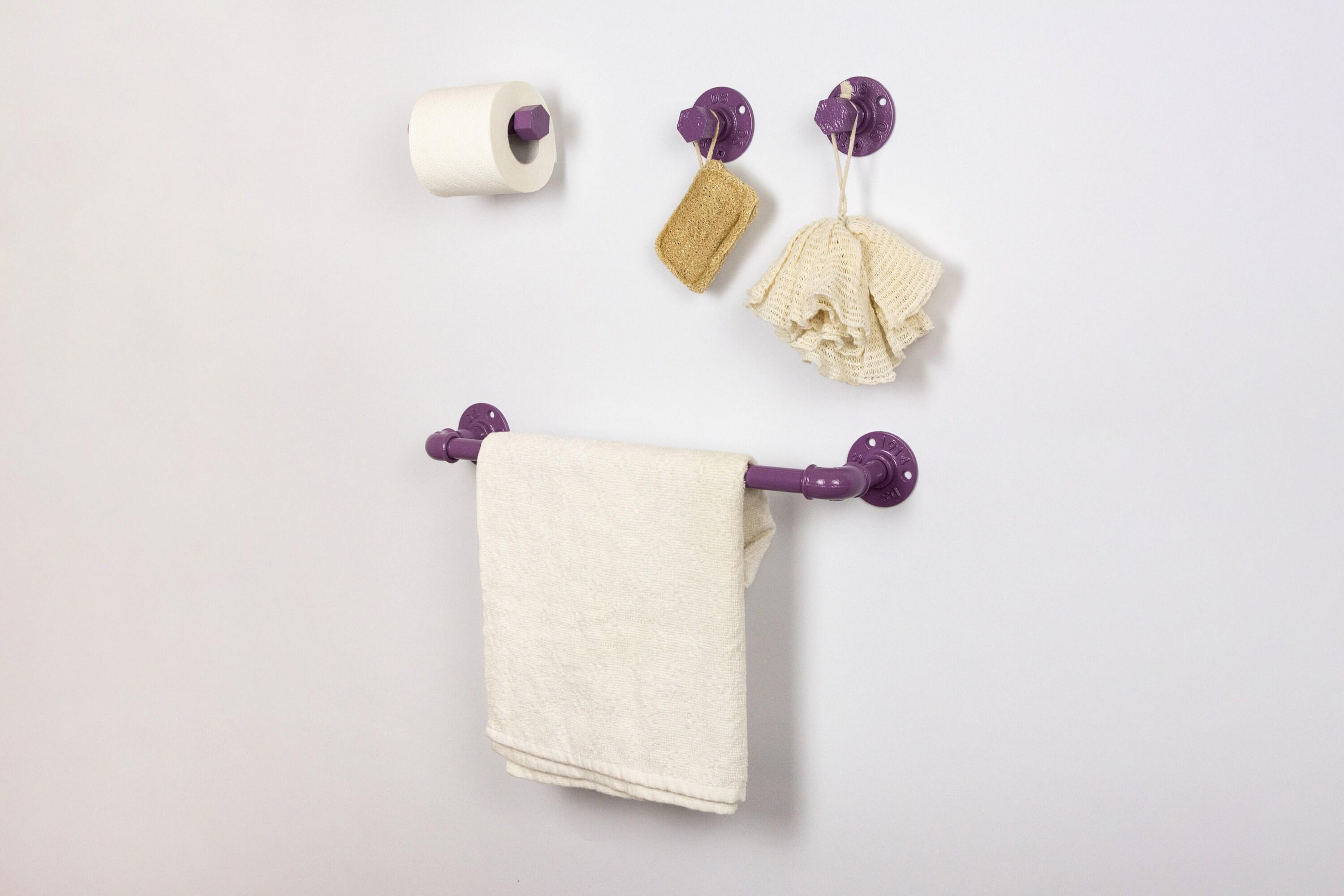 This practical pipe bathroom set will be a beautiful yet functional piece in your home! Use this pipe towel rack, toilet roll holder and wall hooks to keep your home organized. The color of the set in the pictures is Violet, however, it can be made in more than 65 colors!