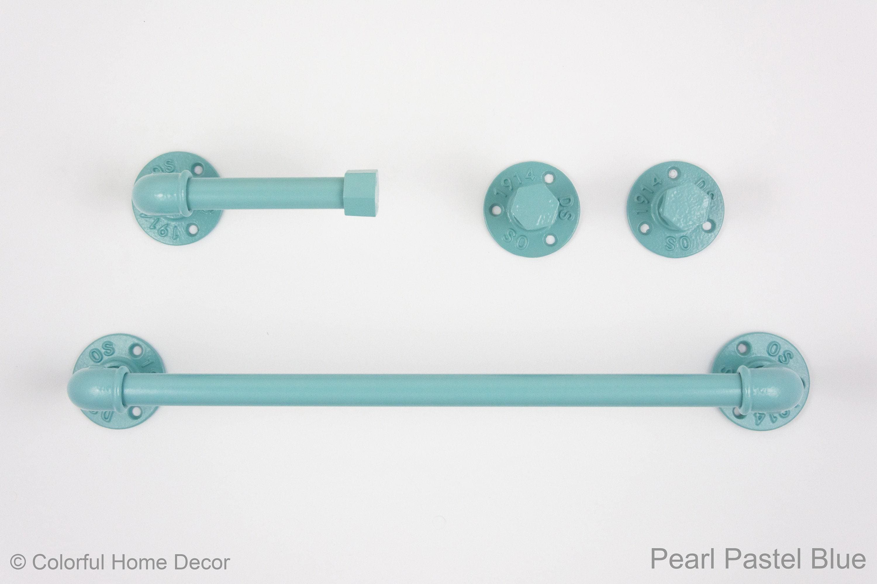 This practical steampunk bathroom set will add charm and sturdiness to any bathroom! These modern bathroom accessories that include a towel rack, two towel hooks, toilet paper holder will be sure to add a unique touch to your washroom. The color of the set in the pictures is Pearl Pastel Blue, however, it can be made in more than 65 colors!