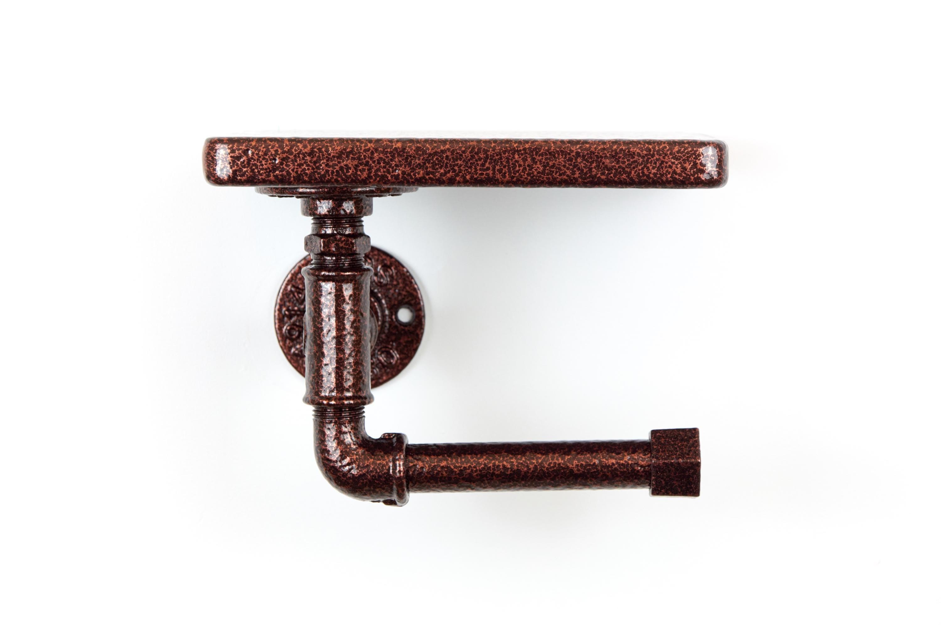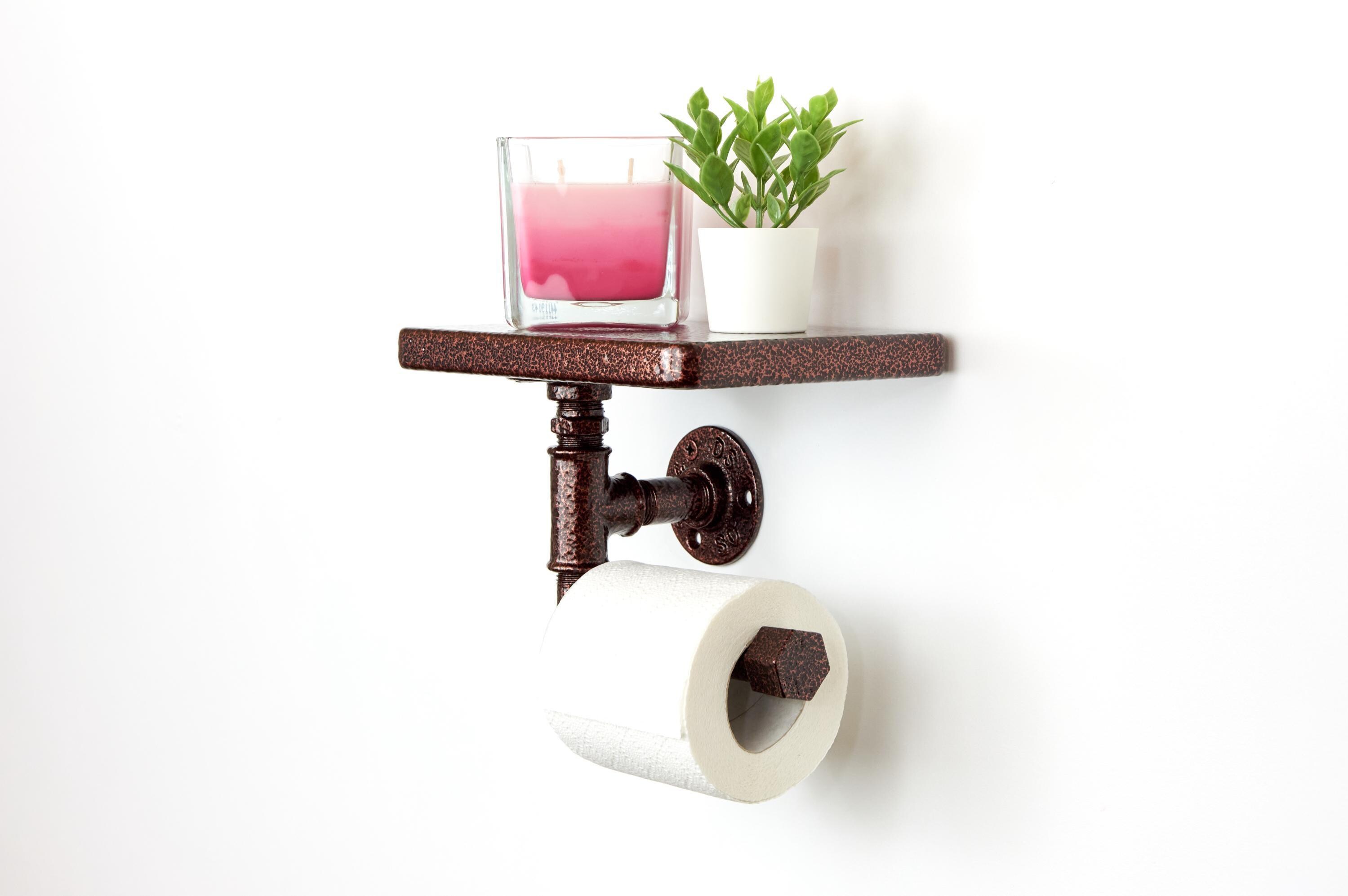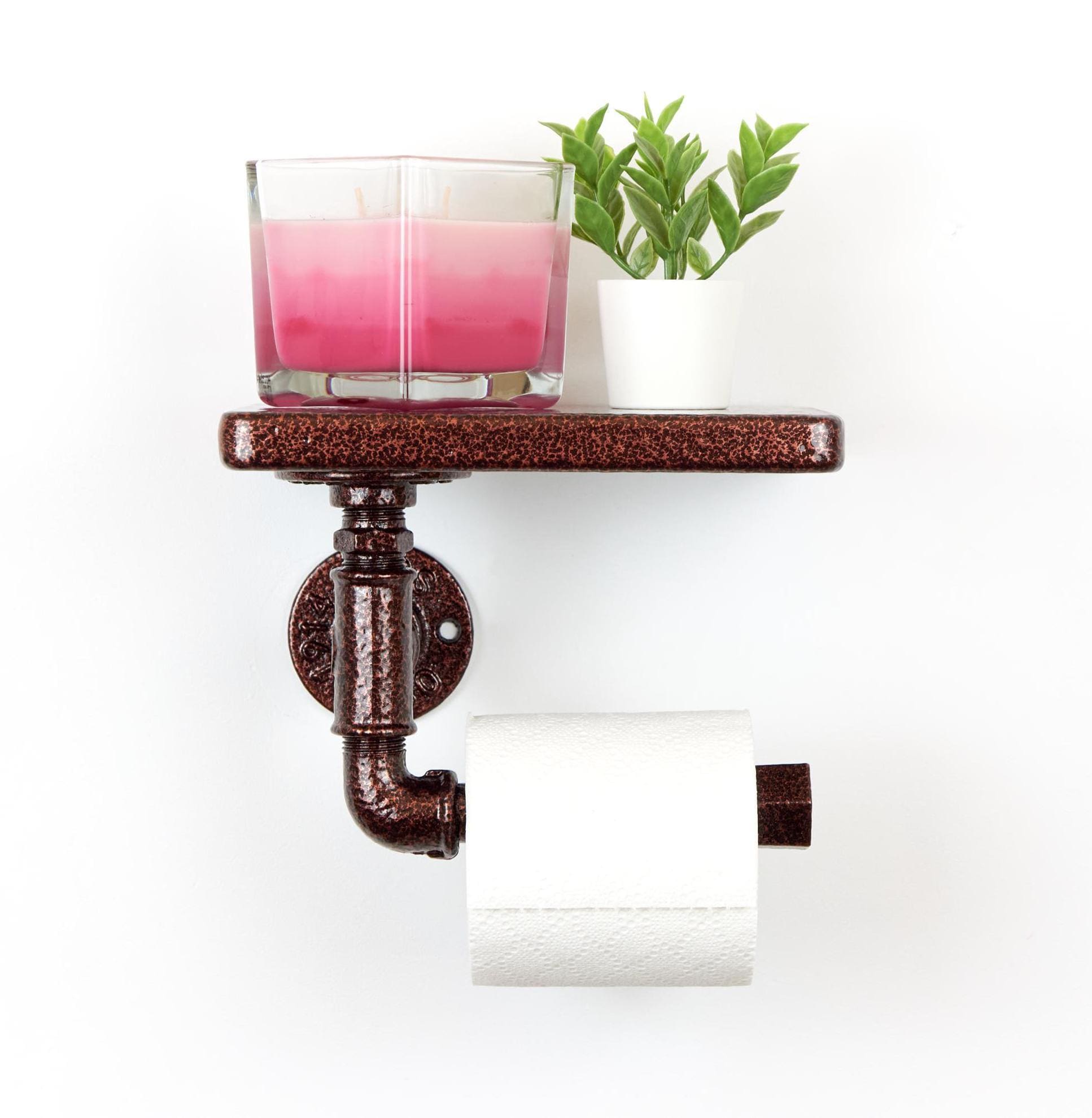 Bring rustic charm to your bathroom with this toilet paper roll holder with a shelf. A perfect farmhouse decor piece for stylish organization! The color of the product in the pictures is Antique Copper.