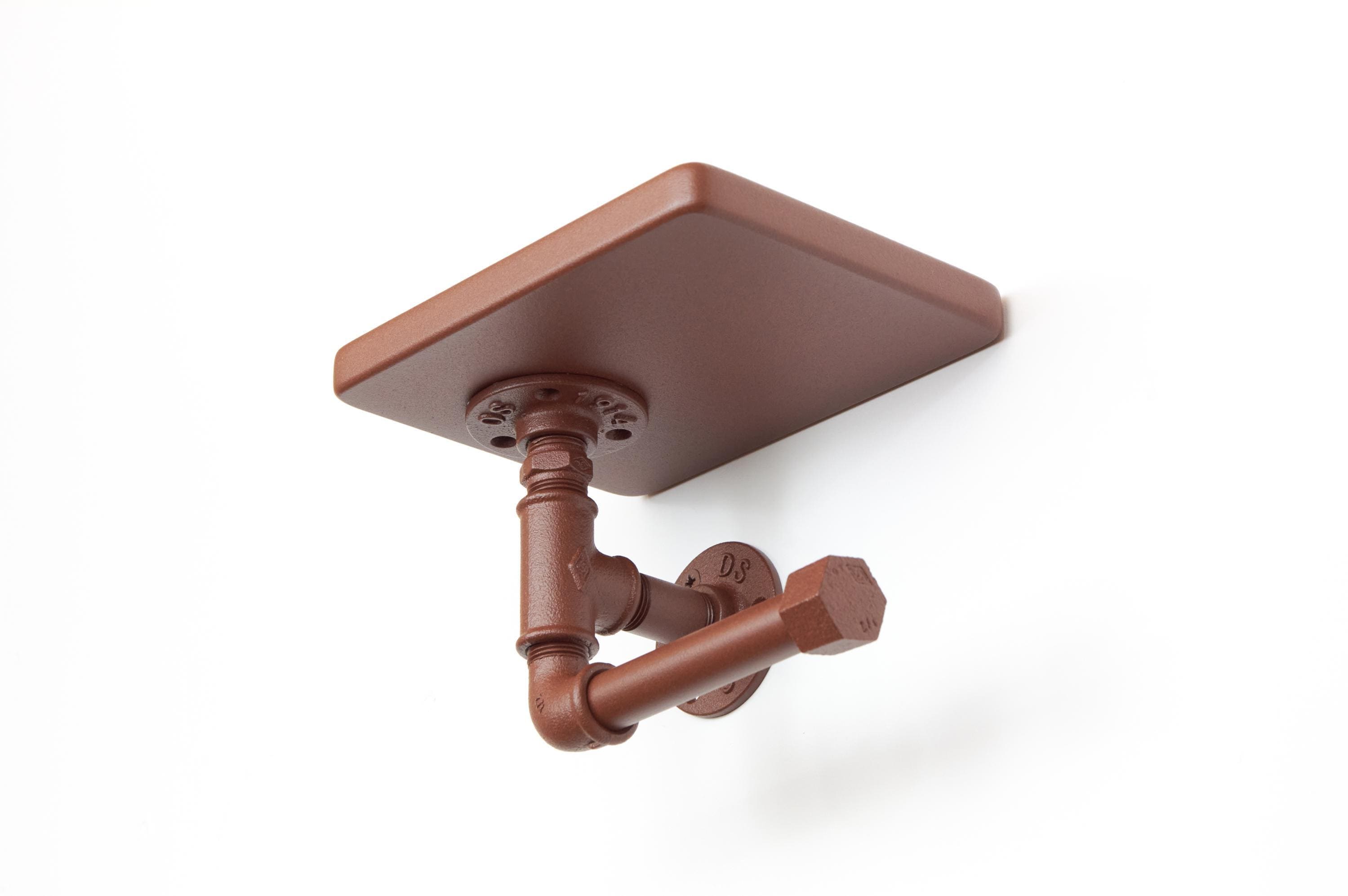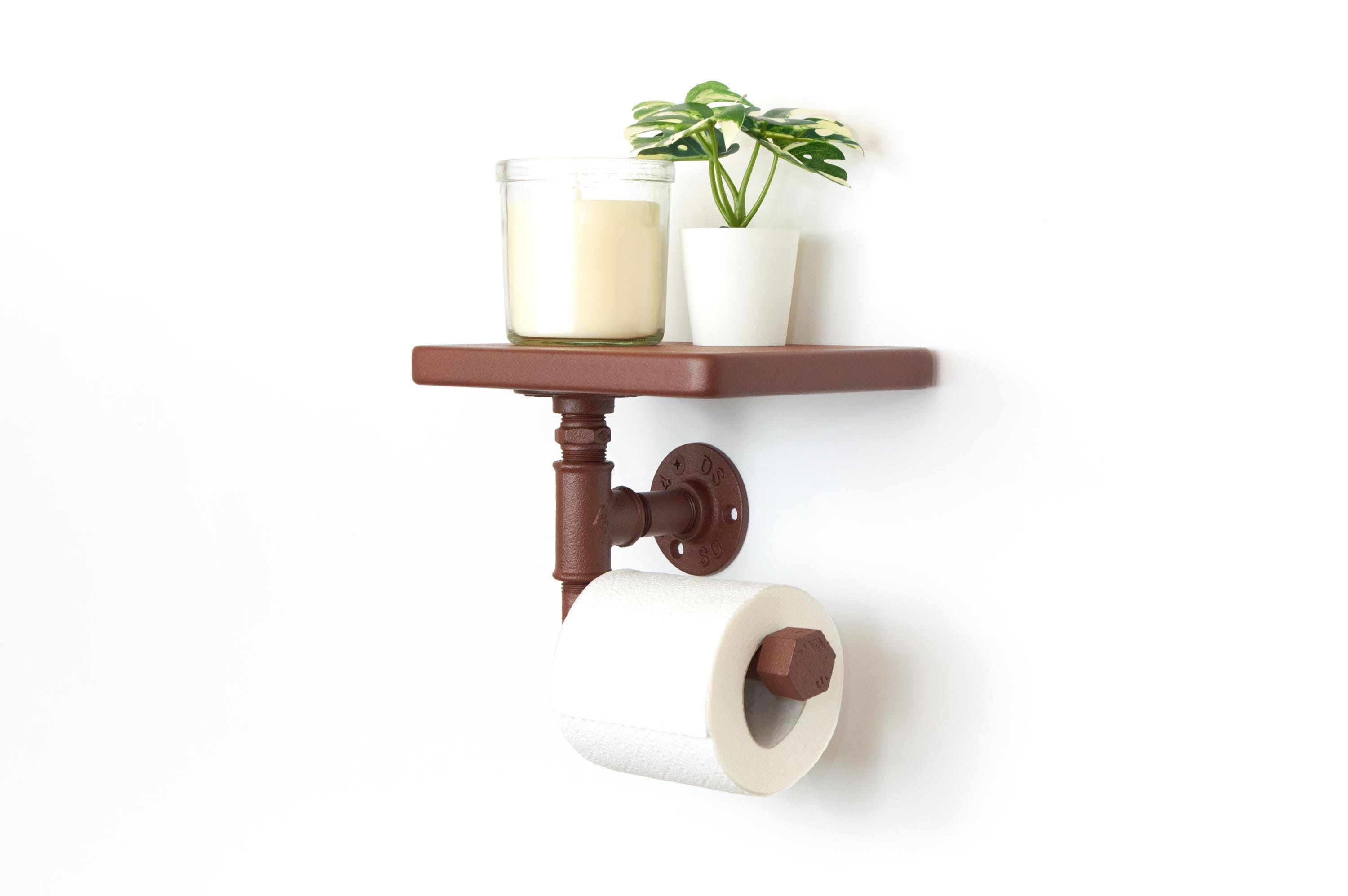 Enhance your bathroom with this rustic toilet paper roll holder with a shelf. A charming farmhouse decor piece that adds both style and function! The color of the product in the pictures is Rust Effect.
