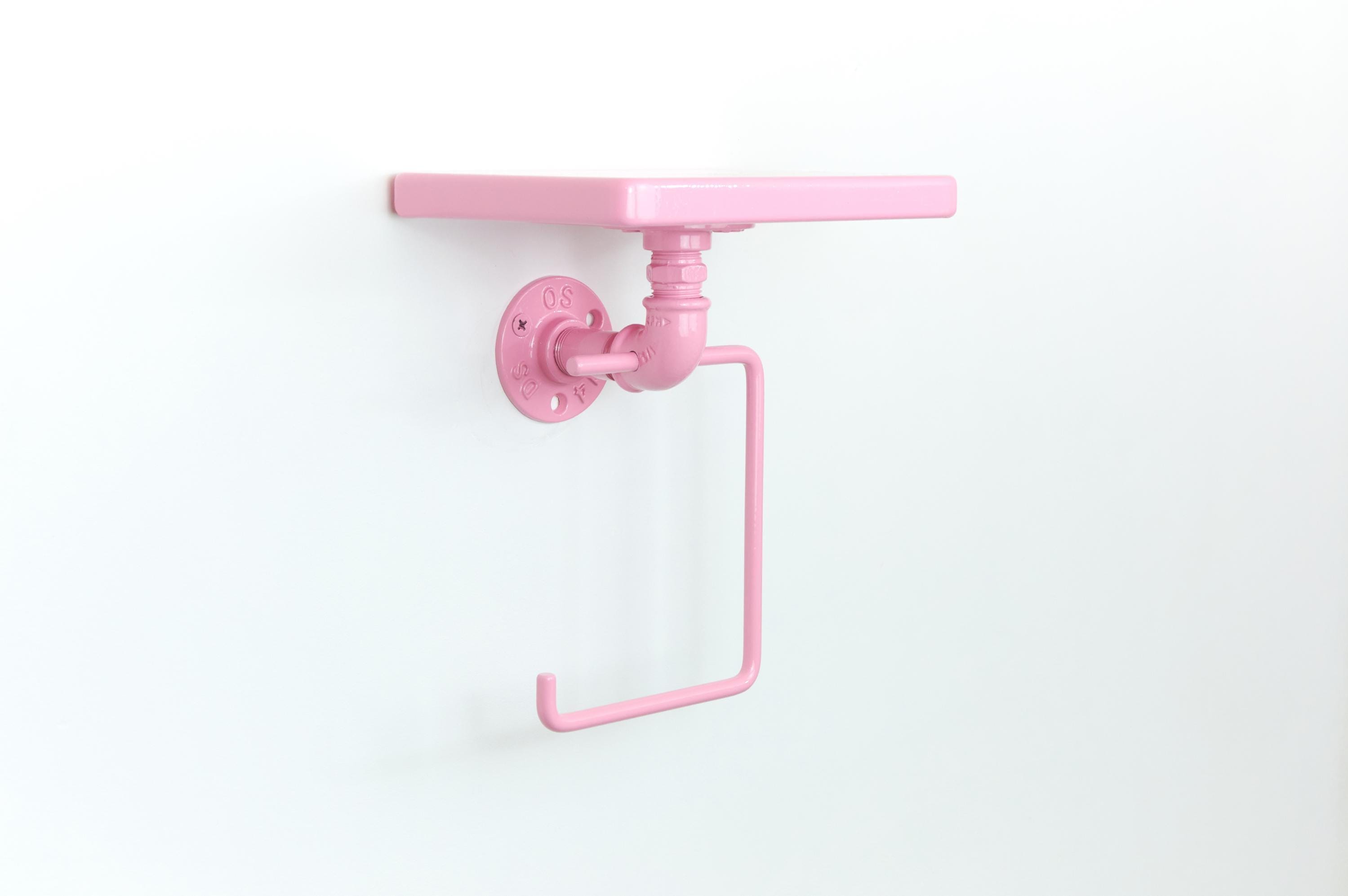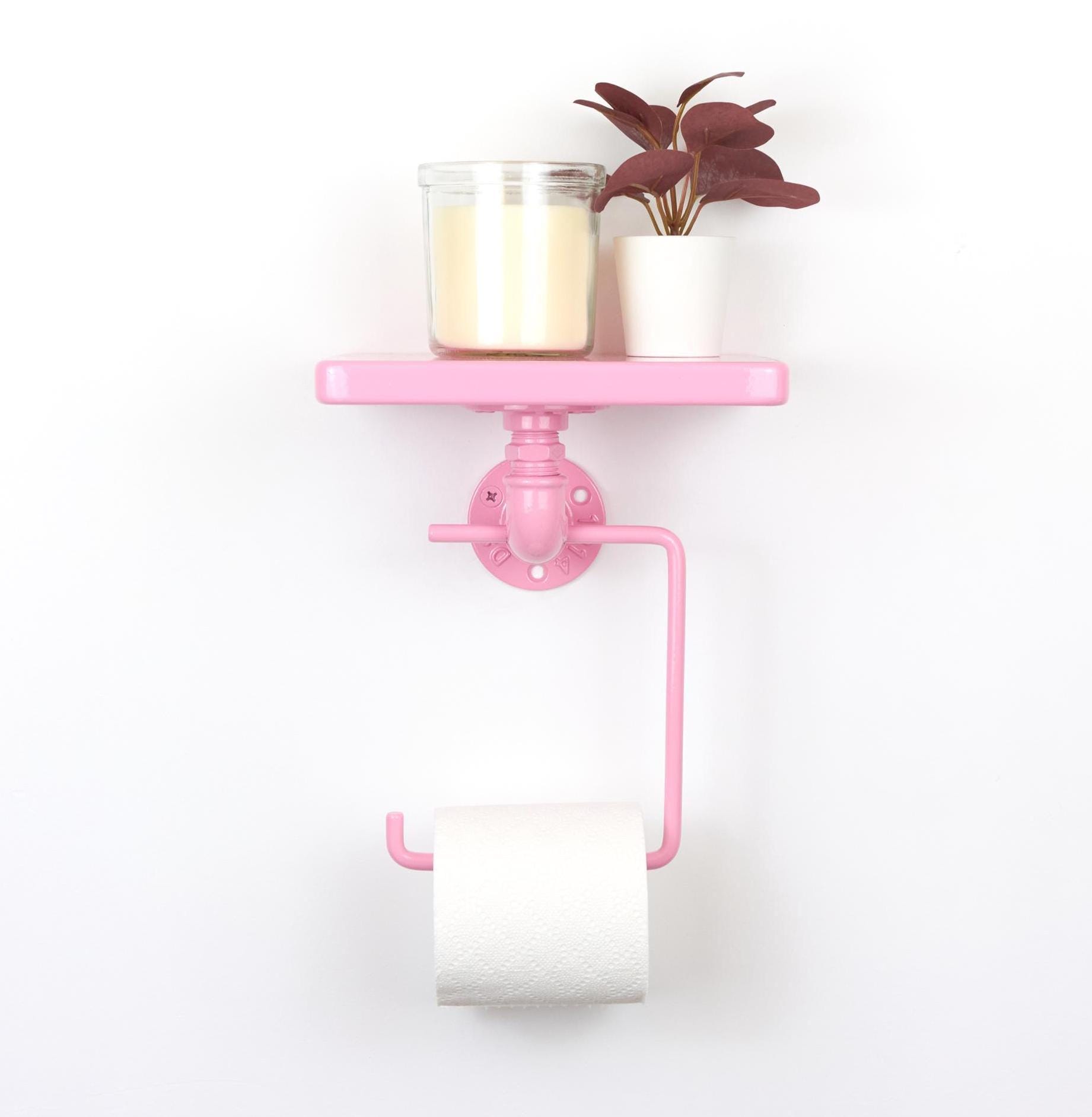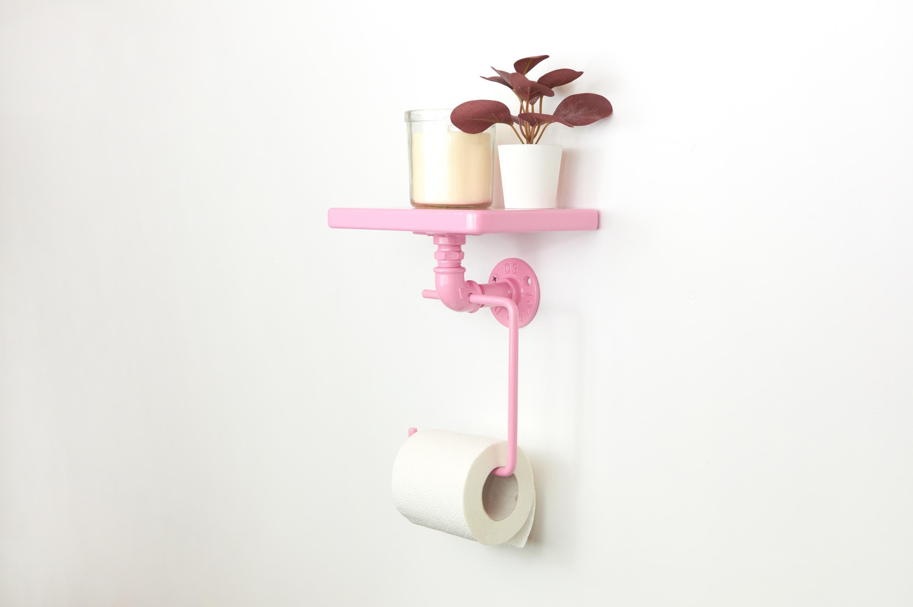 Keep your bathroom organized with this modern toilet paper roll holder with a shelf! The color of the product in the pictures is Pastel Pink.