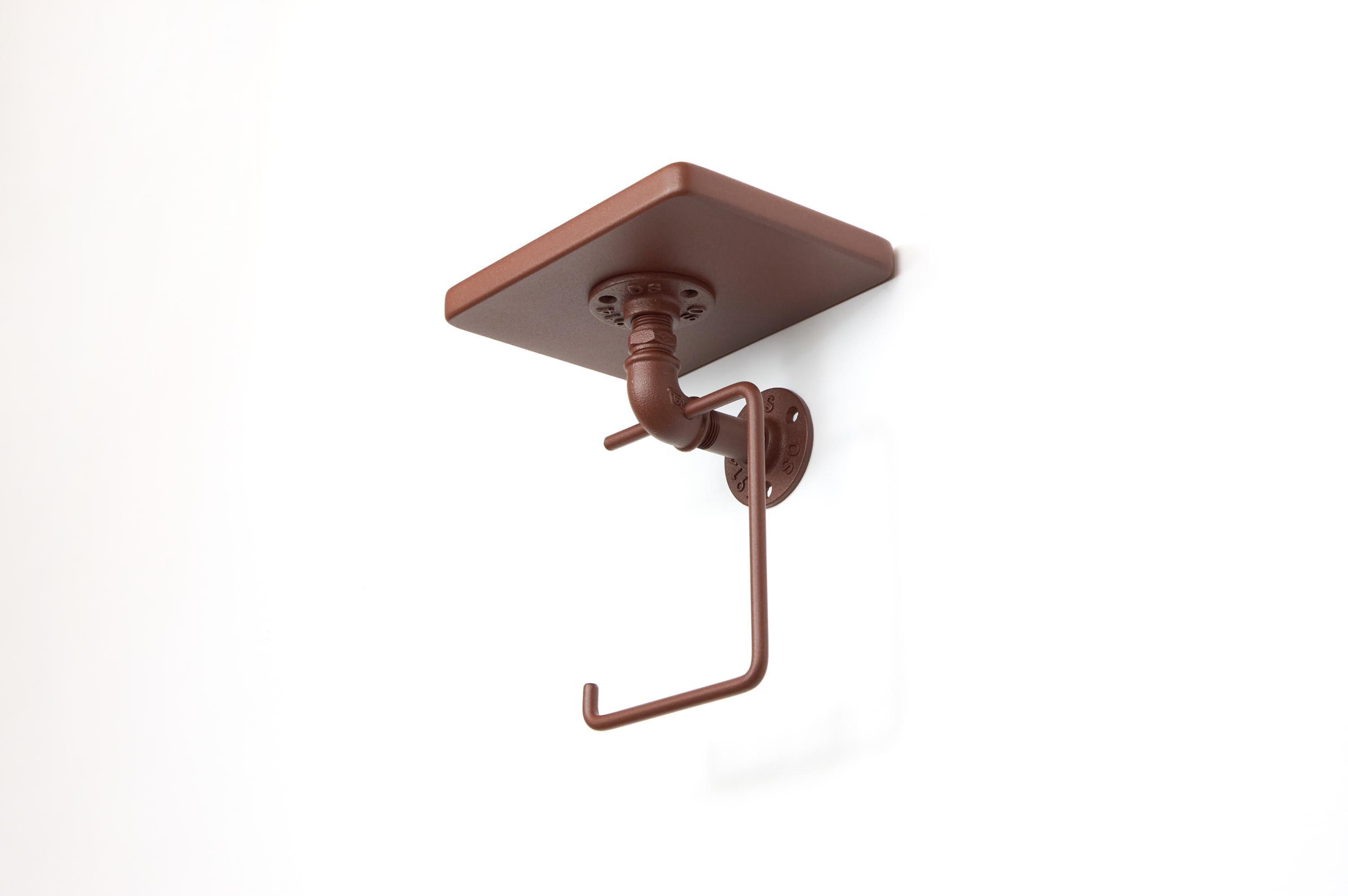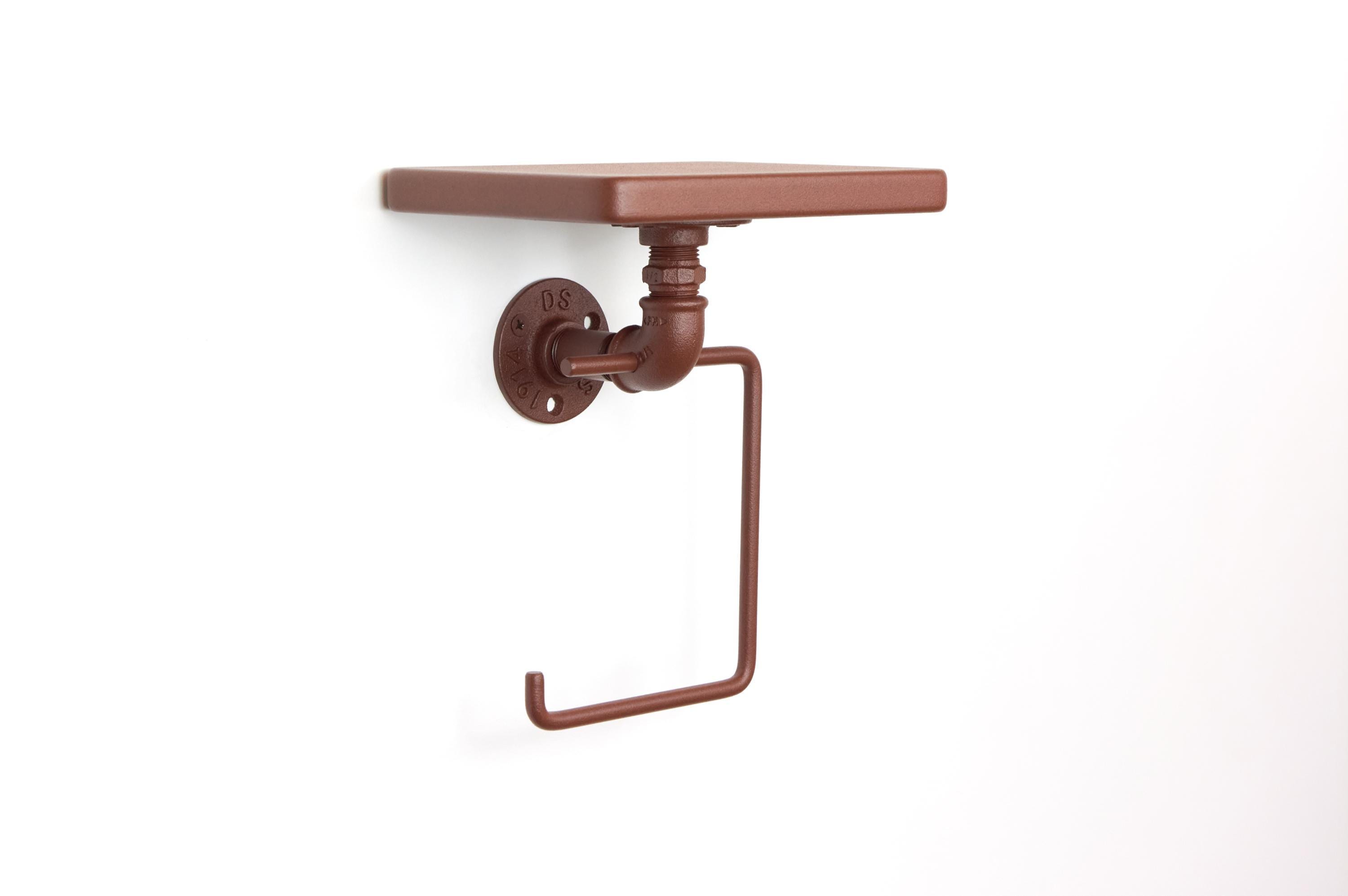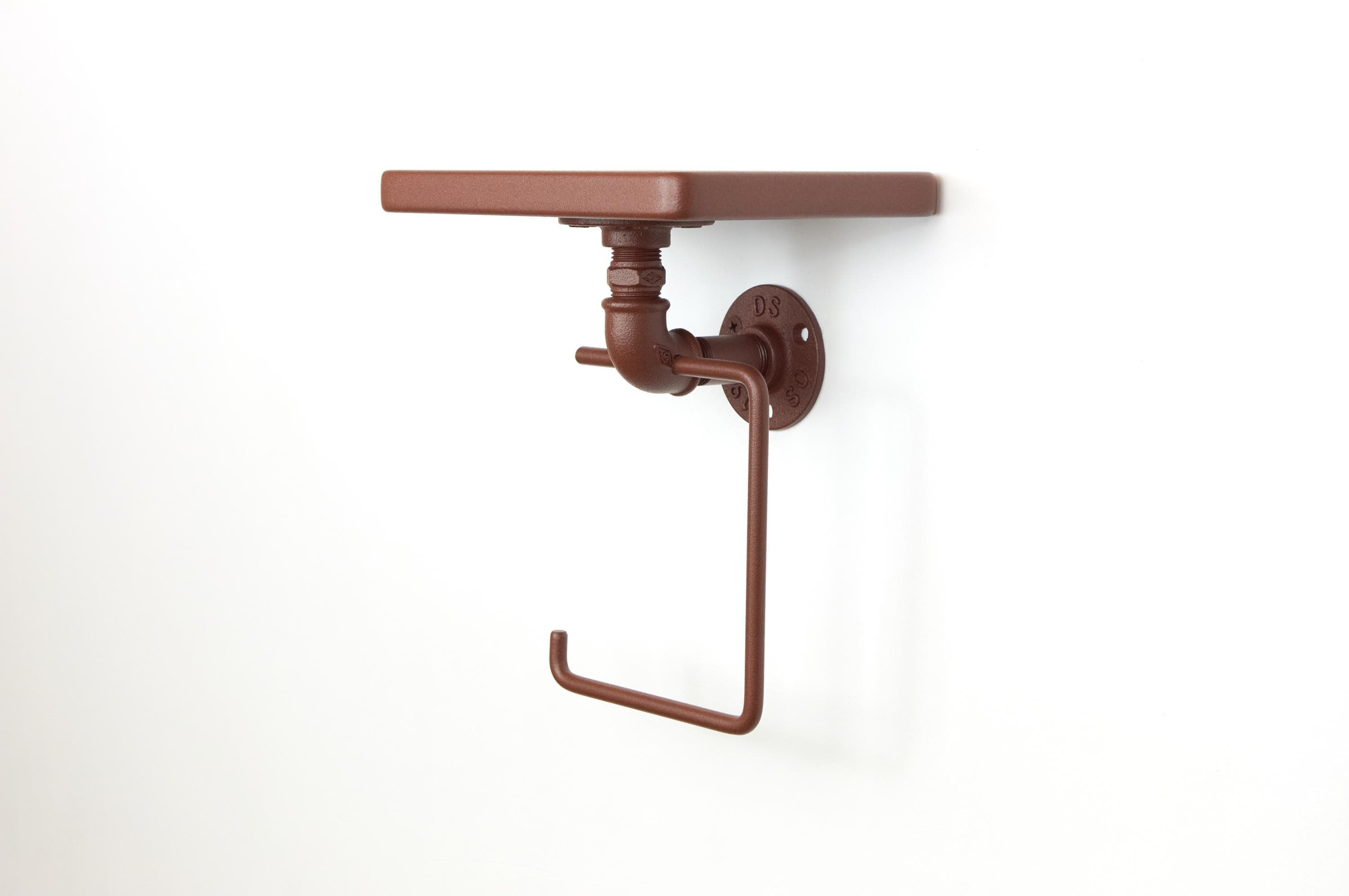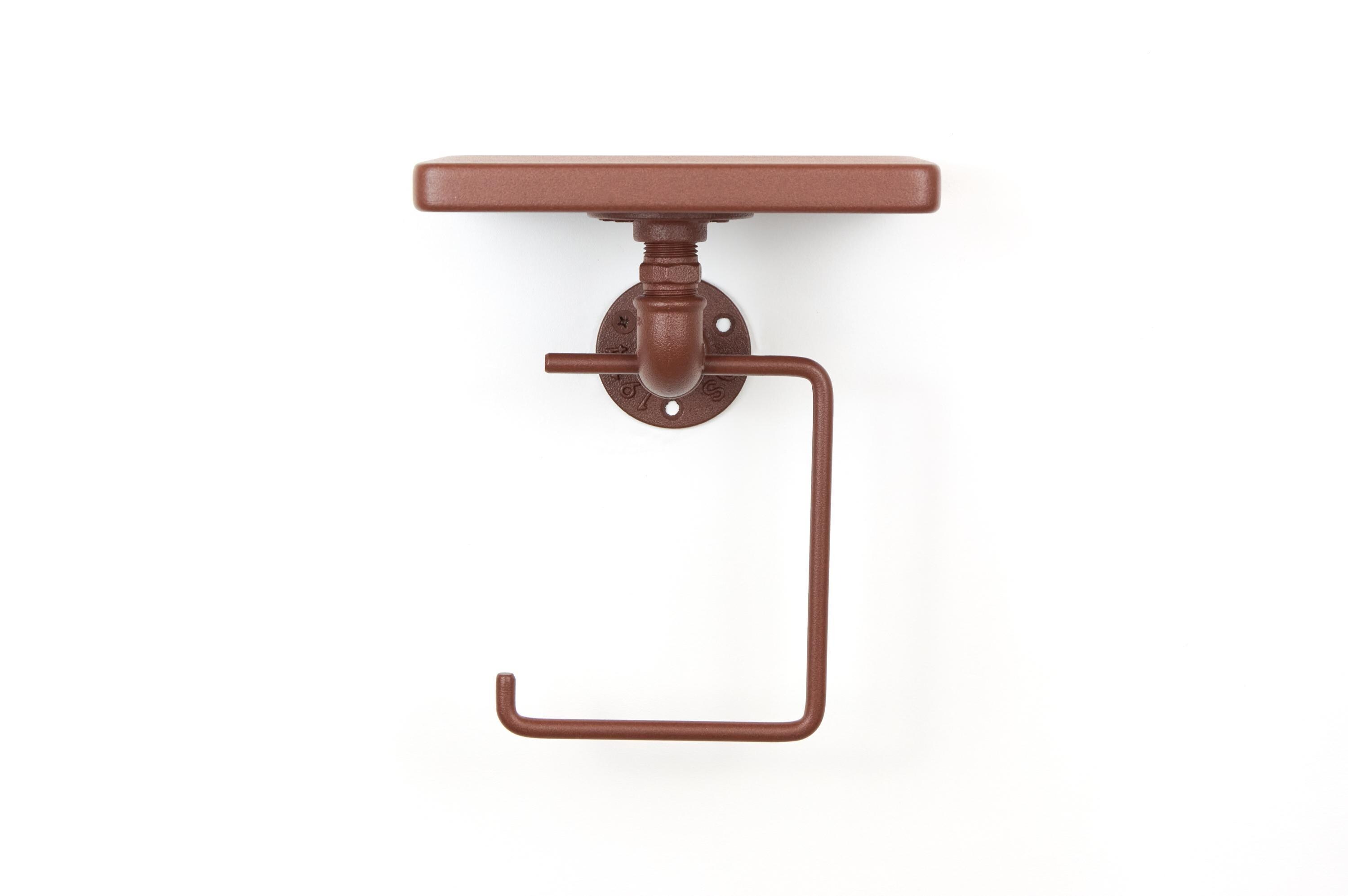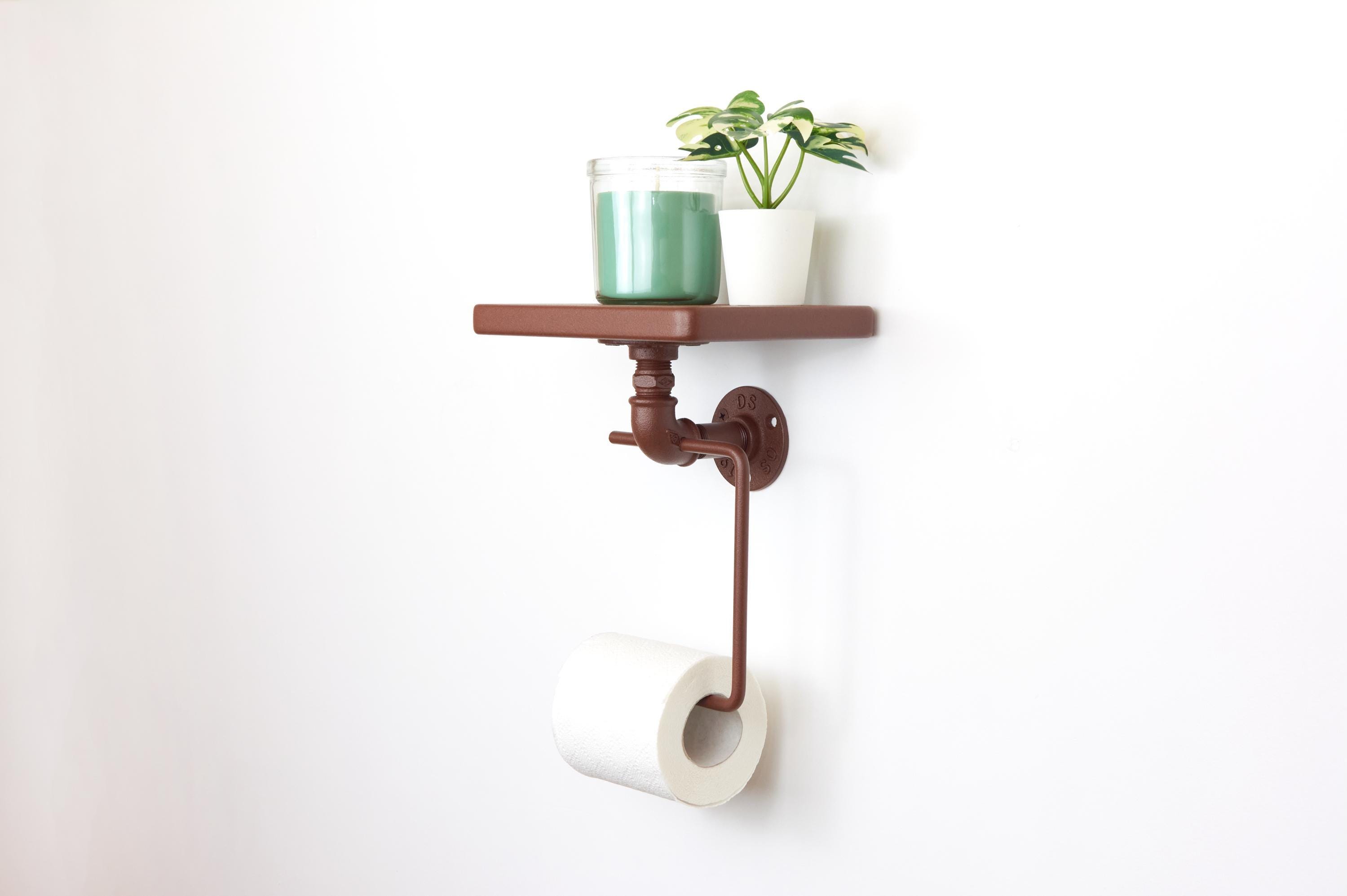 Enhance your bathroom with this toilet paper roll holder with a shelf. Featuring a rustic design, it offers stylish and practical storage! The color of the product in the pictures is Rust Effect.
