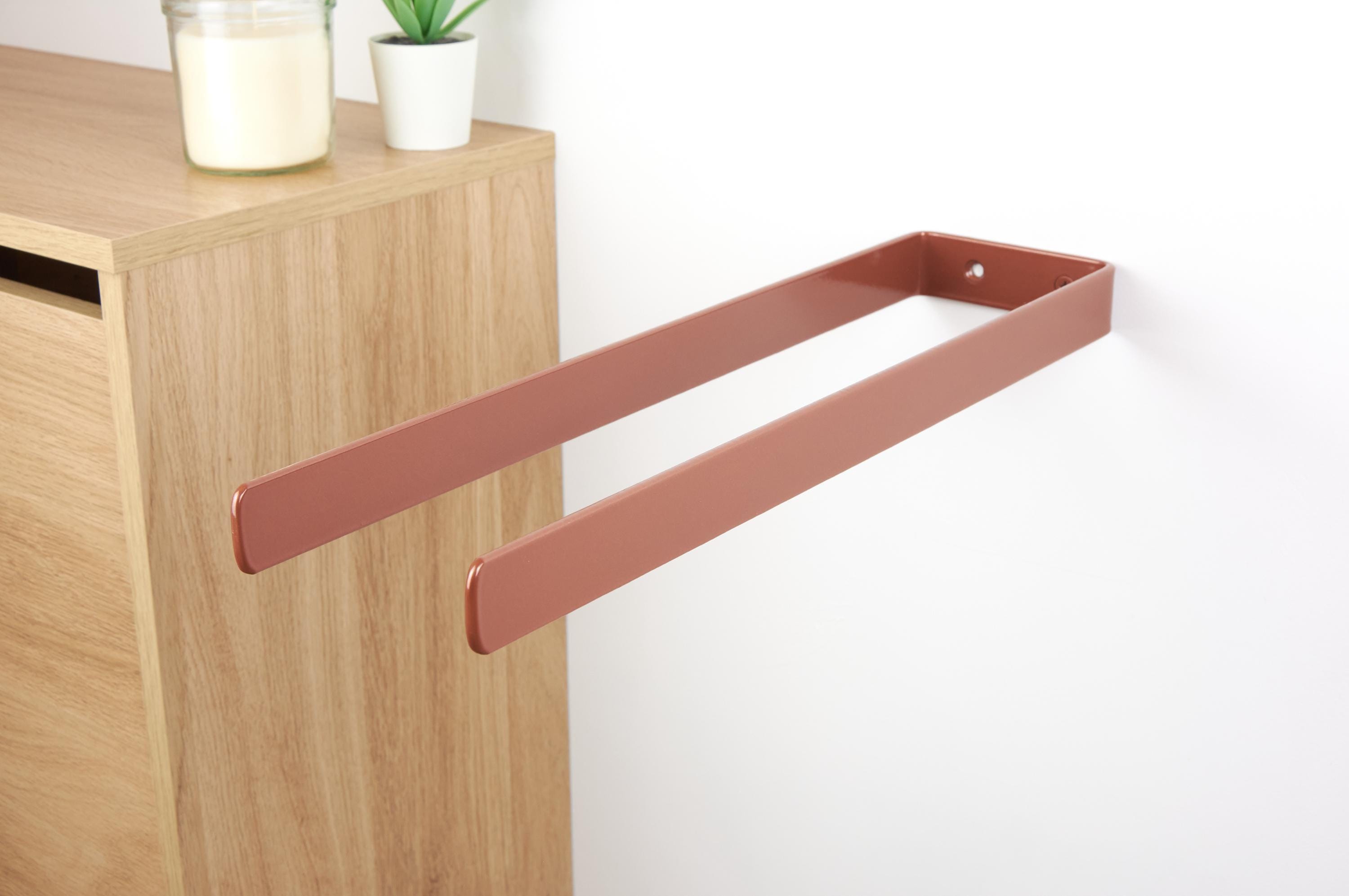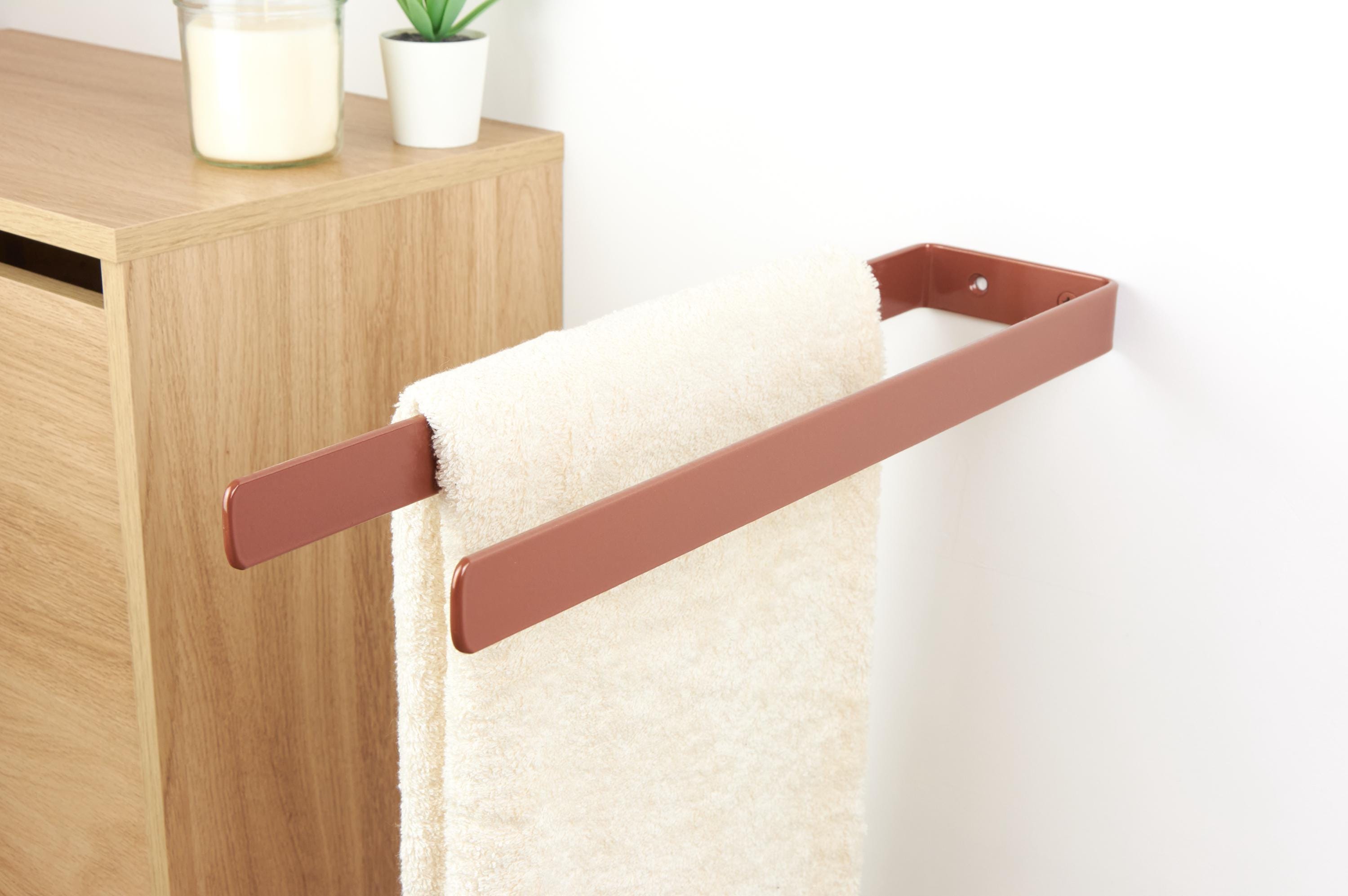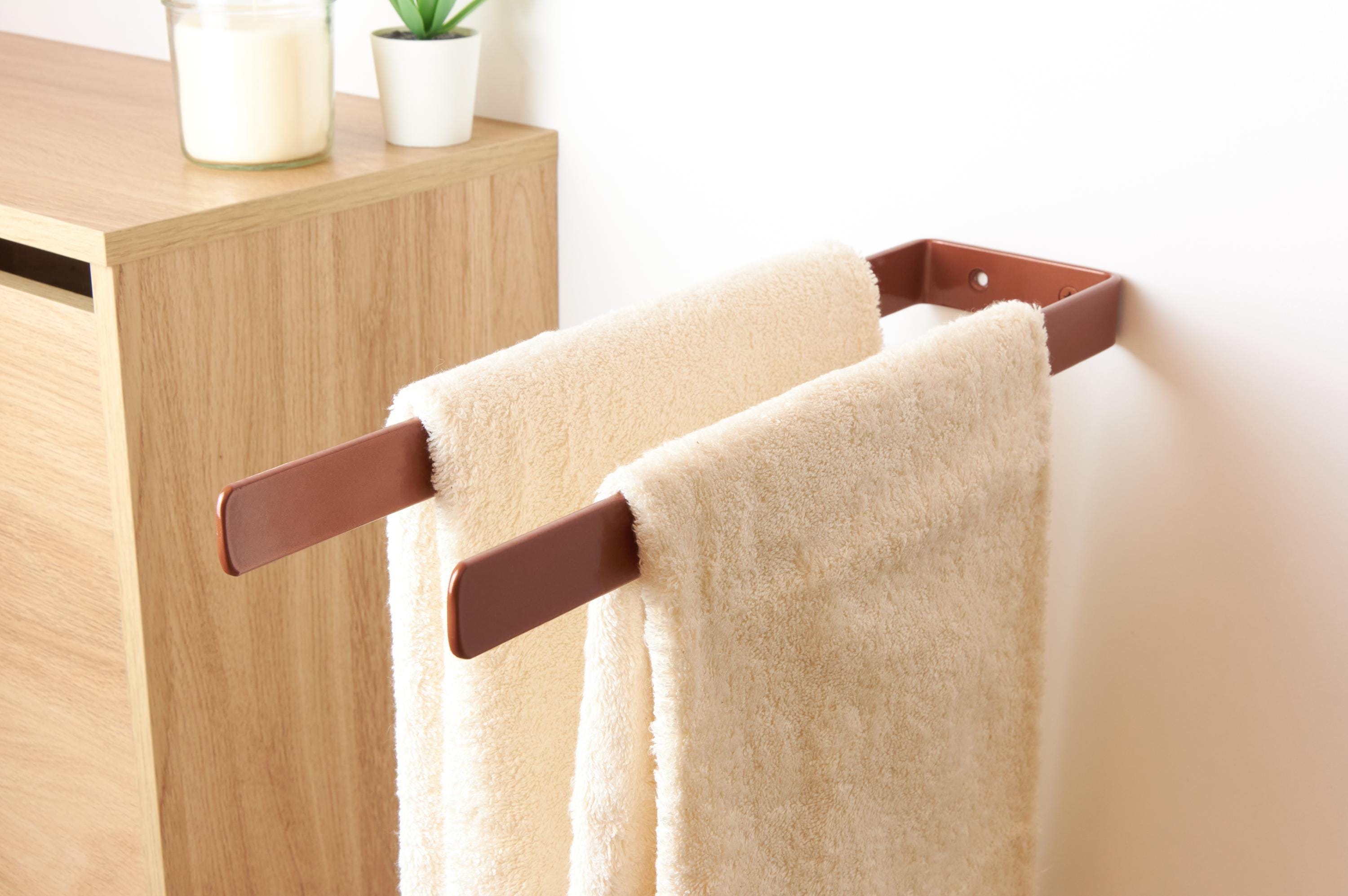 Add style and function to your space with this double towel holder! A sleek wall mounted towel rack, it’s the perfect modern metal towel bar and a practical touch of functional bathroom decor. The color of the product in the pictures is Copper.