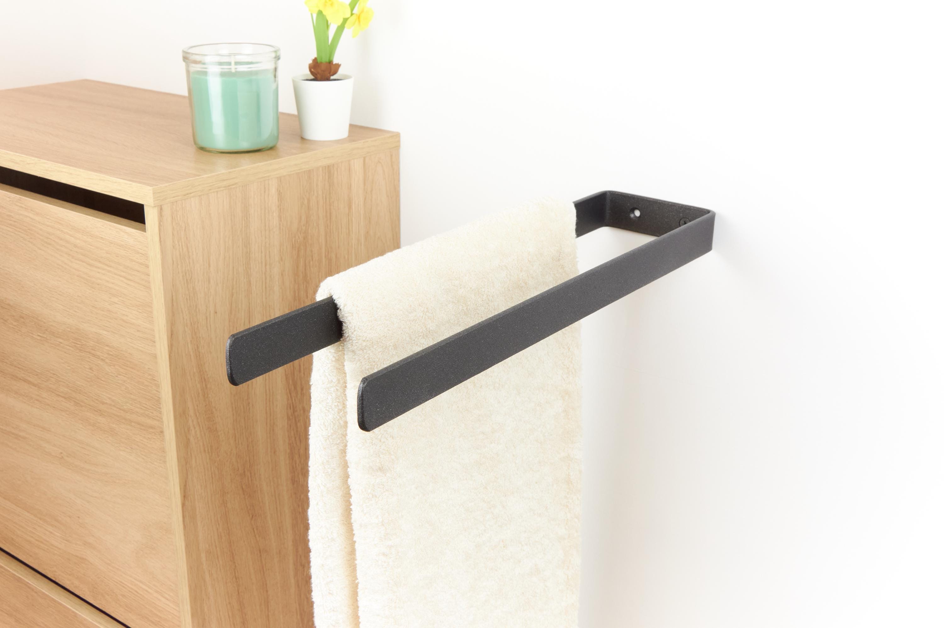 This double towel holder is a durable wall mounted bathroom towel bar designed for space-efficient bath storage! The color of the product in the pictures is Sand Textured Black.
