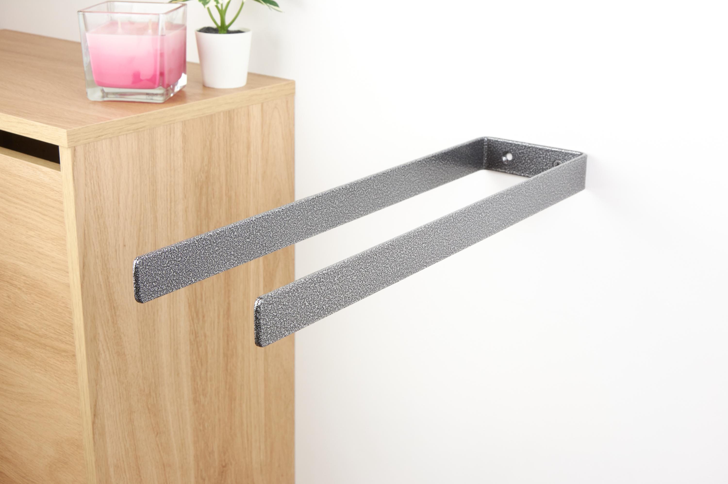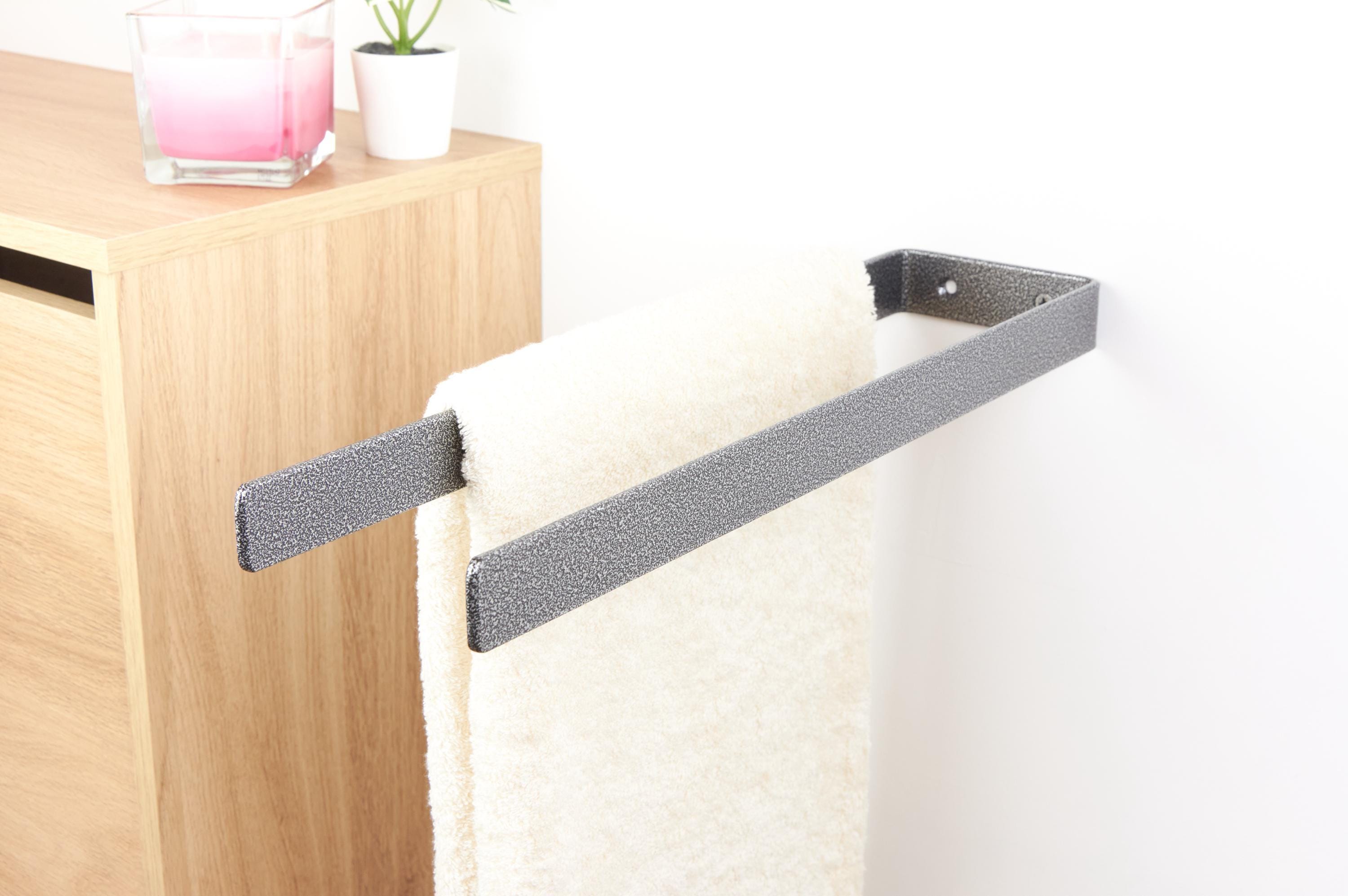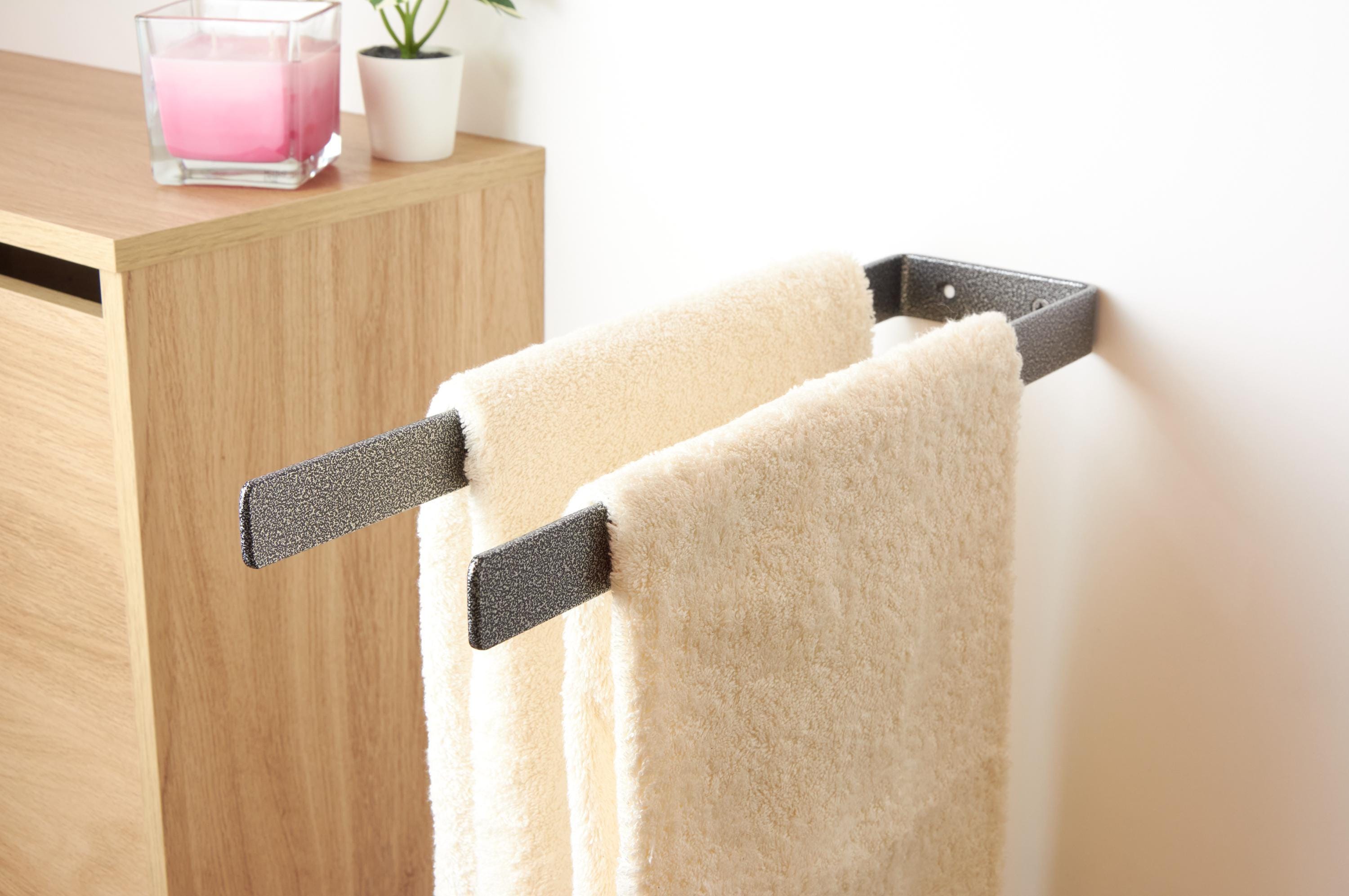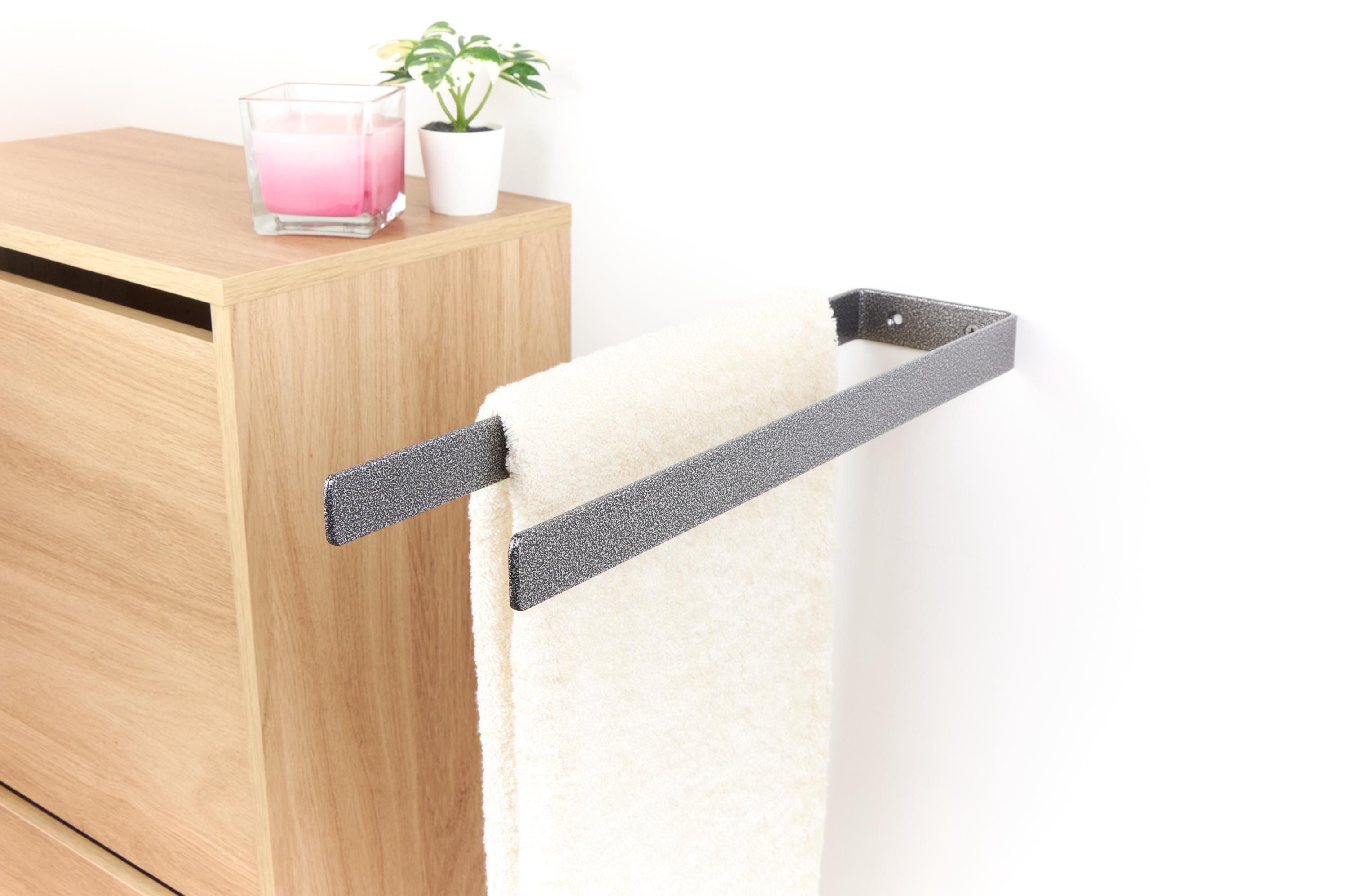 This wall mounted double towel holder is a modern metal rack and space saving bathroom towel bar, perfect for organized storage! The color of the product in the pictures is Antique Silver.