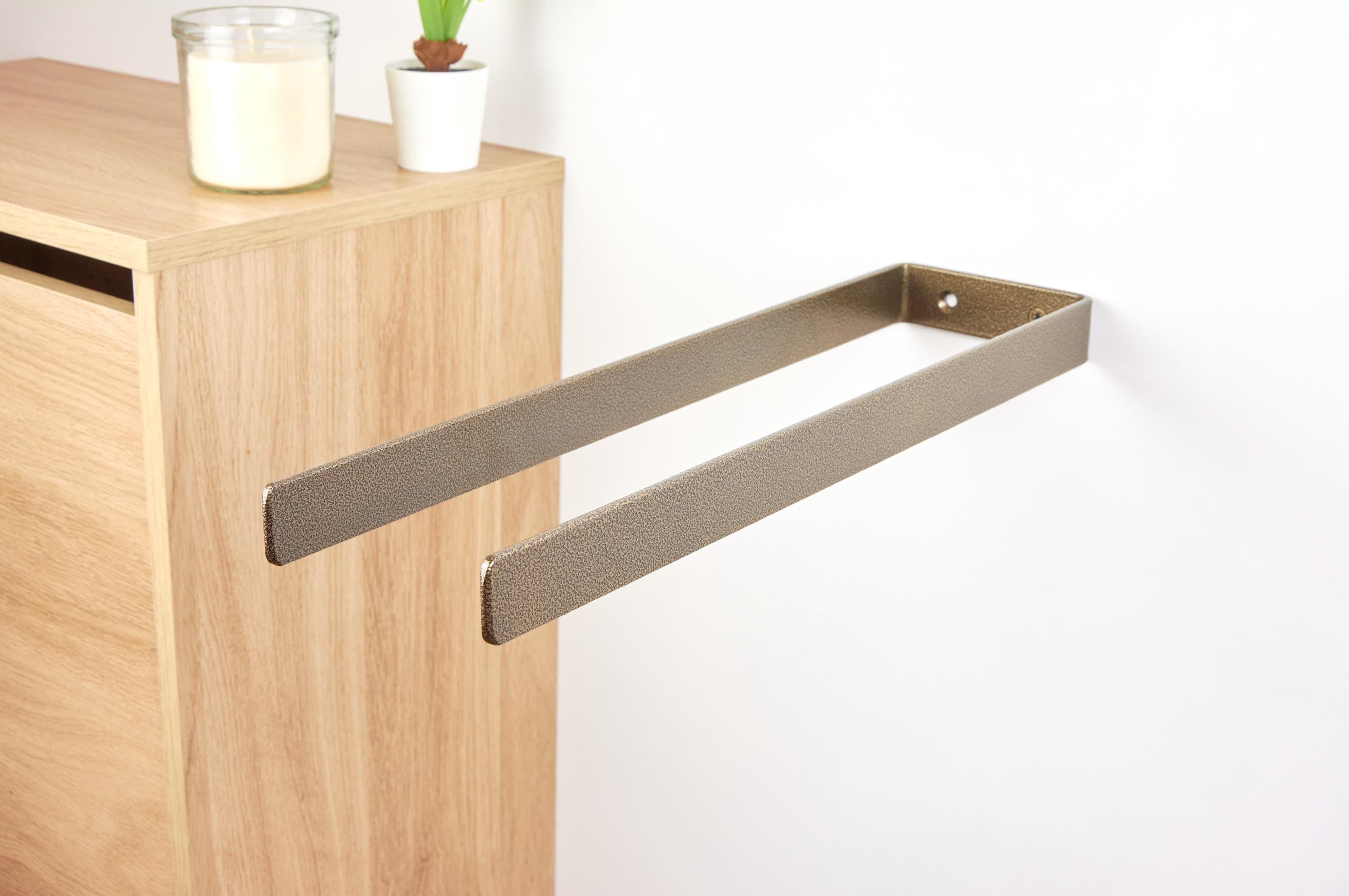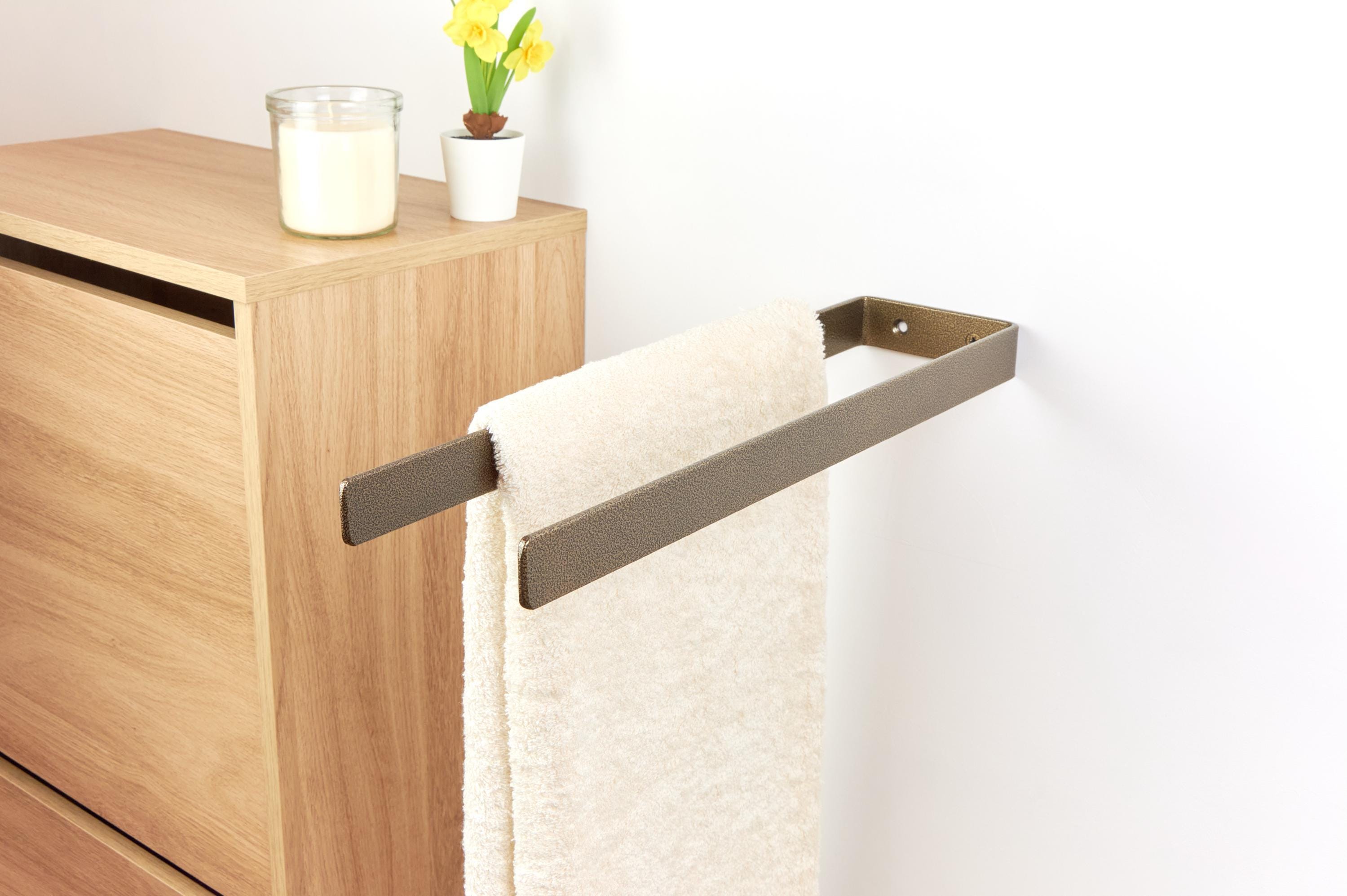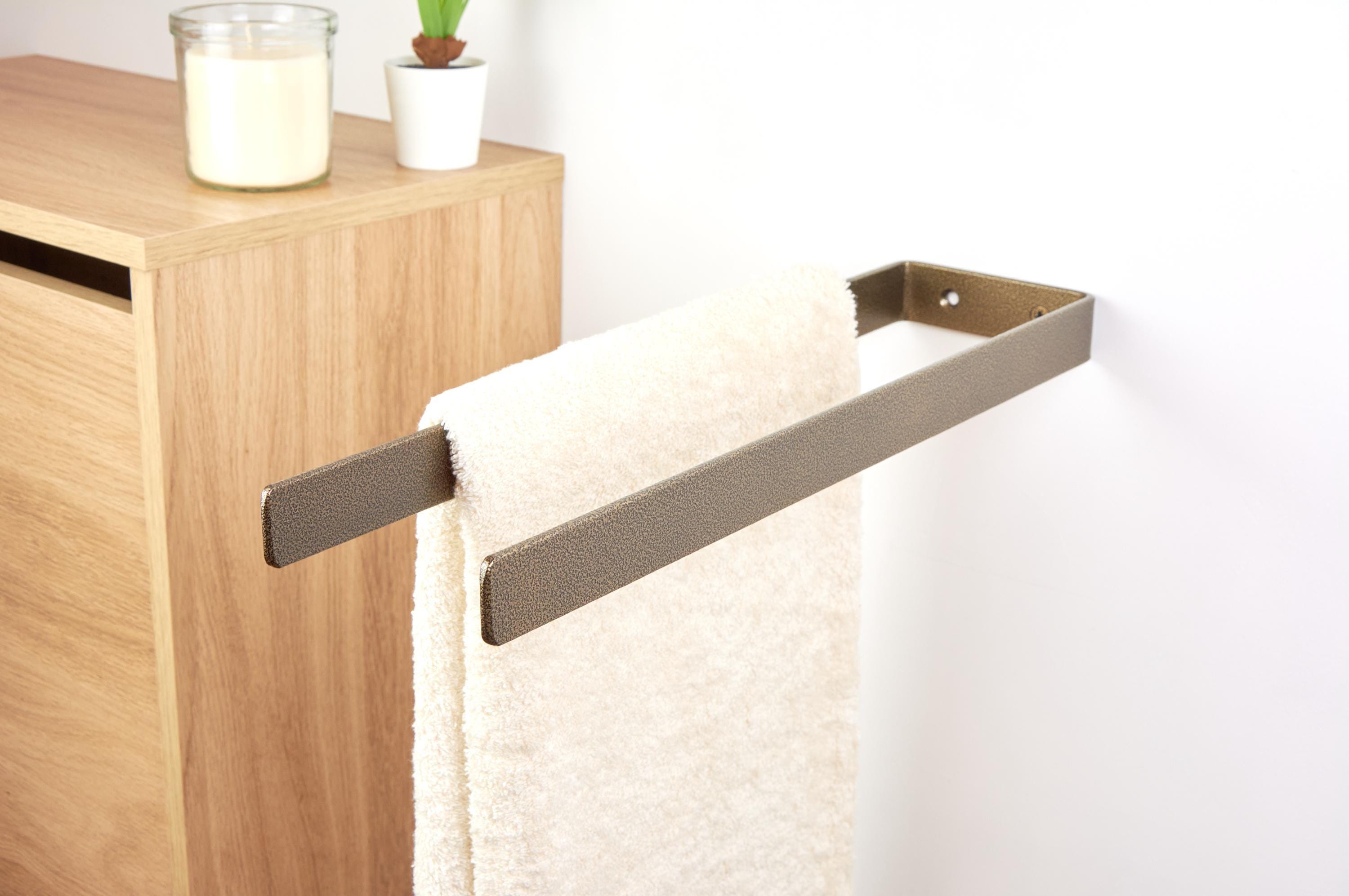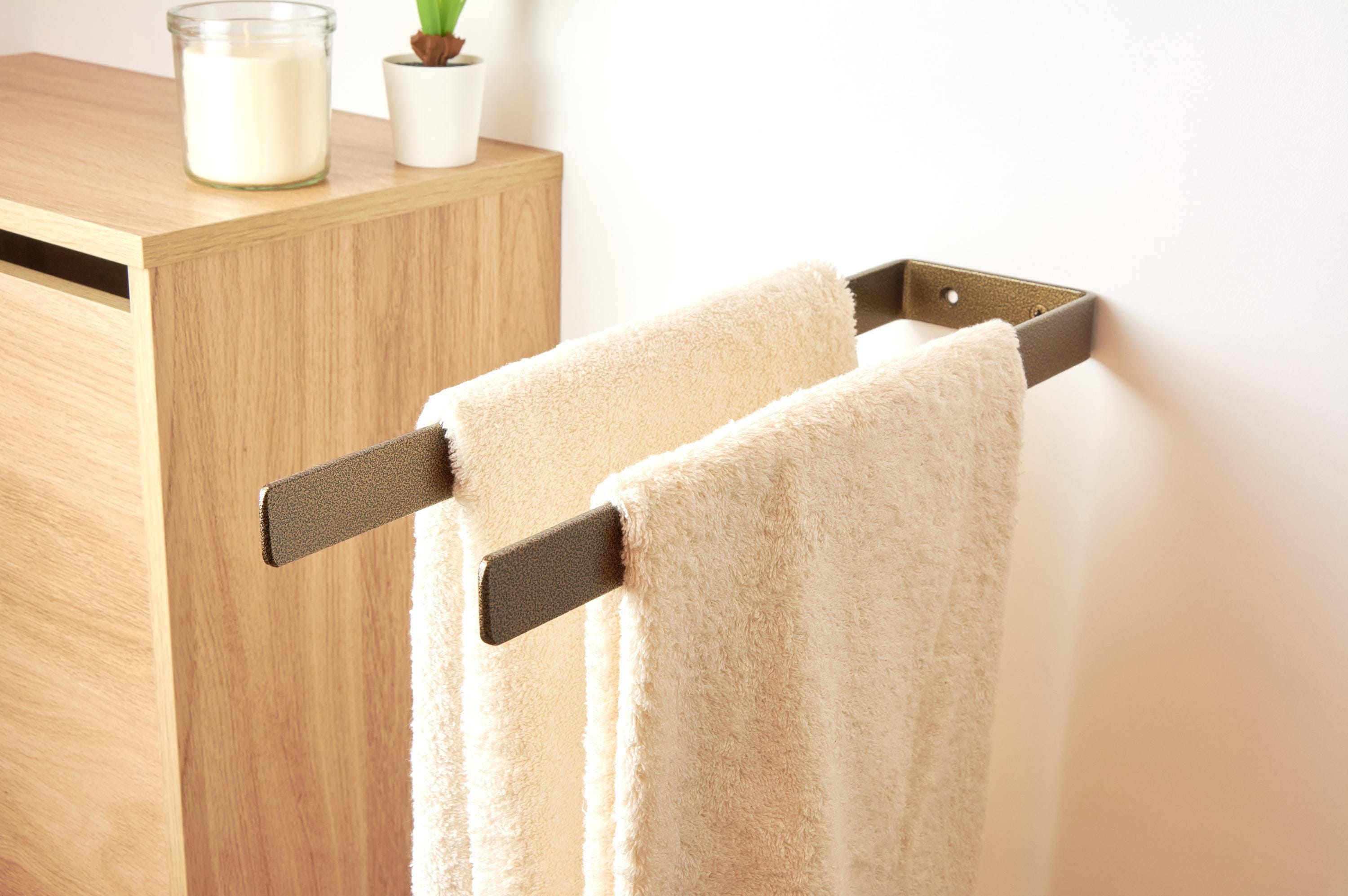 This dual towel bar for bathroom is a sleek wall mounted metal towel rack and a minimalist storage solution for modern spaces! The color of the product in the pictures is Antique Brass.