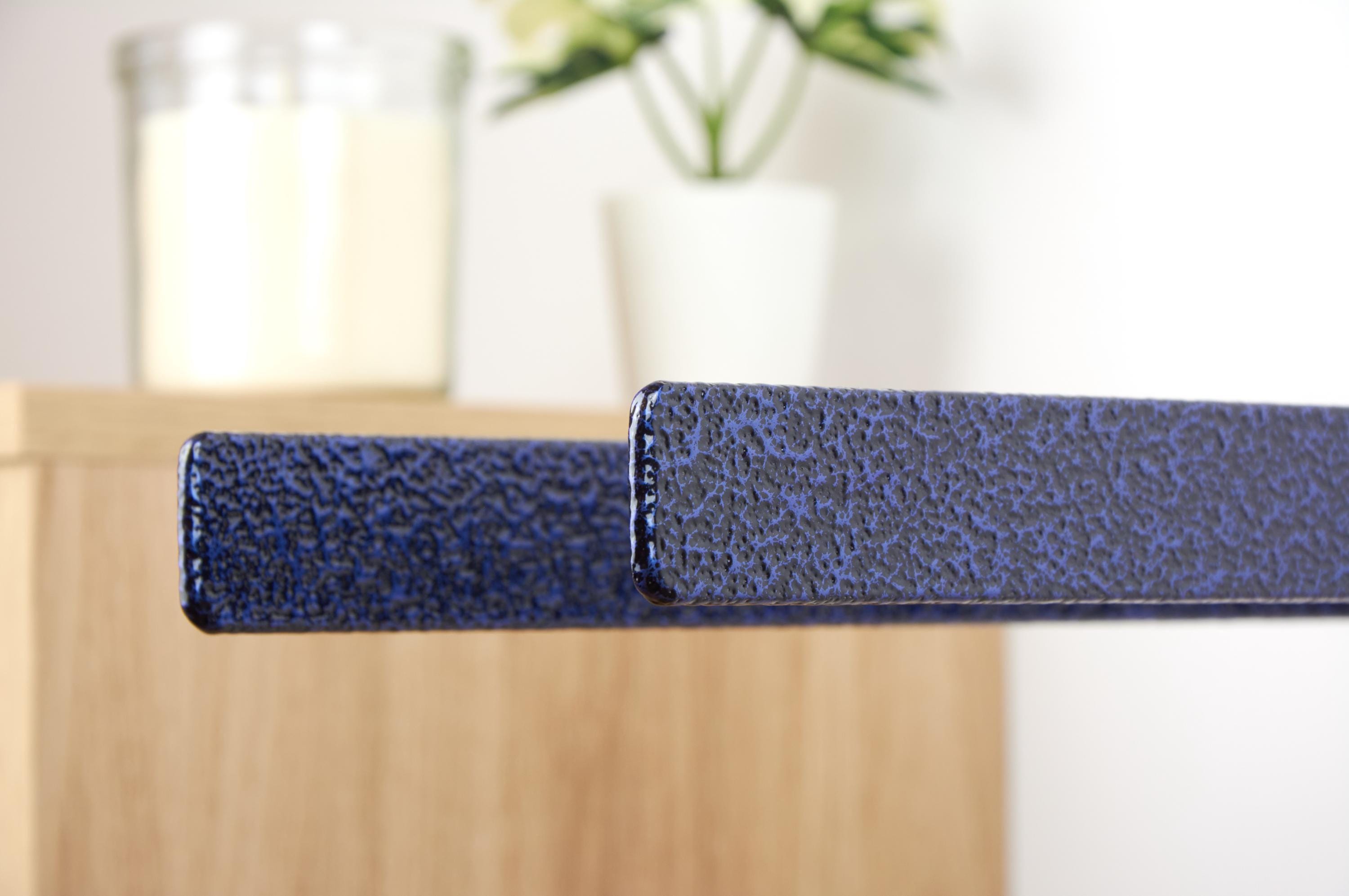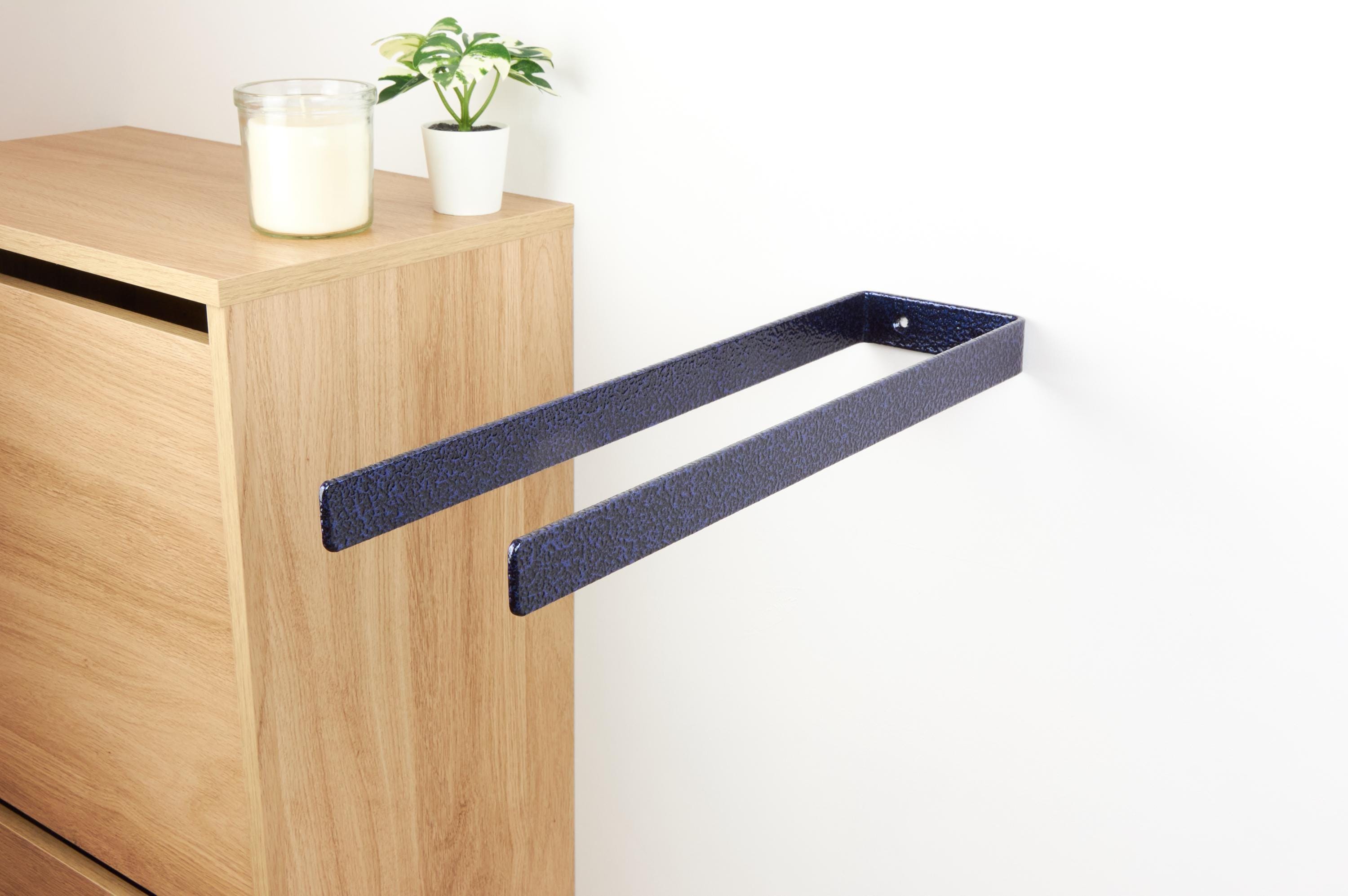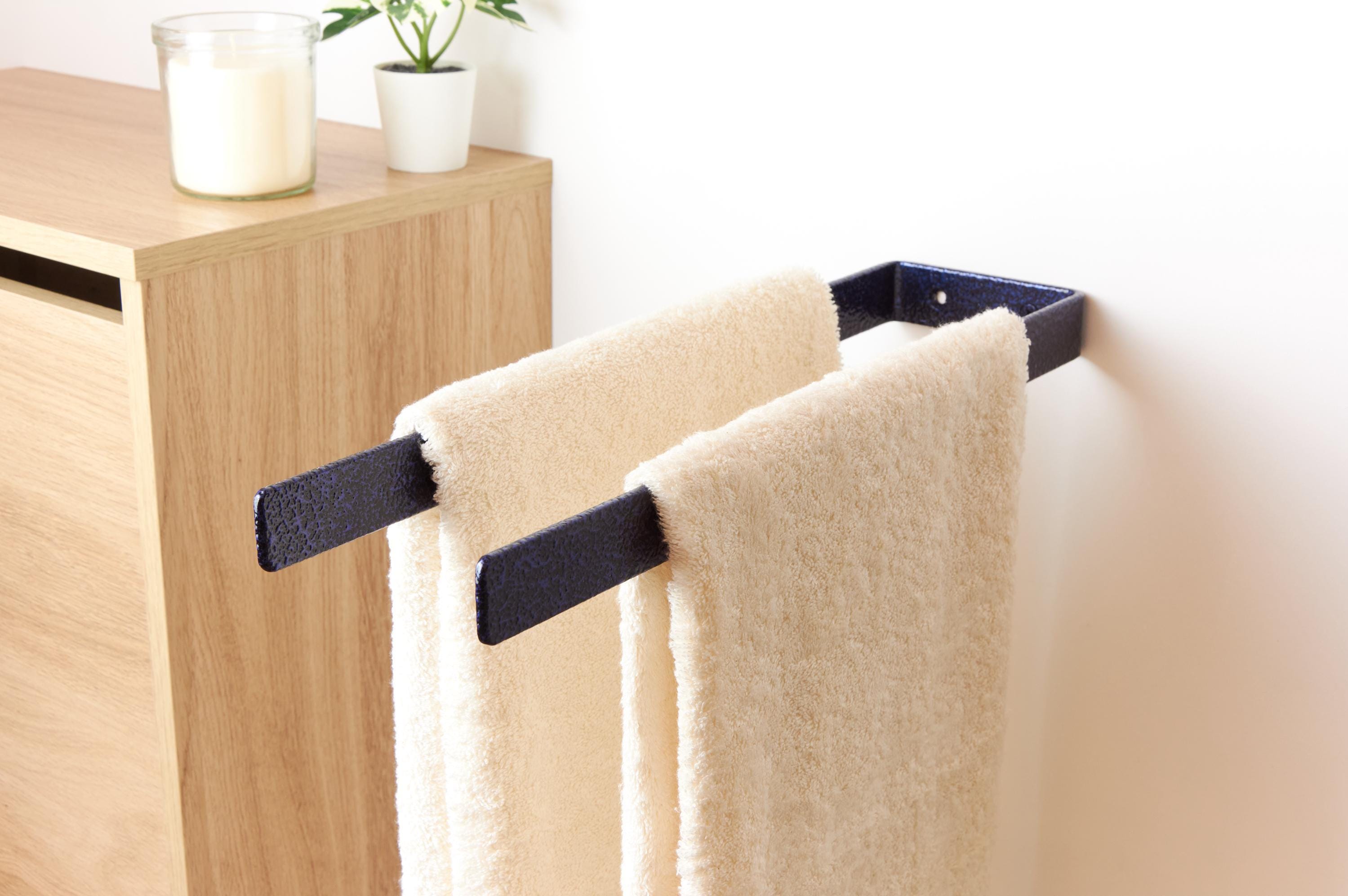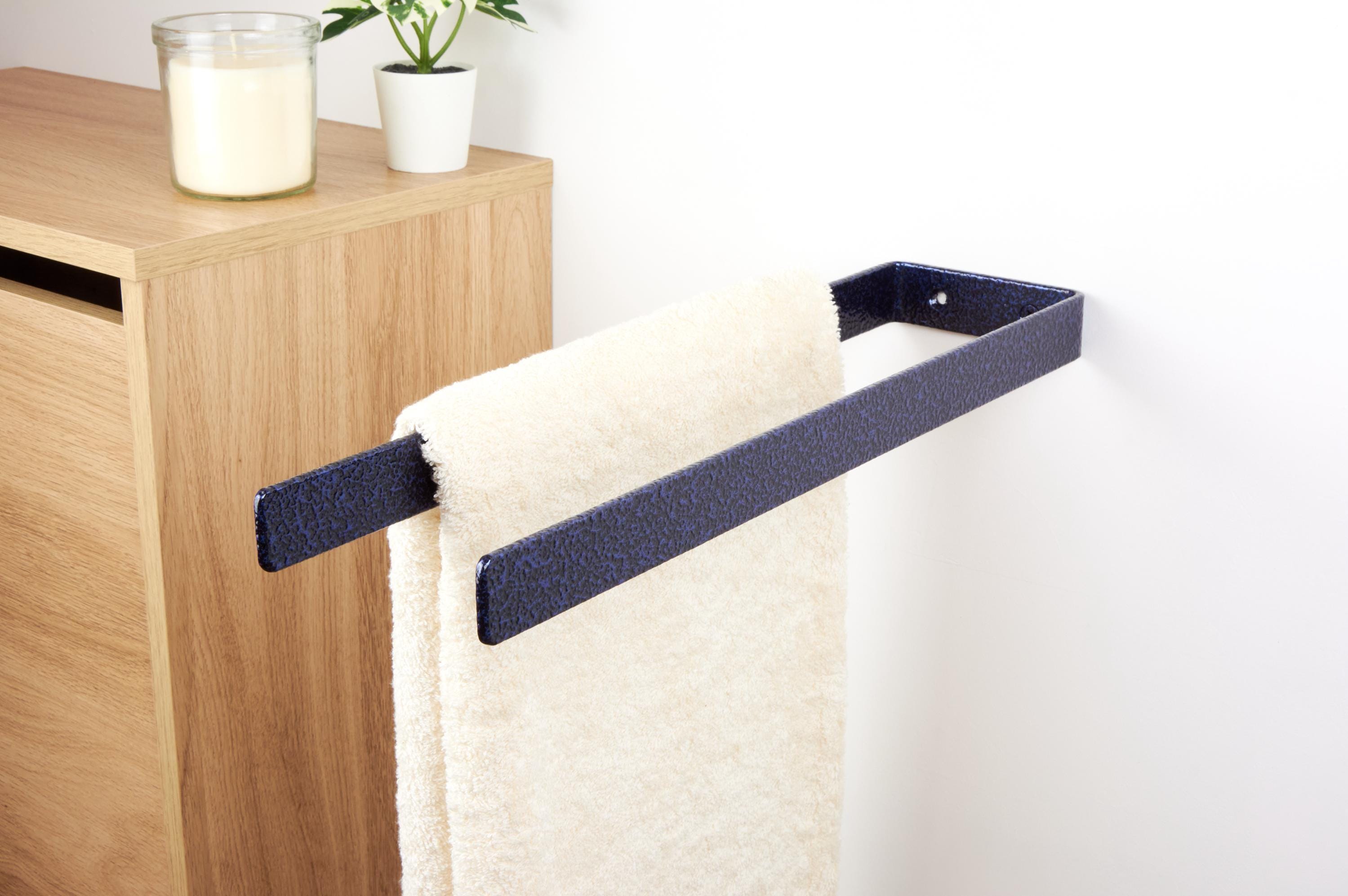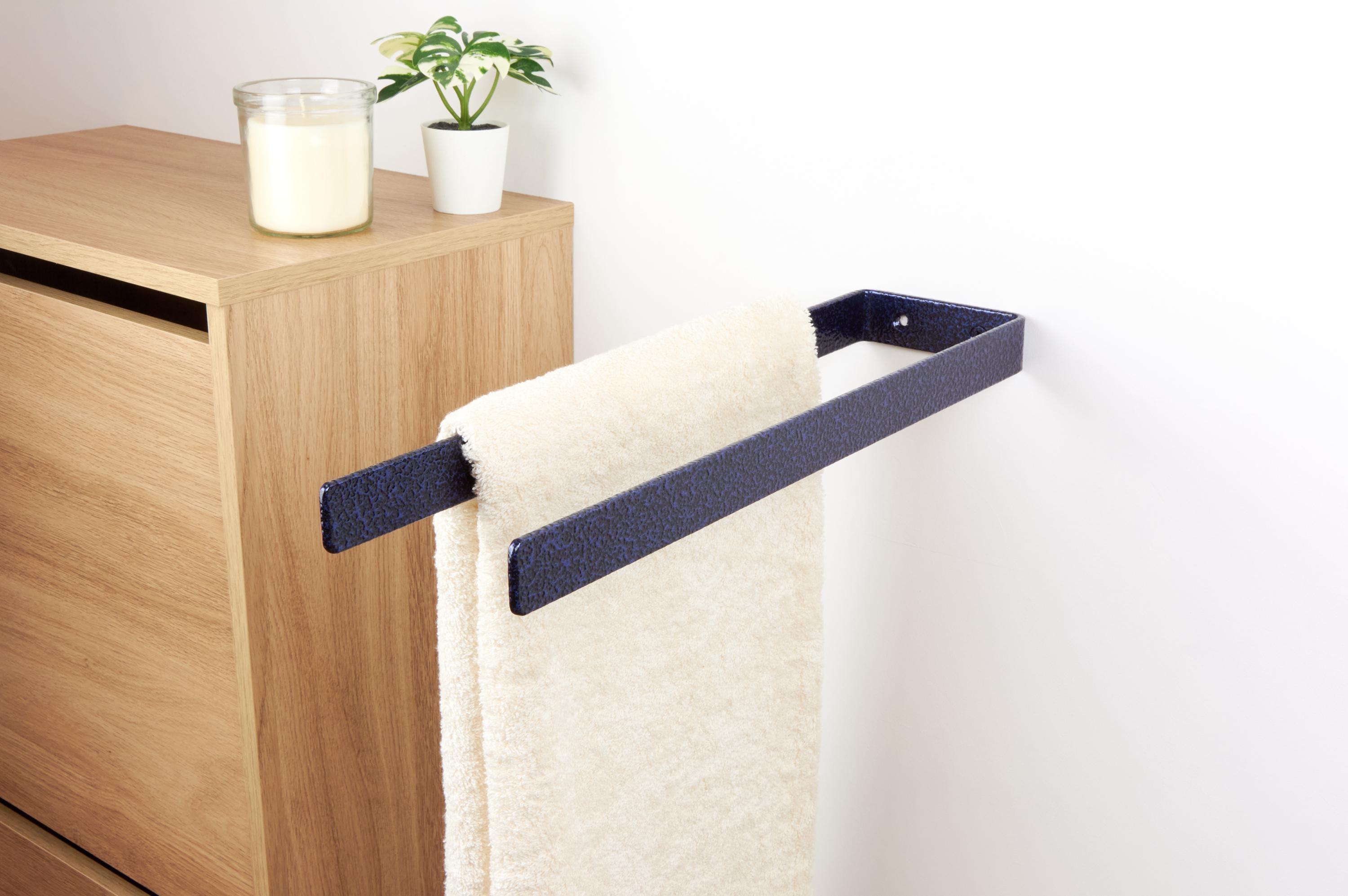 This dual towel rack is a space-saving bathroom wall bar and modern metal towel hanger, perfect as a functional bath storage! The color of the product in the pictures is Antique Blue.