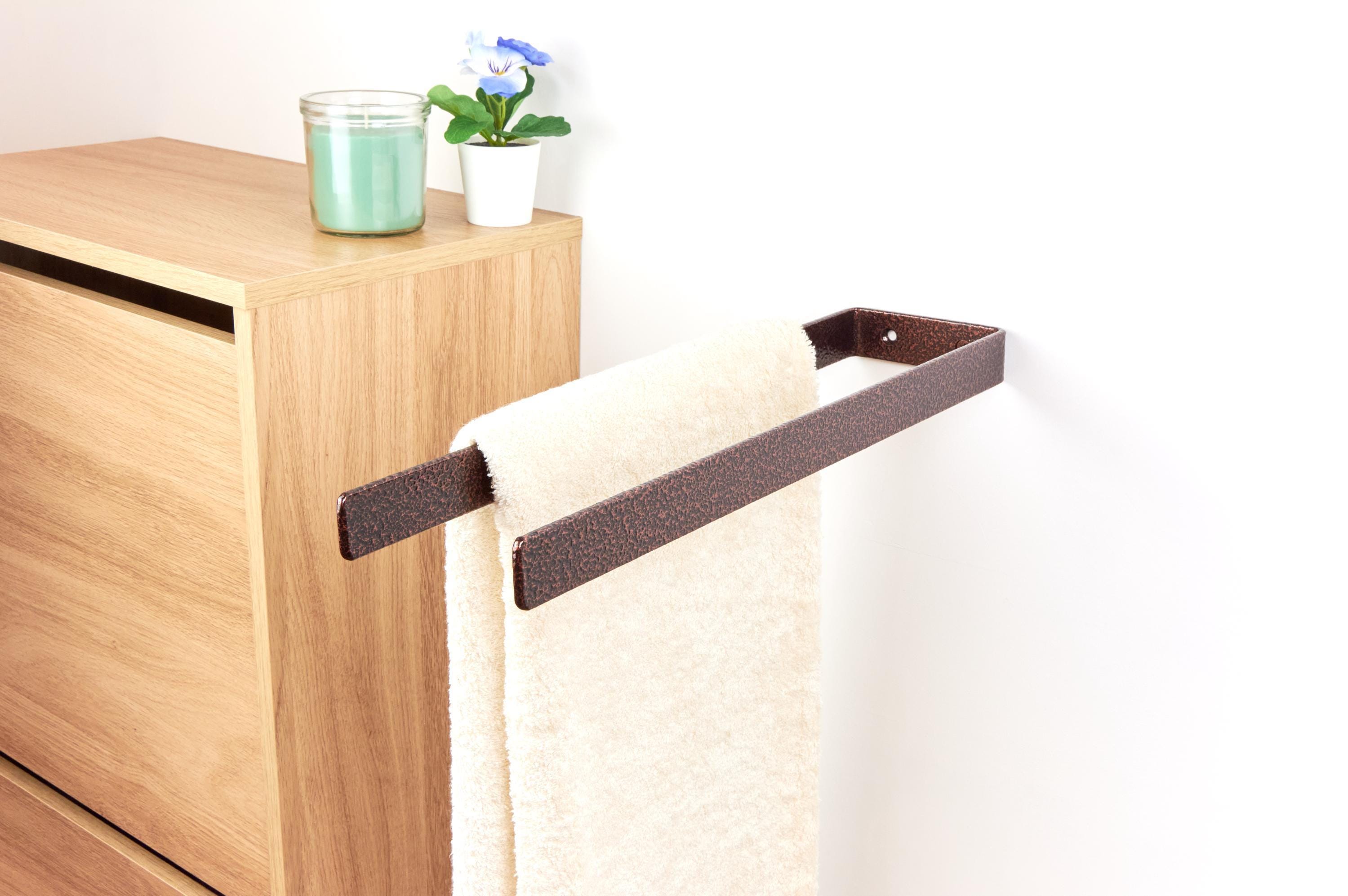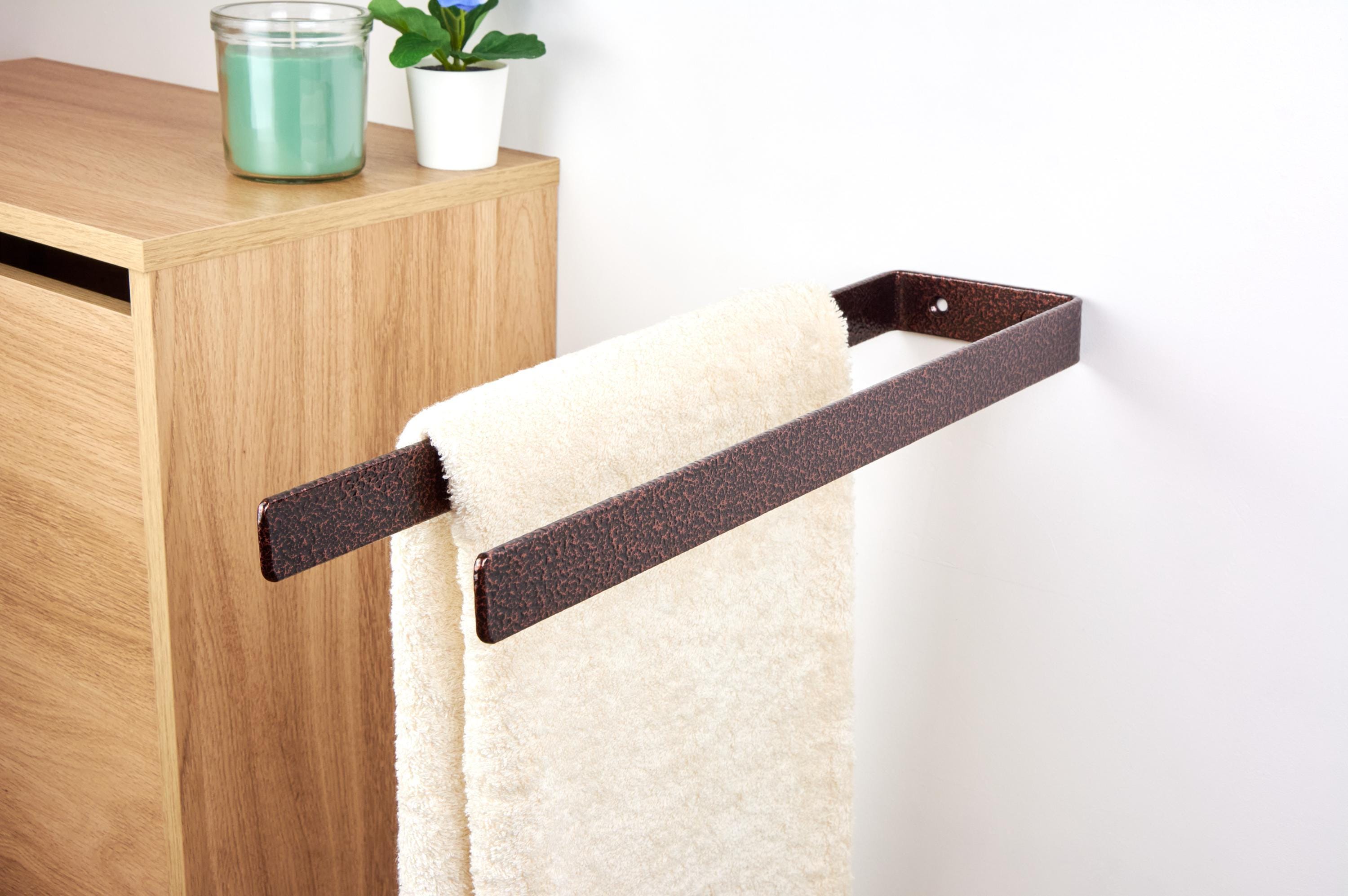 This metal double towel holder is a sleek wall mounted bathroom towel rack and a practical piece of home bath hardware for everyday use! The color of the product in the pictures is Antique Copper.