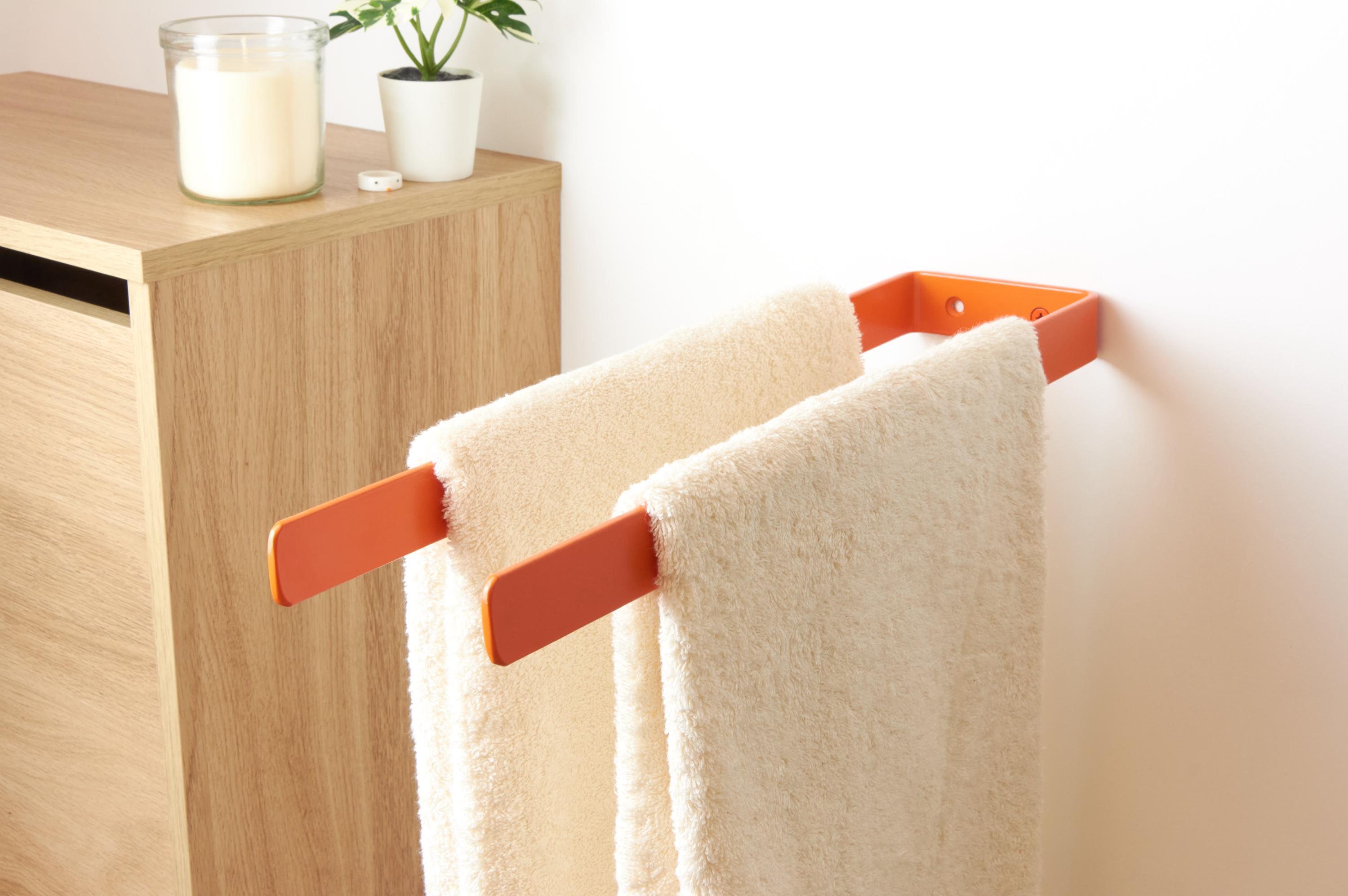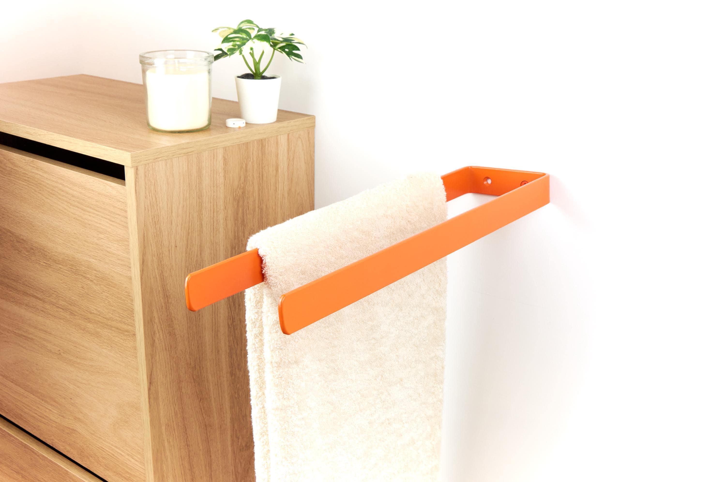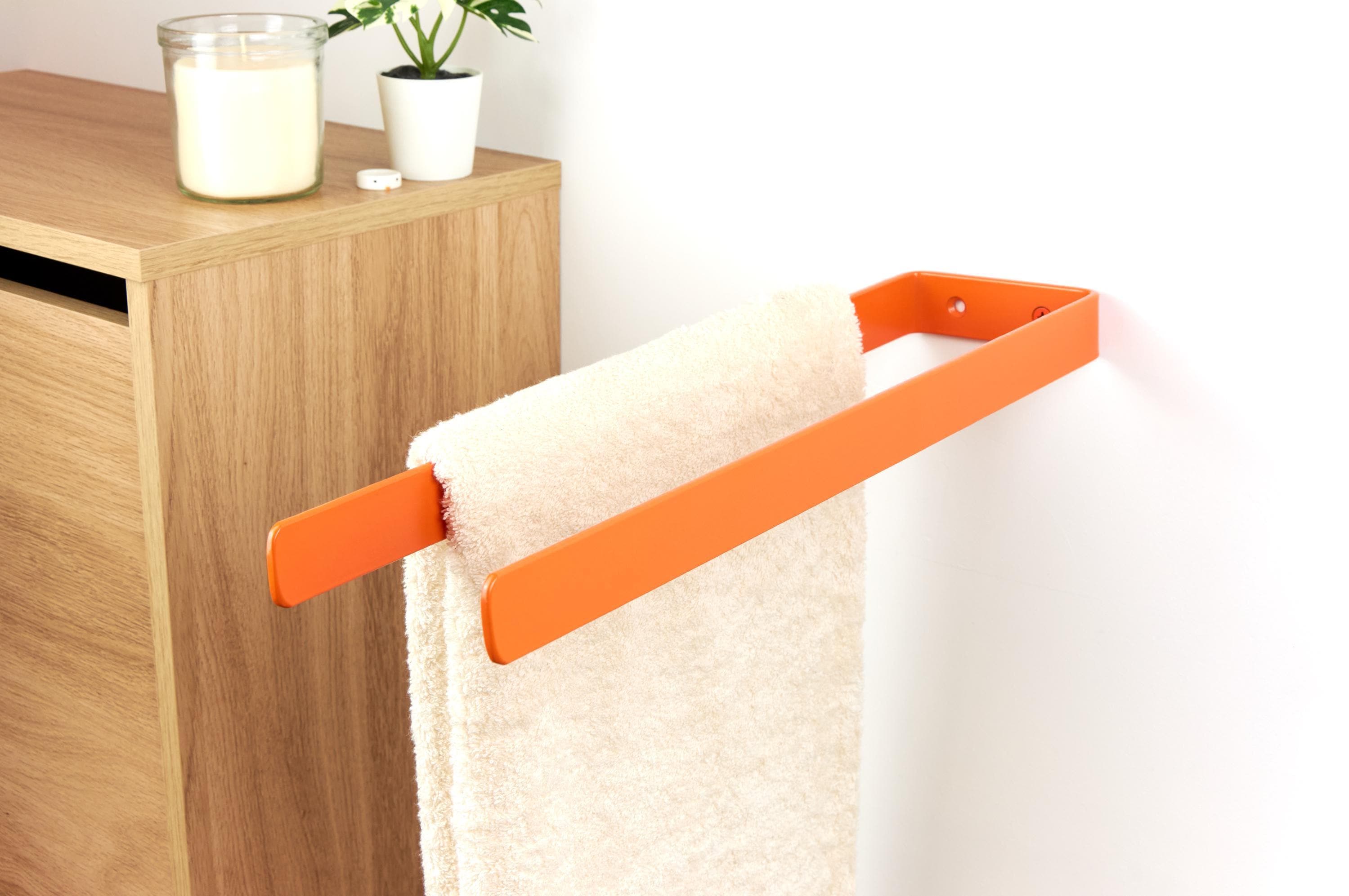 This double towel hanger is a sleek wall mounted towel organizer, perfect as a contemporary bath accessory for stylish and functional storage! The color of the product in the pictures is Orange Matte.