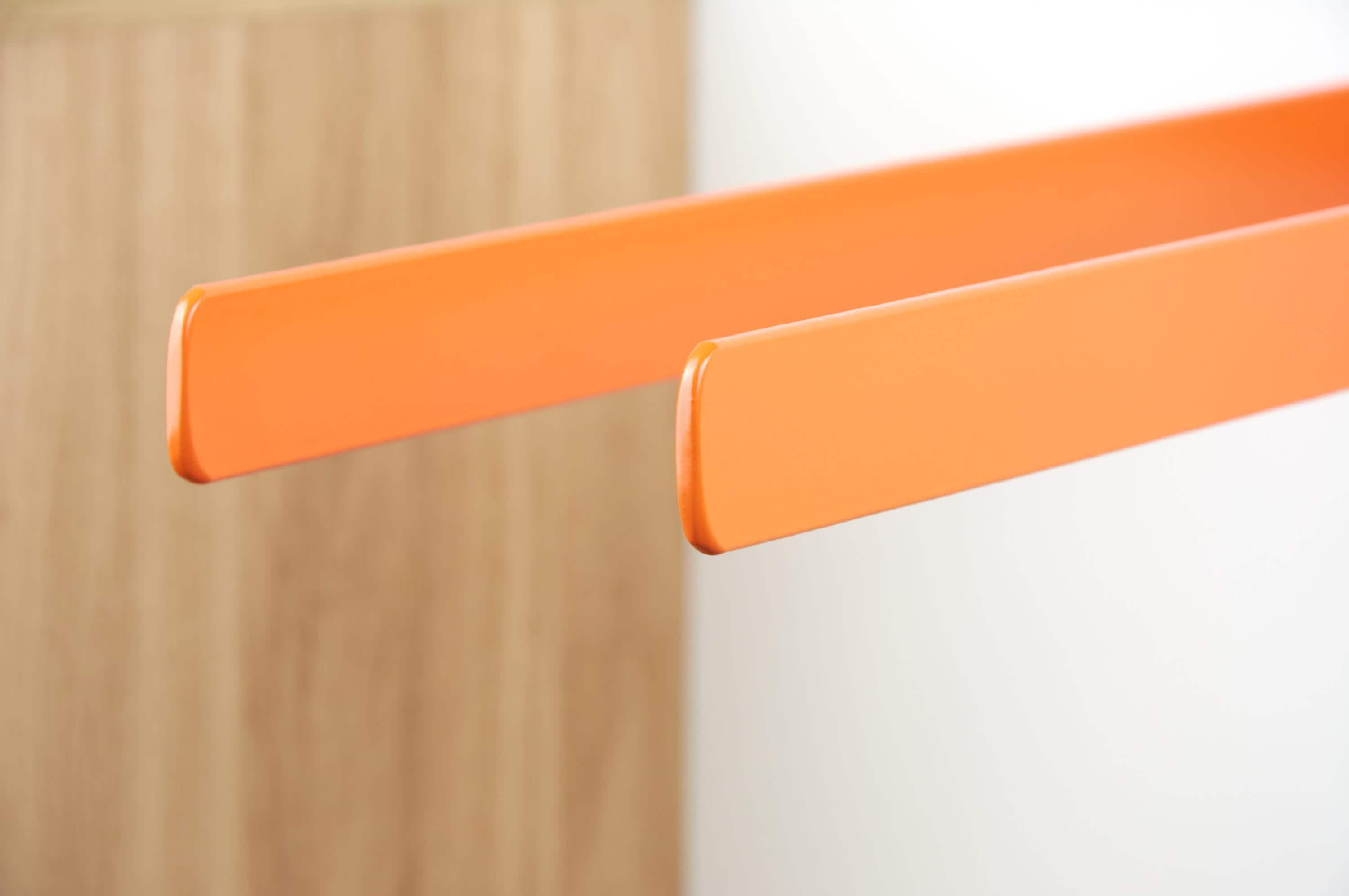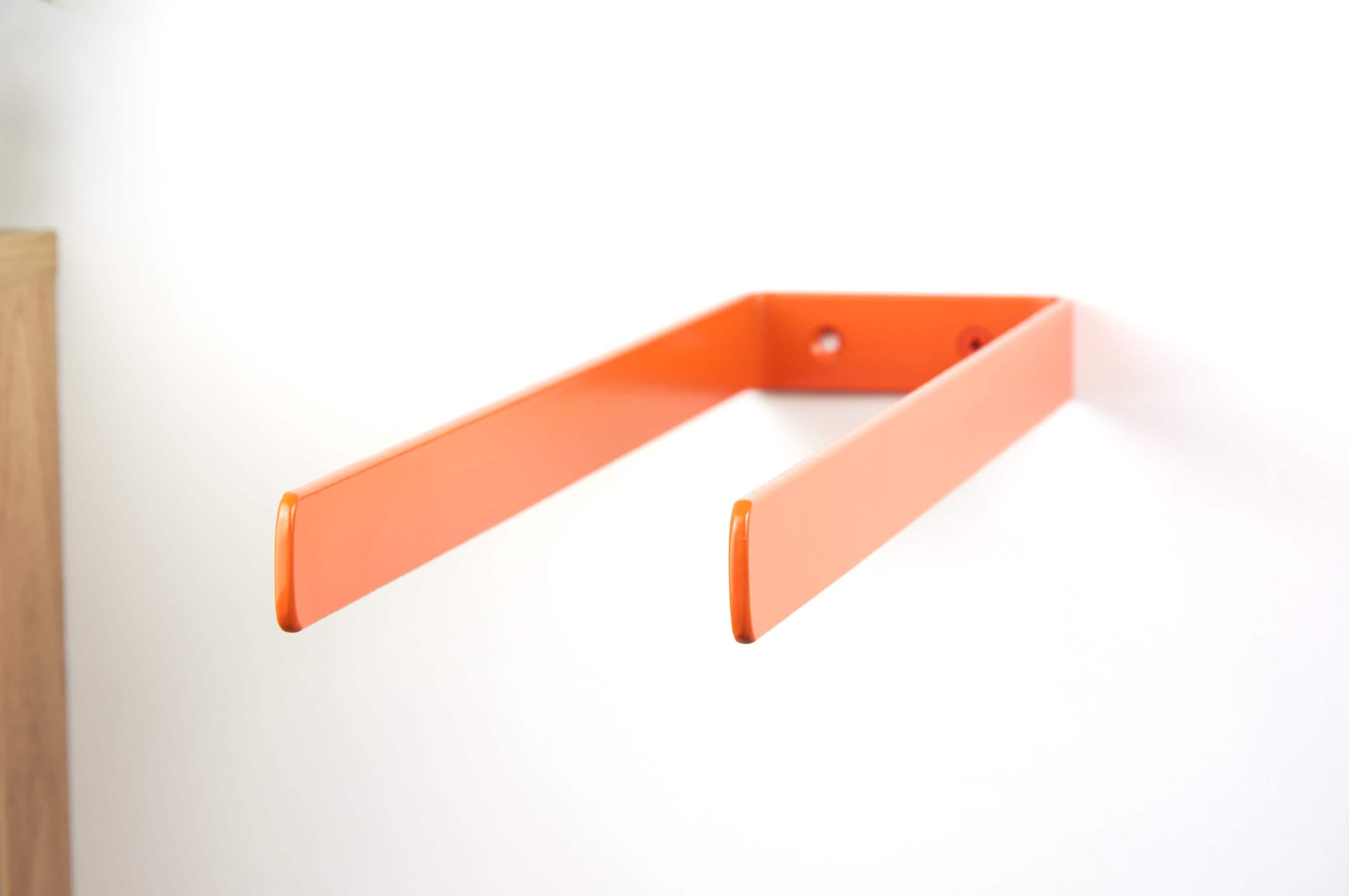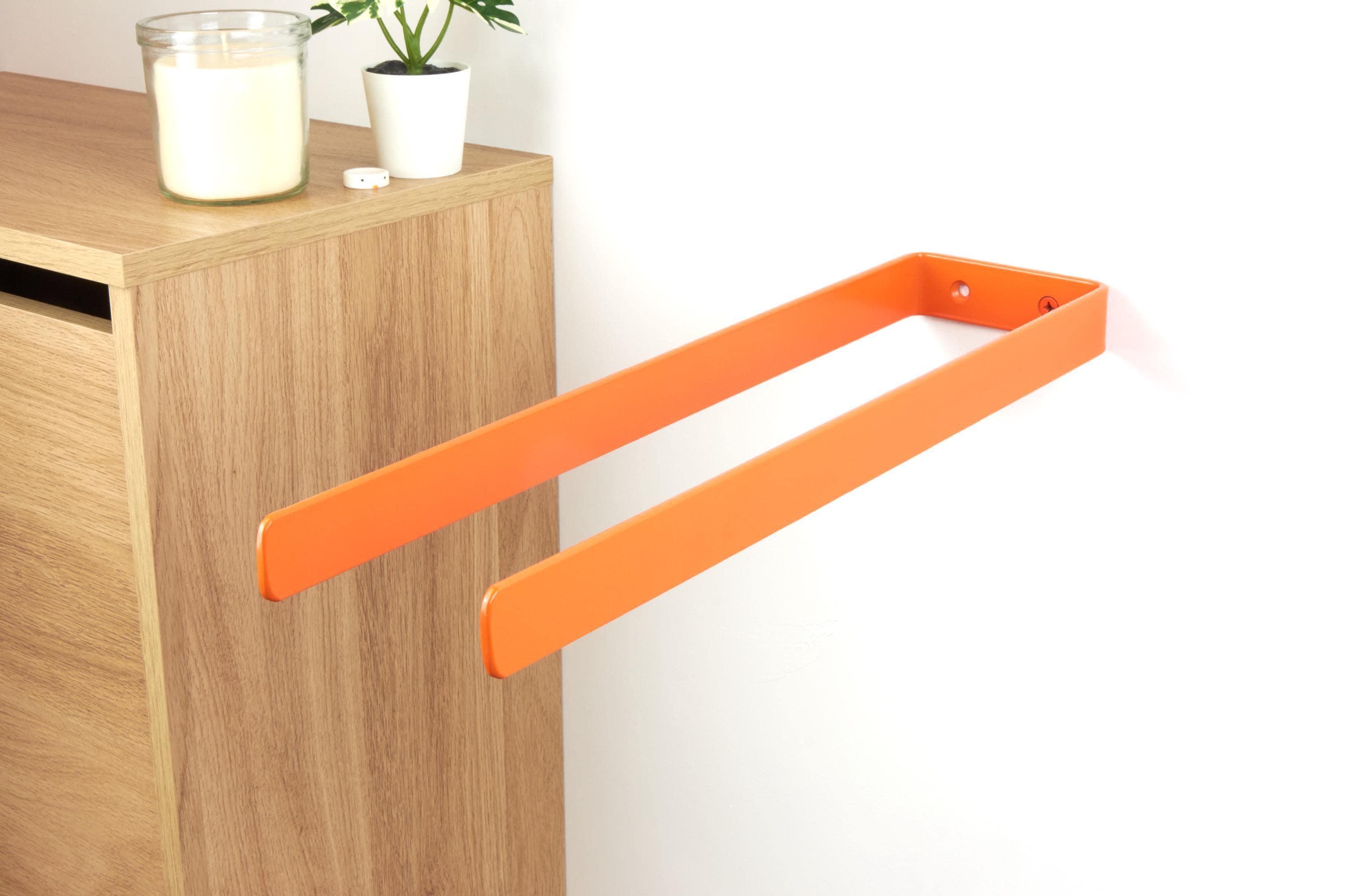 This double towel hanger is a sleek wall mounted towel organizer, perfect as a contemporary bath accessory for stylish and functional storage! The color of the product in the pictures is Orange Matte.