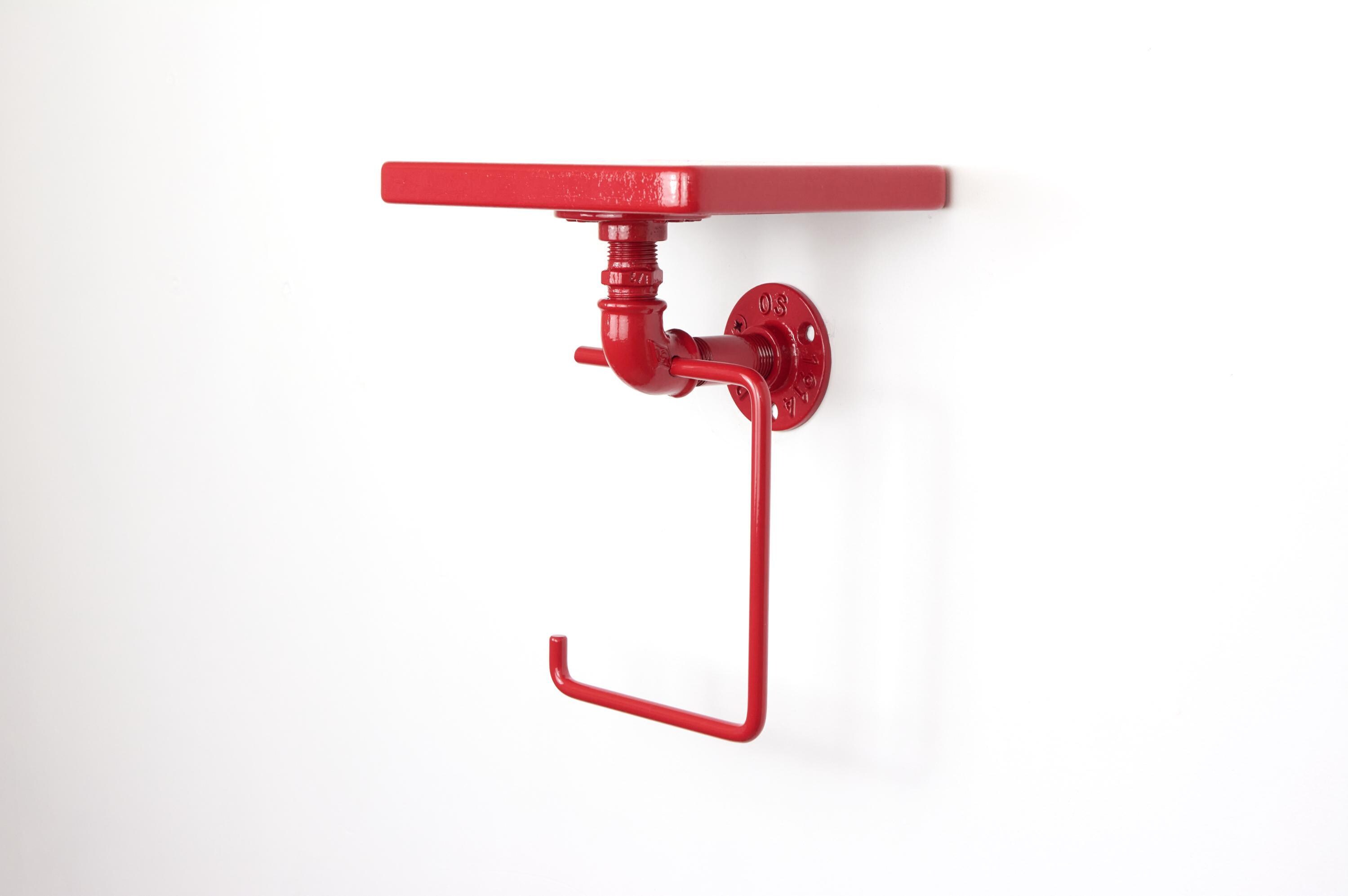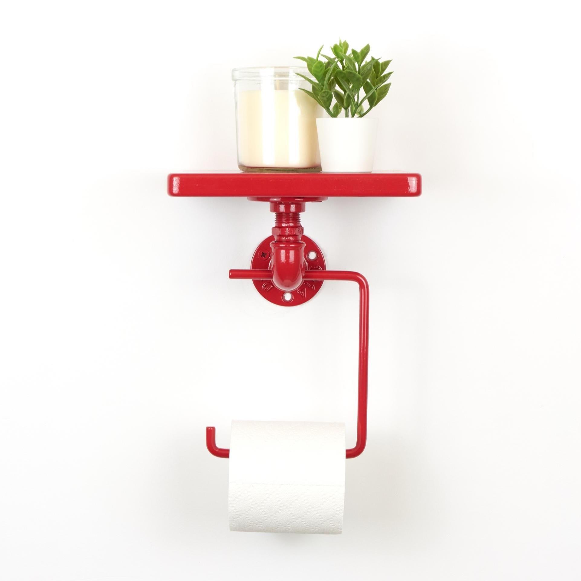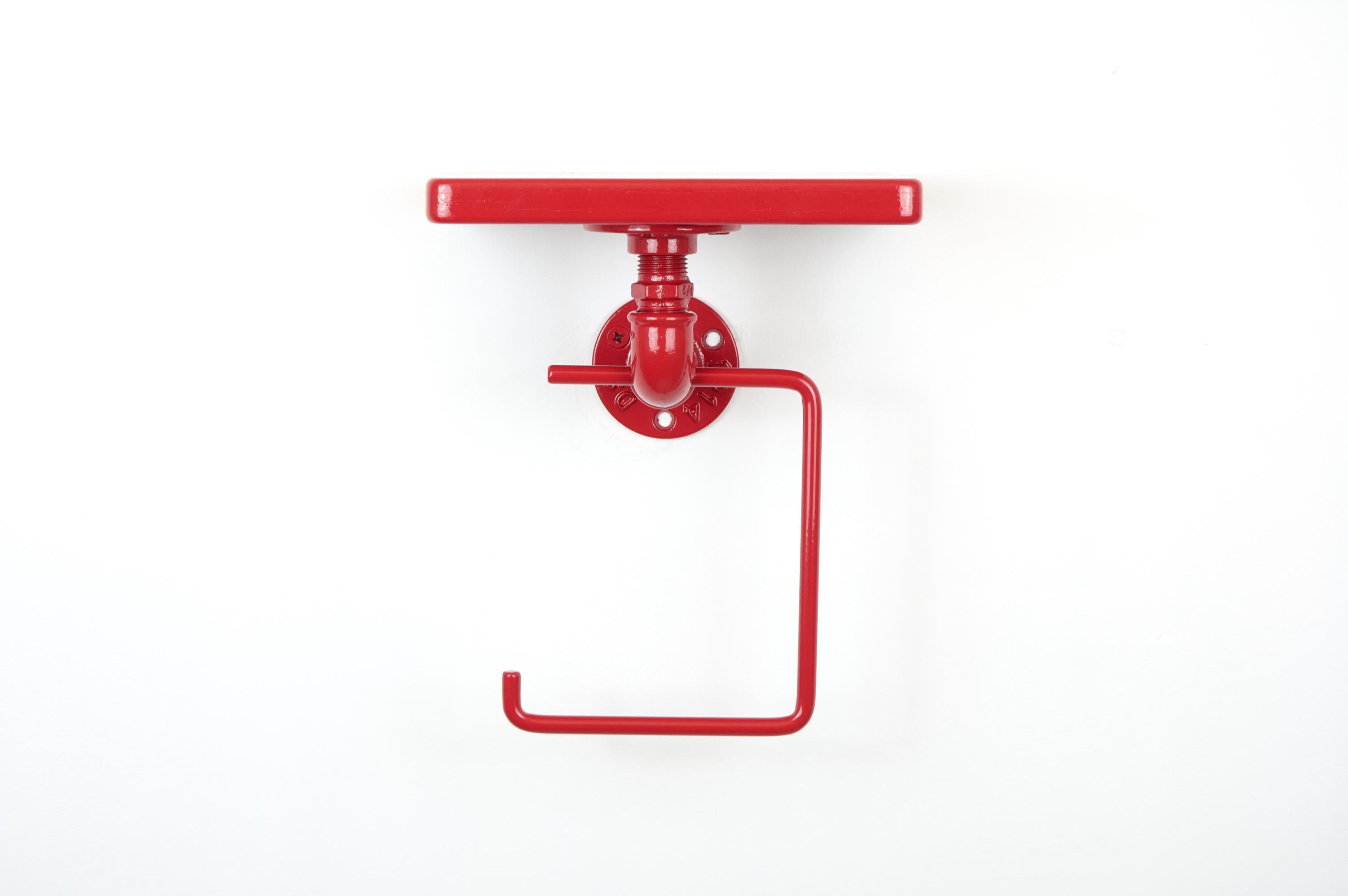 This modern toilet paper holder with shelf offers stylish bathroom storage and functions as a minimalist, sleek and functional home decor piece! The color of the product in the pictures is Red Gloss.