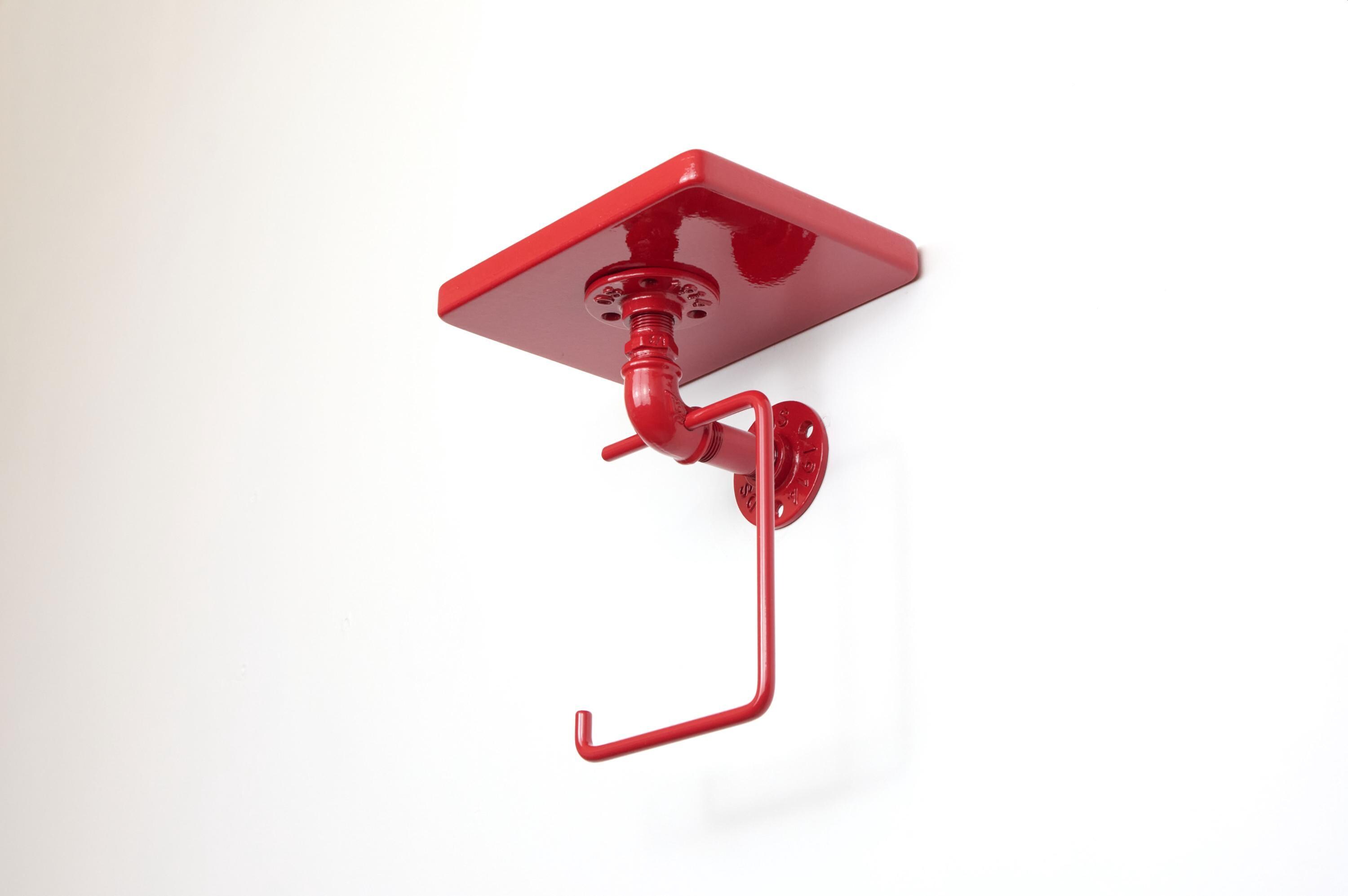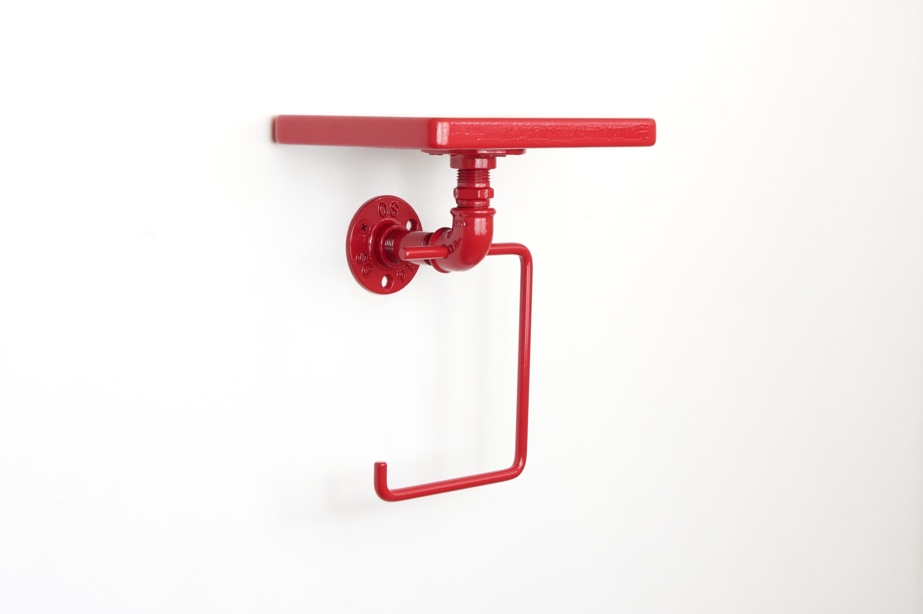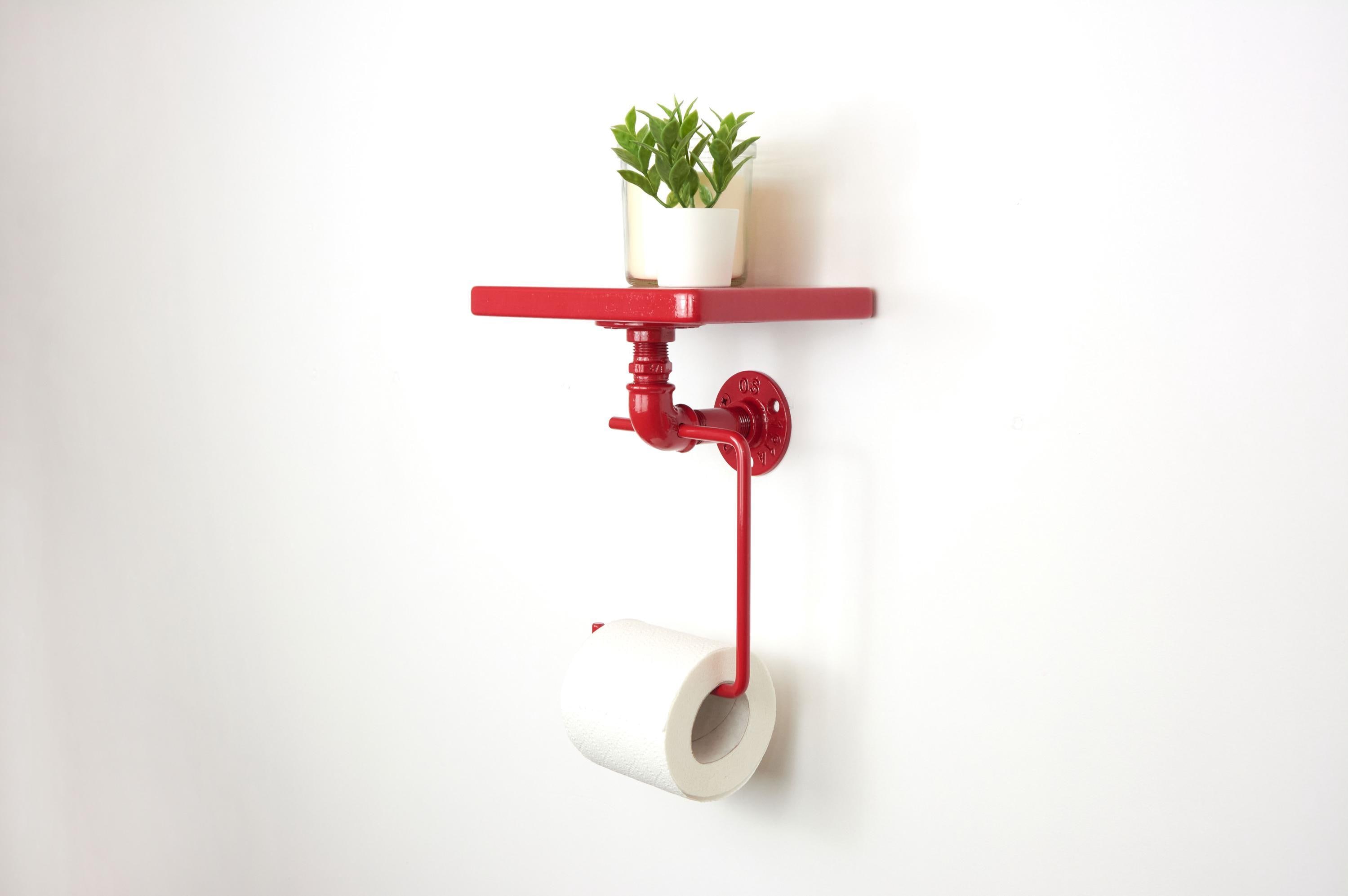 This modern toilet paper holder with shelf offers stylish bathroom storage and functions as a minimalist, sleek and functional home decor piece! The color of the product in the pictures is Red Gloss.
