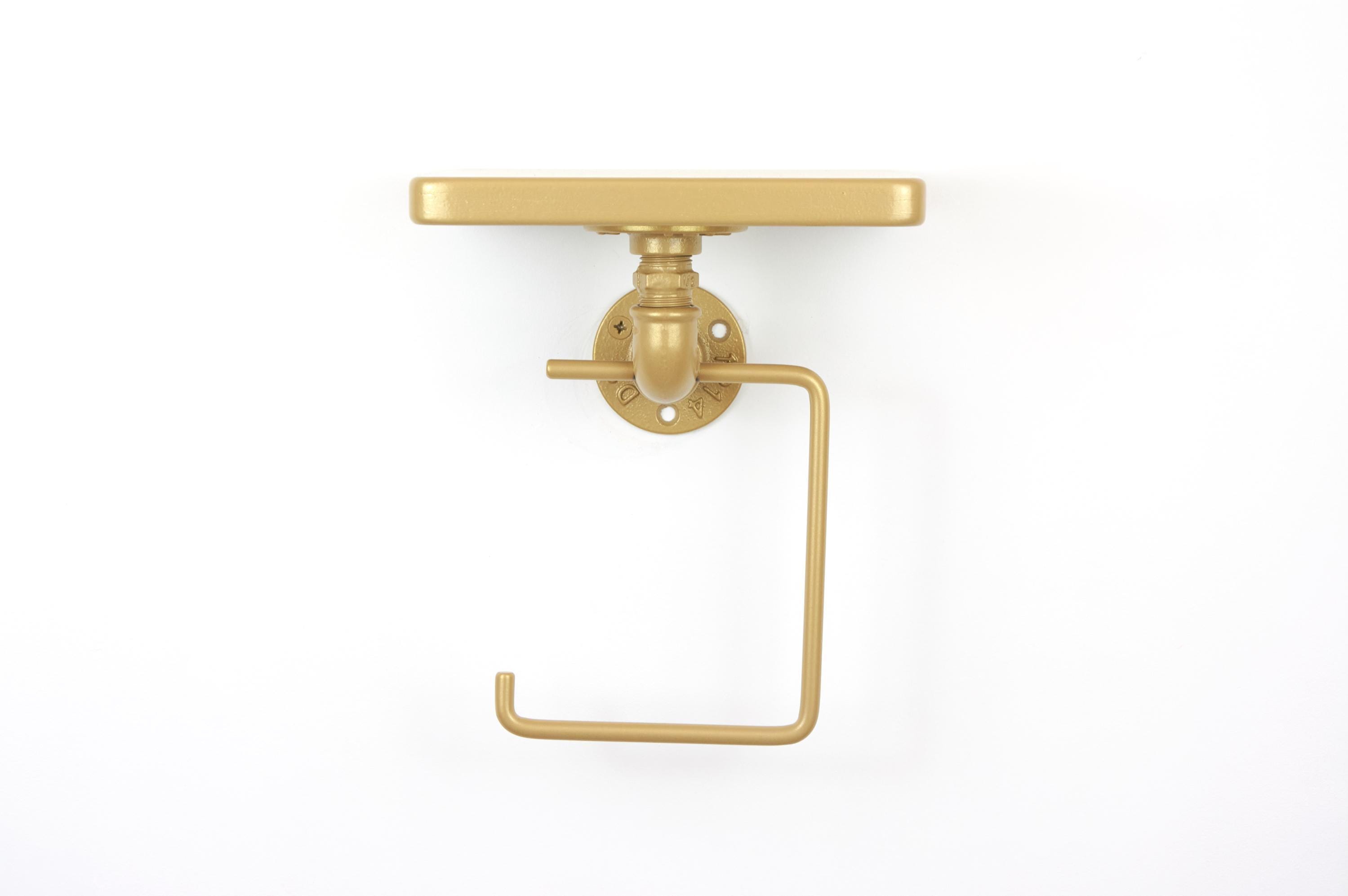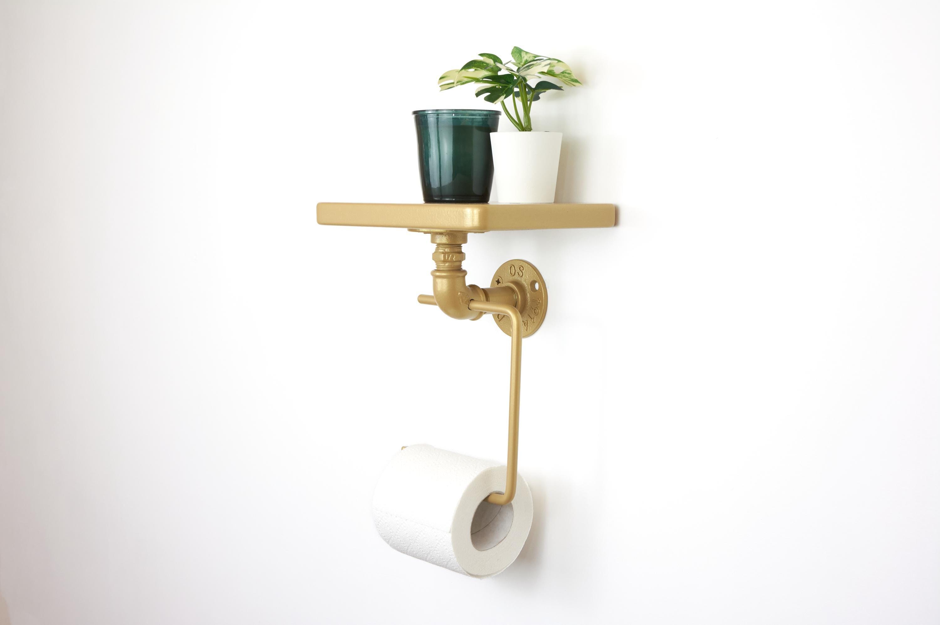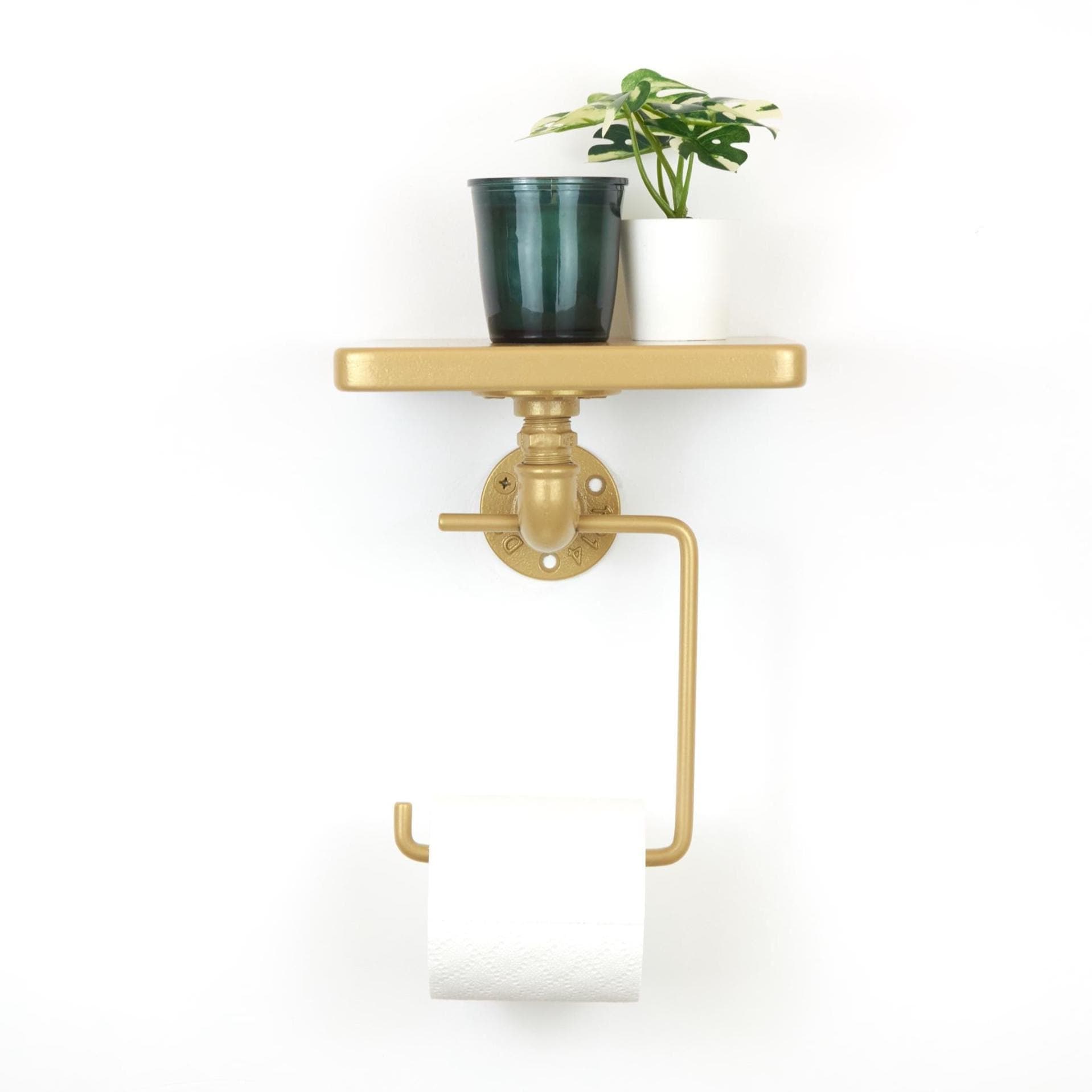 This modern toilet paper roll holder with shelf is a sleek wall mounted bathroom storage solution and a stylish minimalist bath accessory for any space! The color of the product in the pictures is Champagne Gold.