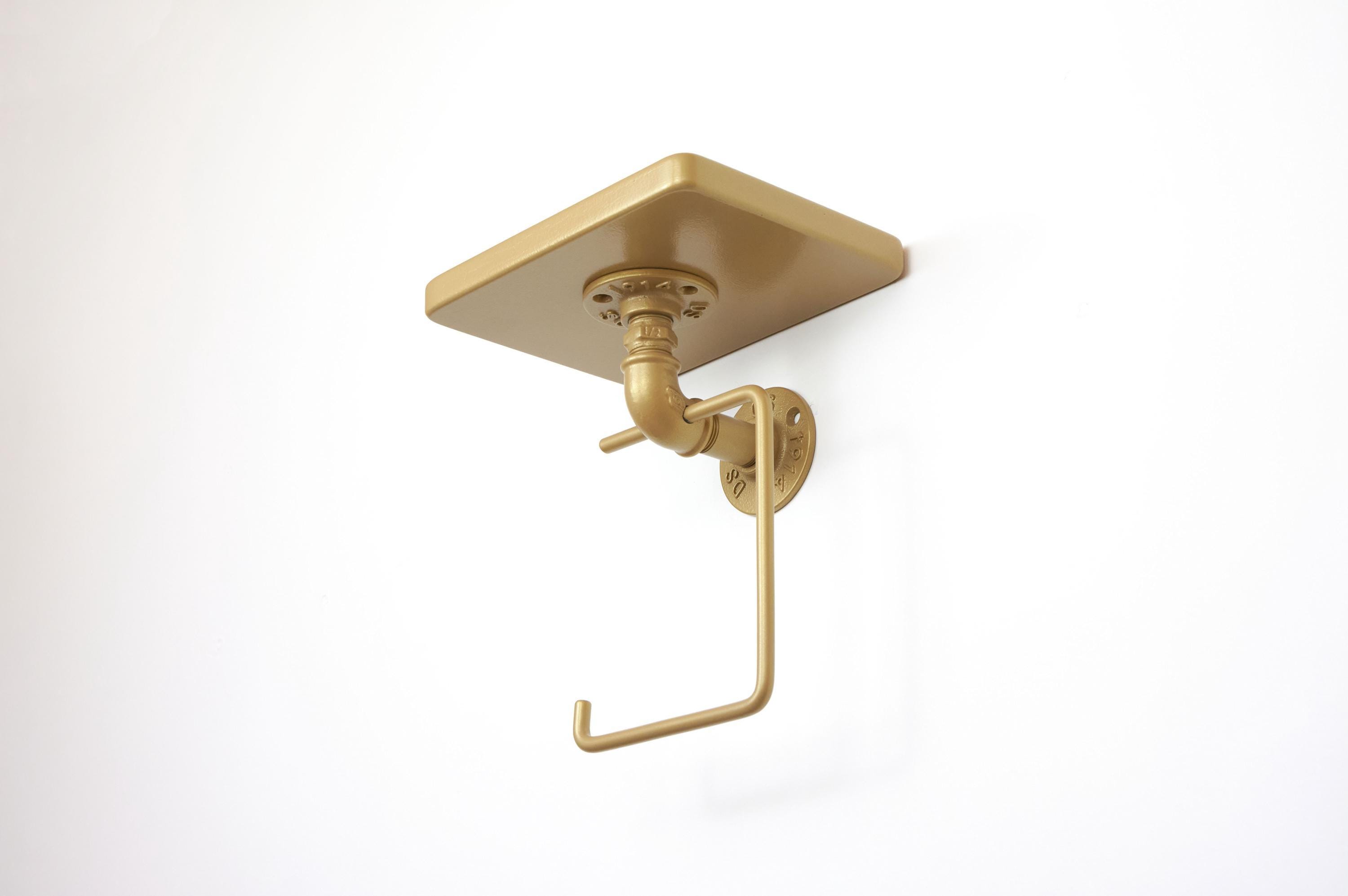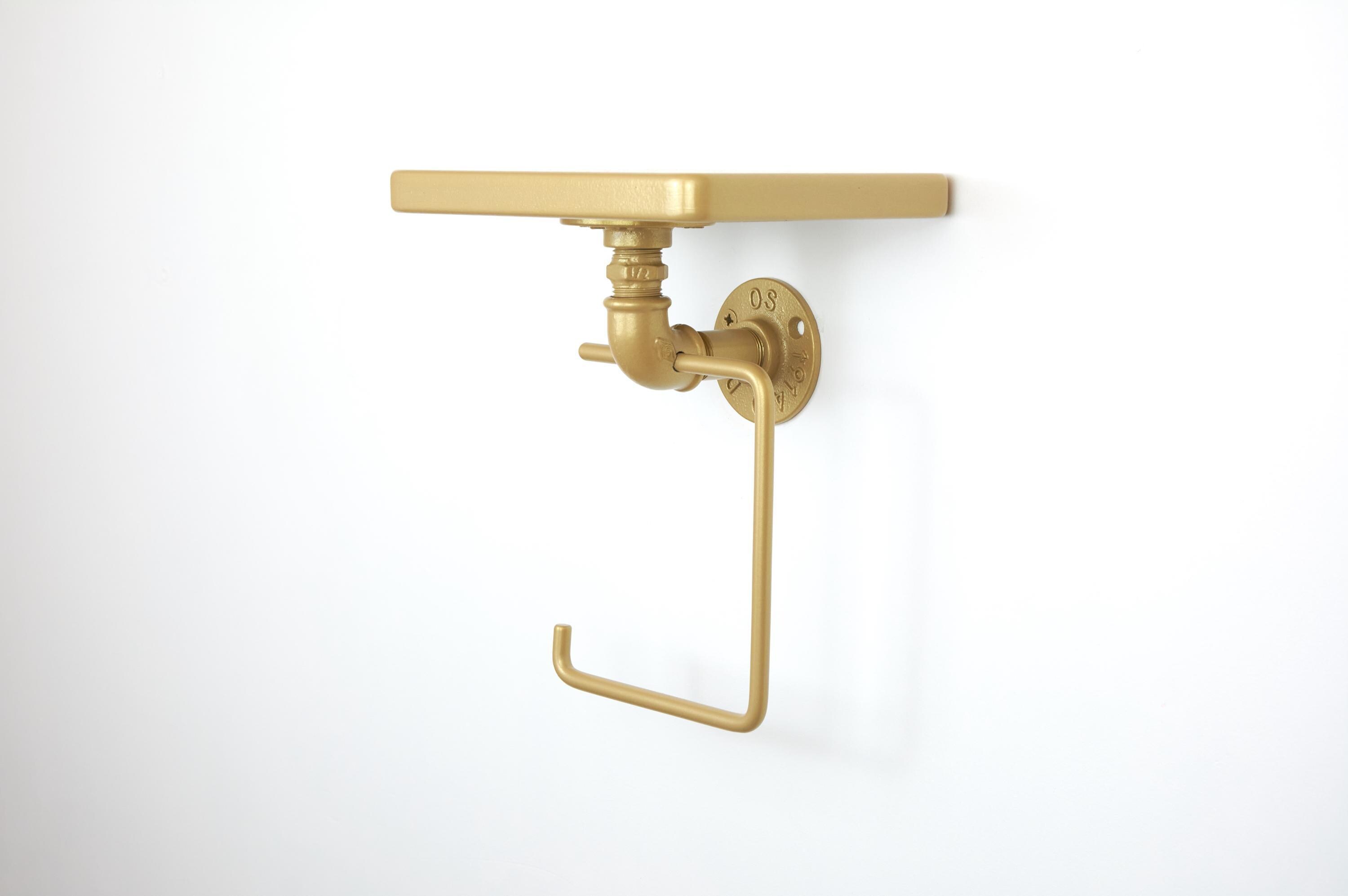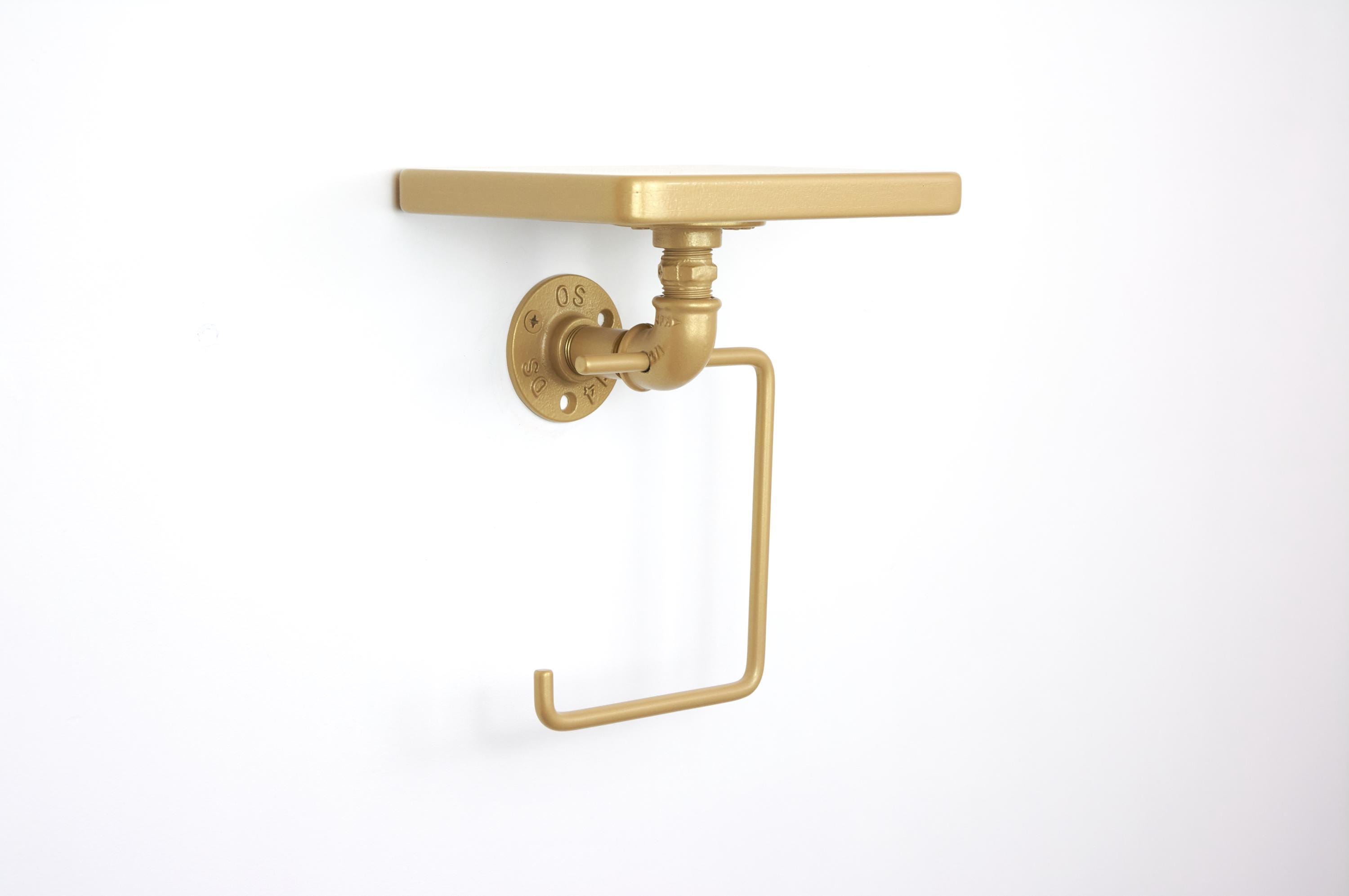 This modern toilet paper roll holder with shelf is a sleek wall mounted bathroom storage solution and a stylish minimalist bath accessory for any space! The color of the product in the pictures is Champagne Gold.