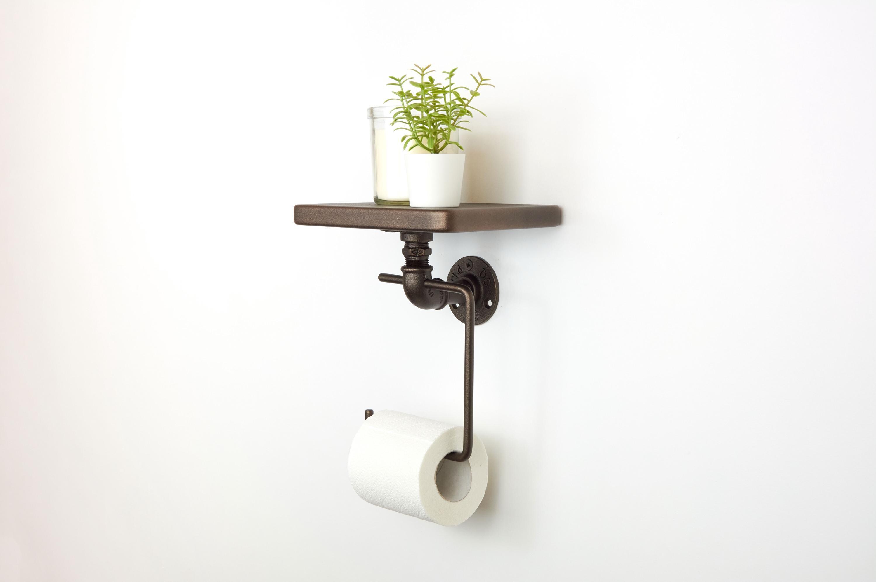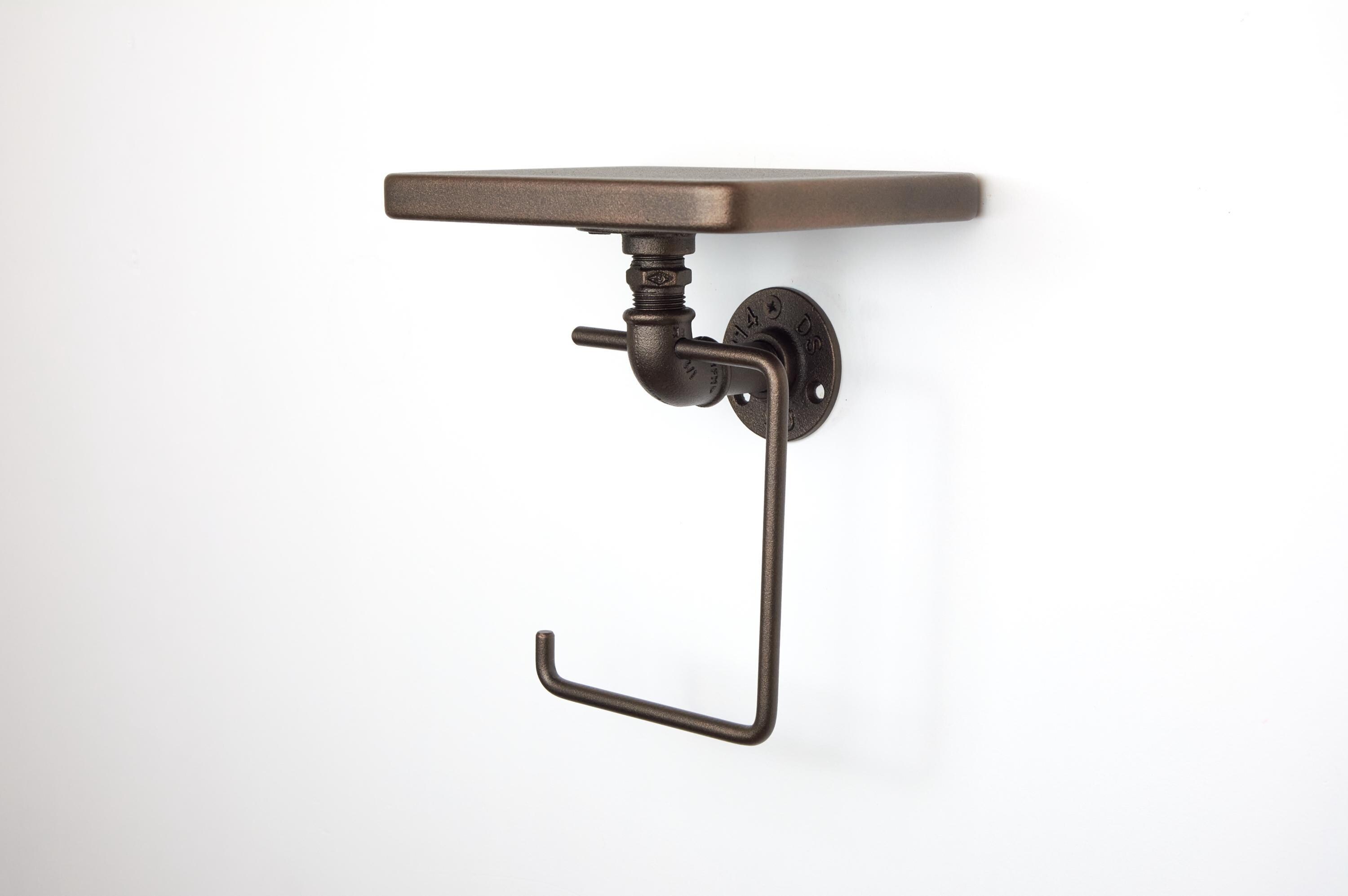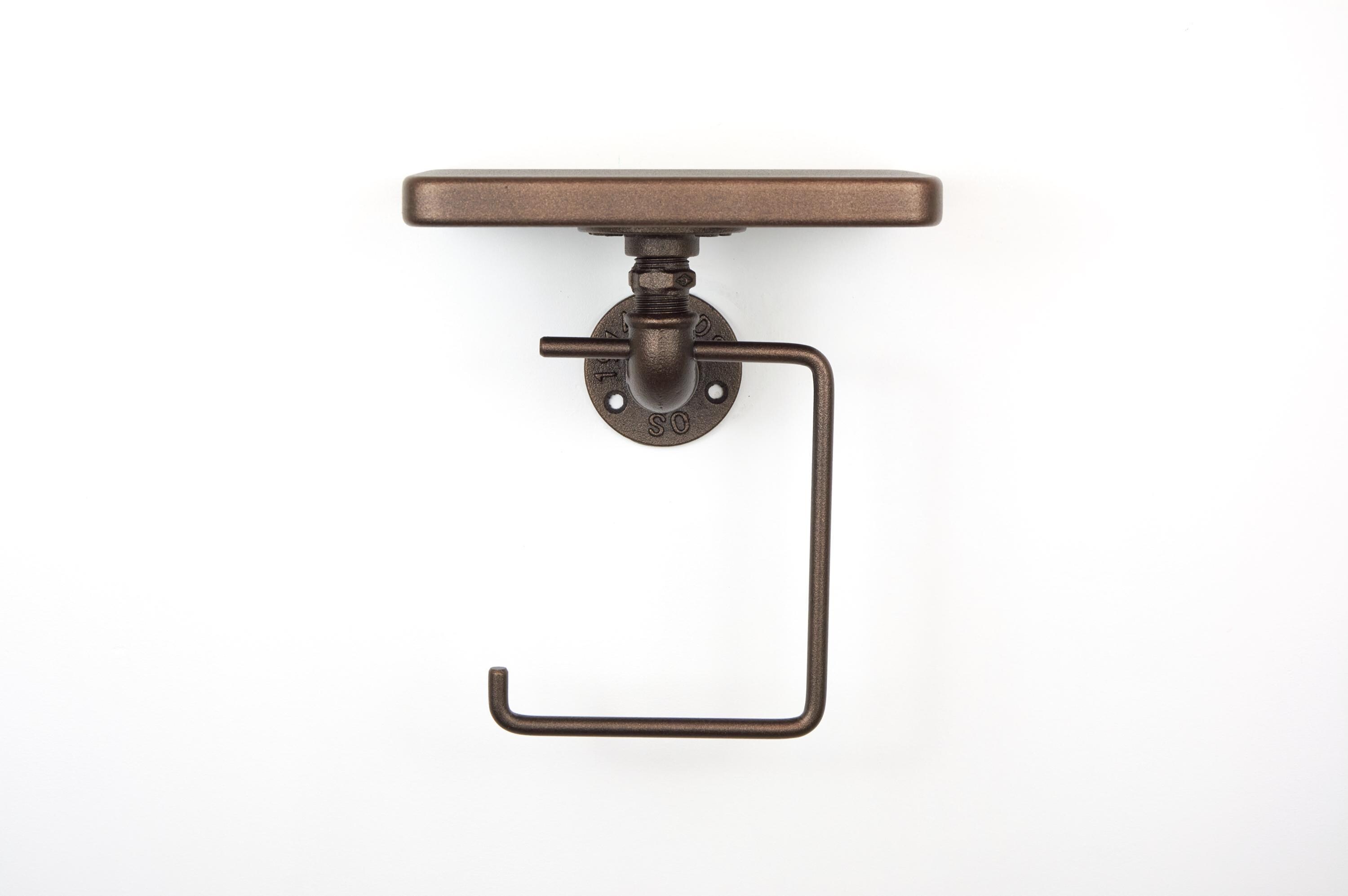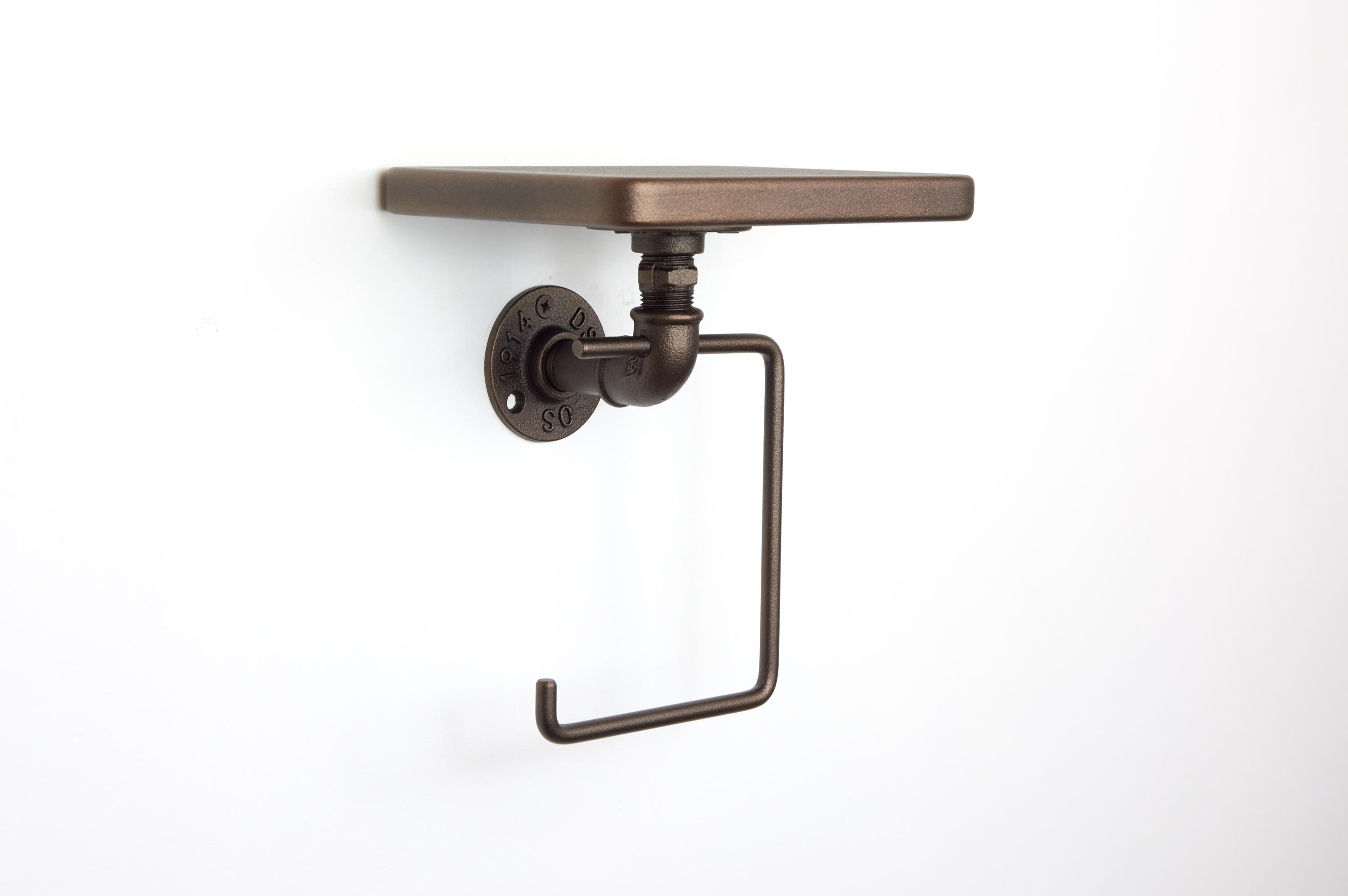 Add charm to your space with this toilet paper roll holder with shelf, a rustic bathroom storage organizer and a practical home decor gift for any occasion! The color of the product in the pictures is Sand Textured Bronze.