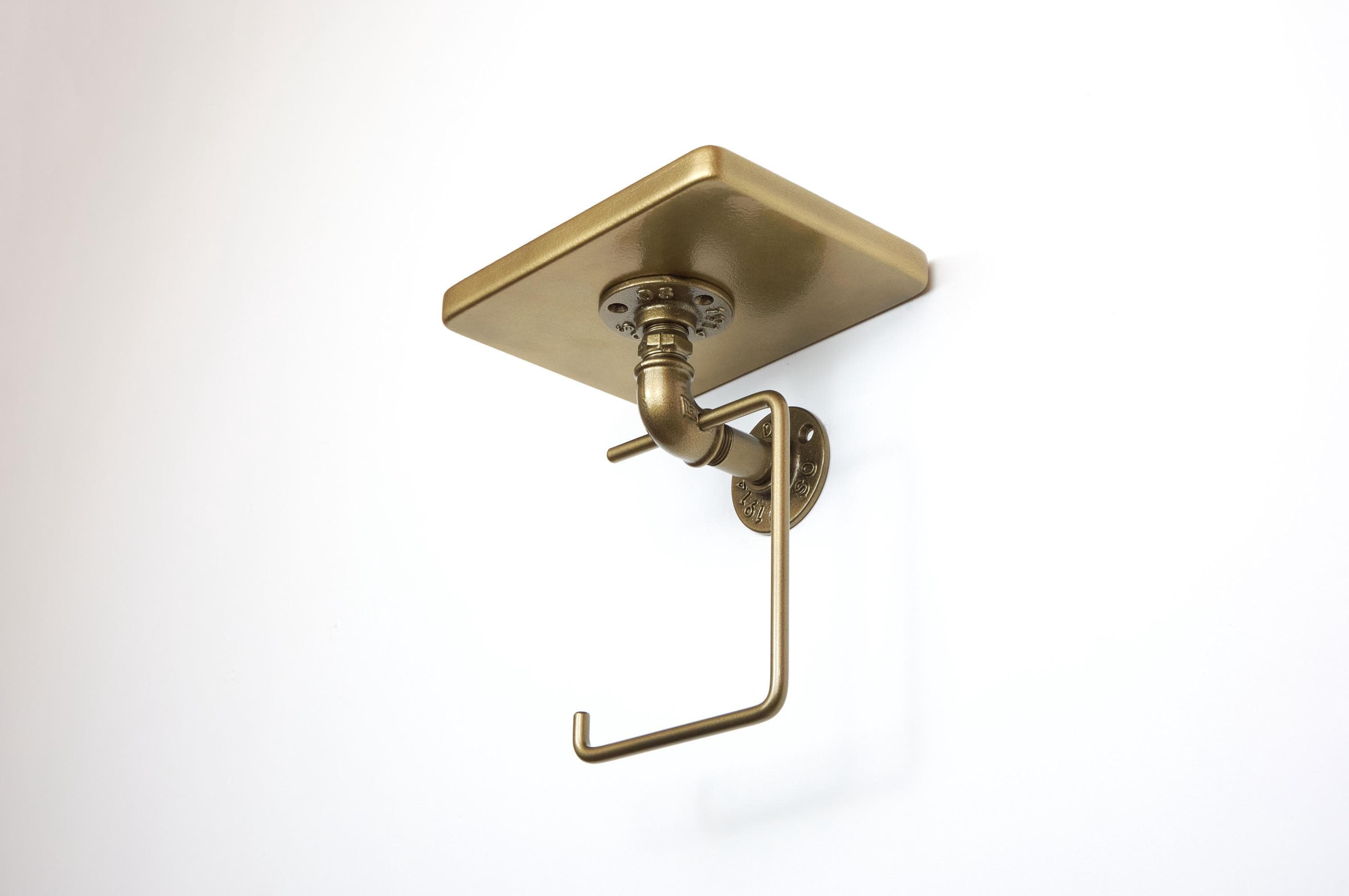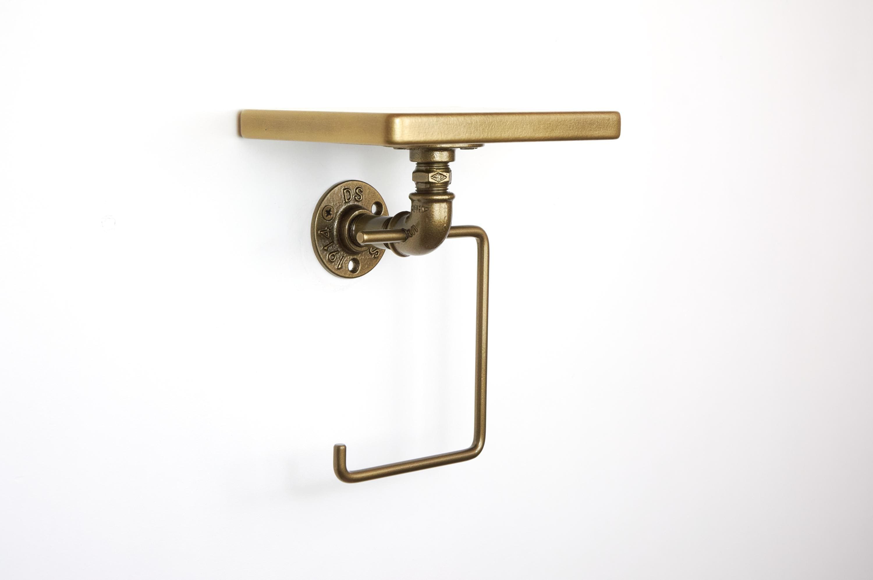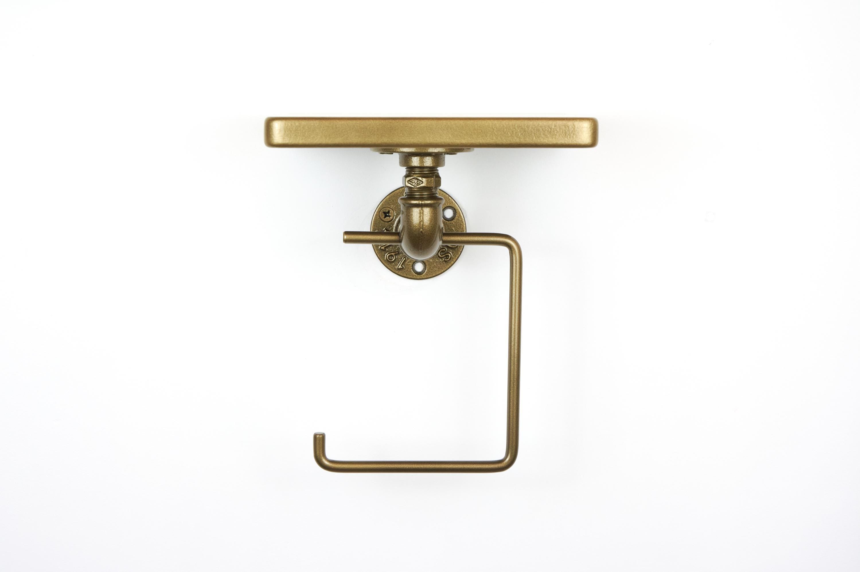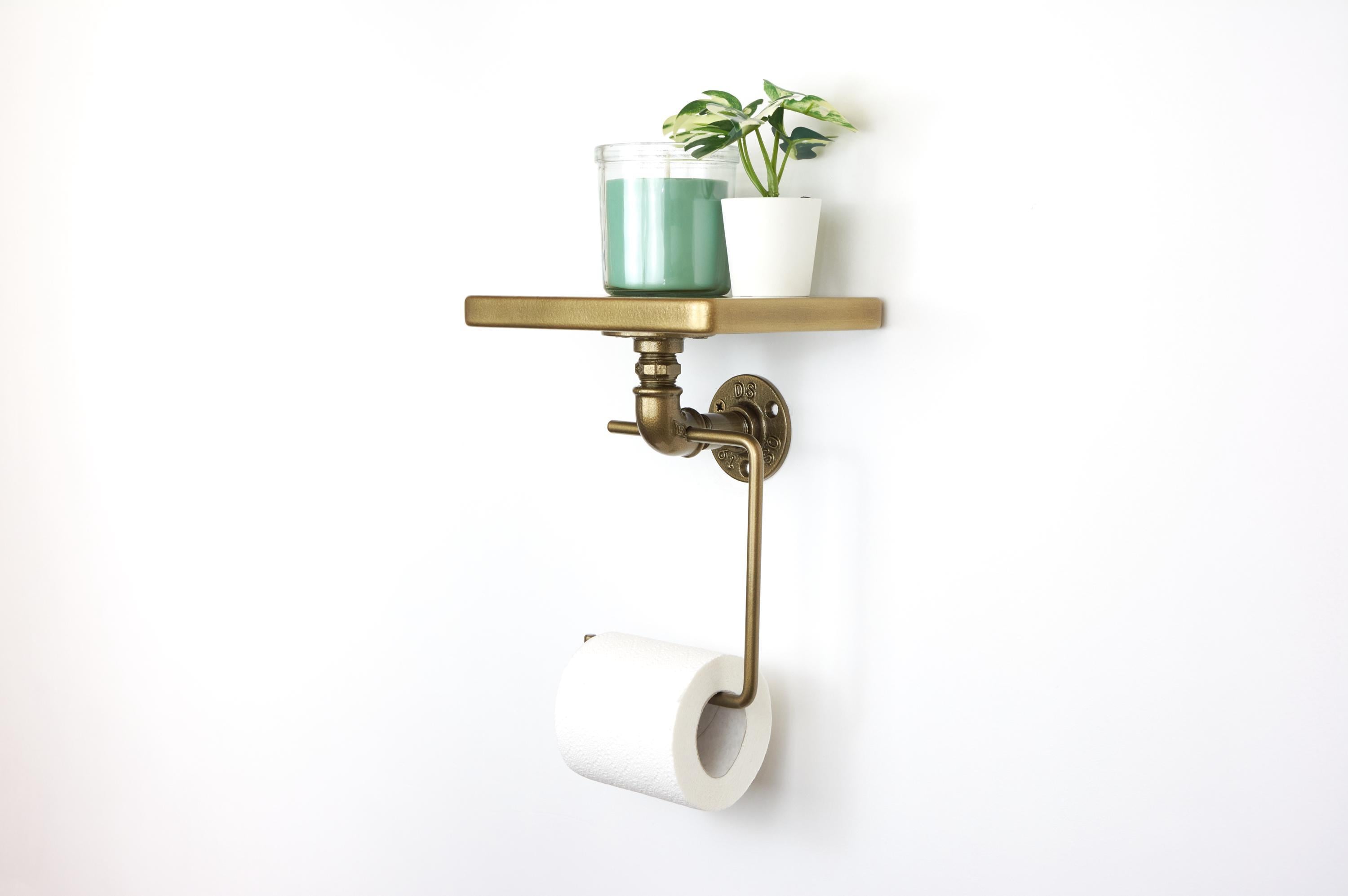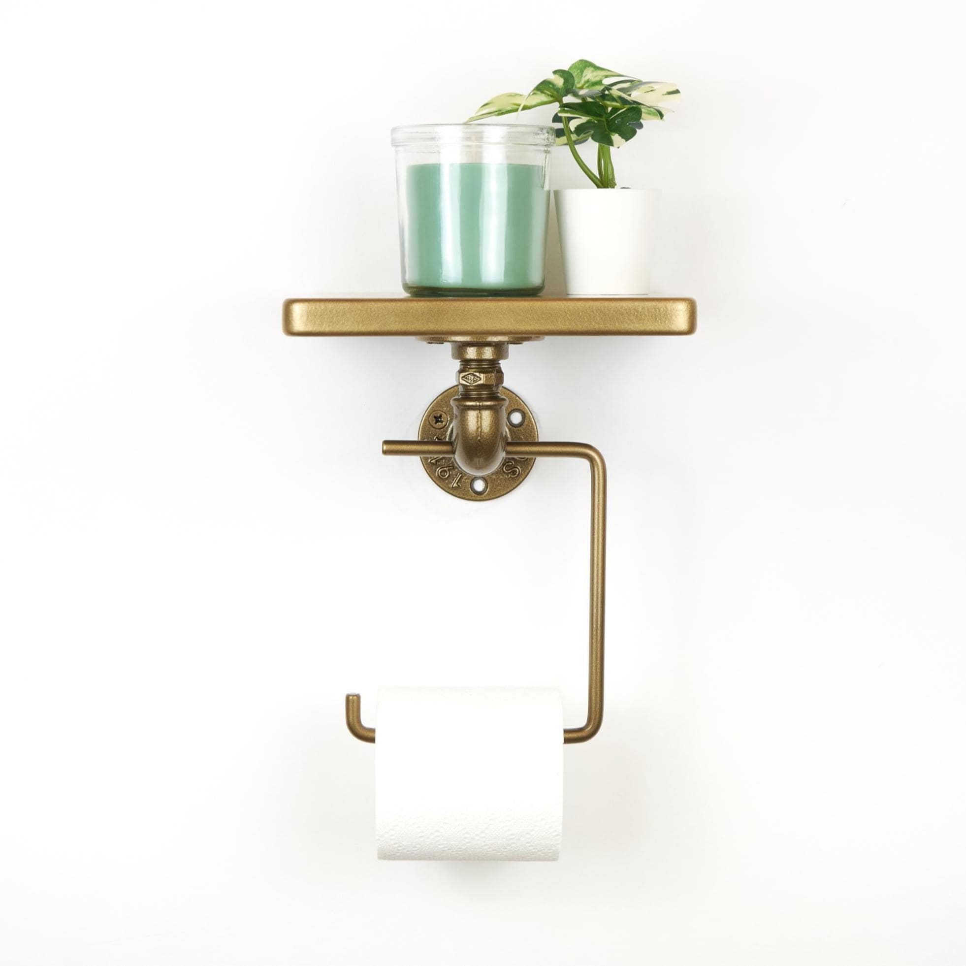 This toilet paper roll holder with shelf is a sturdy bathroom accessory designed for easy reach, making it a practical housewarming gift for any home! The color of the product in the pictures is Aged Brass.
