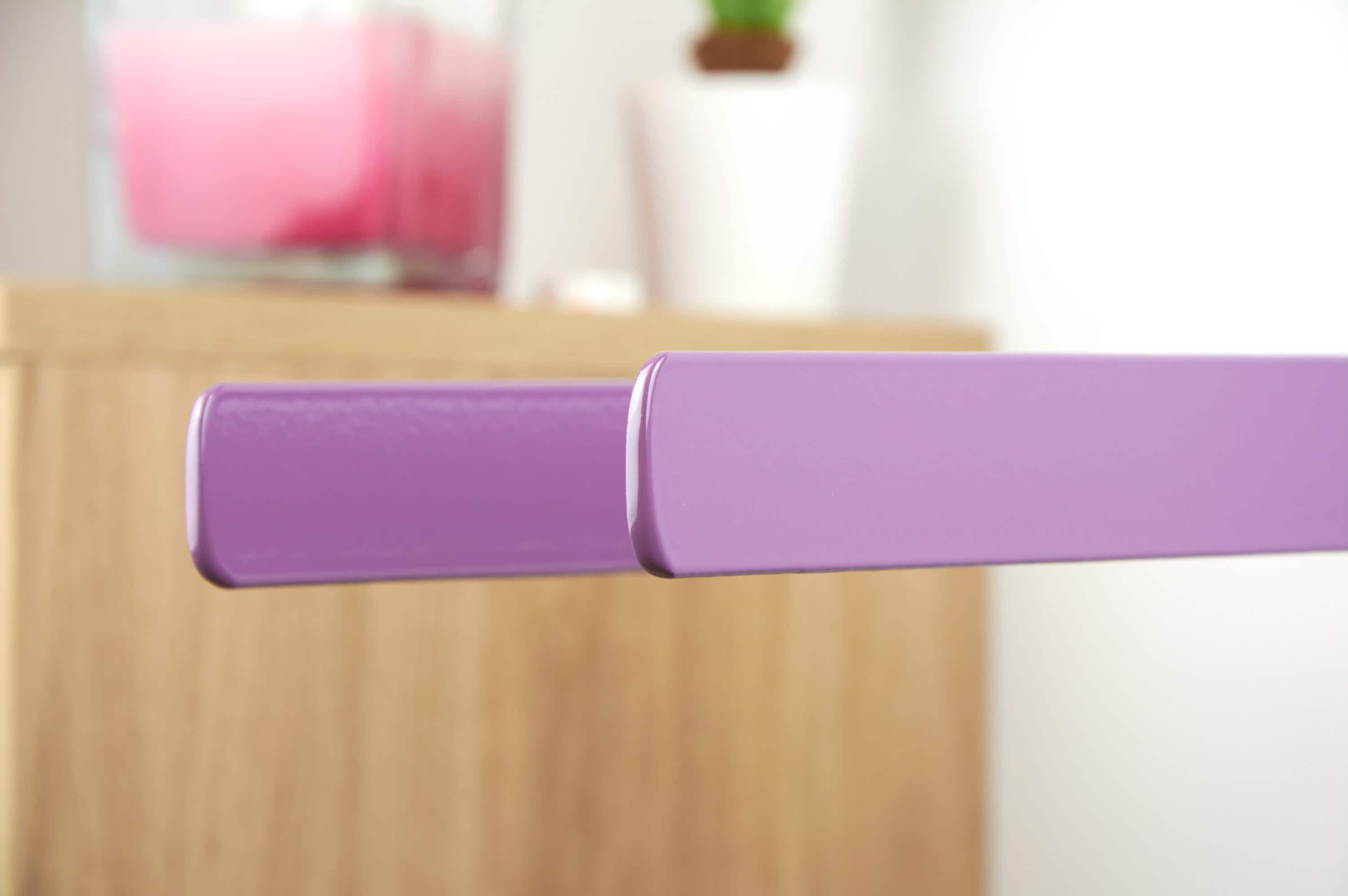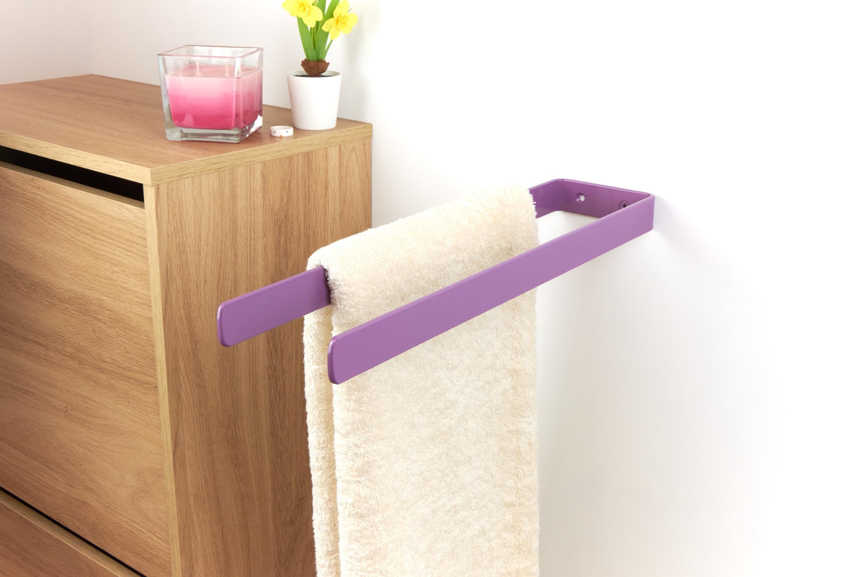 This double vibrant metal towel rack with a sleek minimalist design offers a functional dual towel rack solution for modern bathrooms! The color of the product in the pictures is Violet.