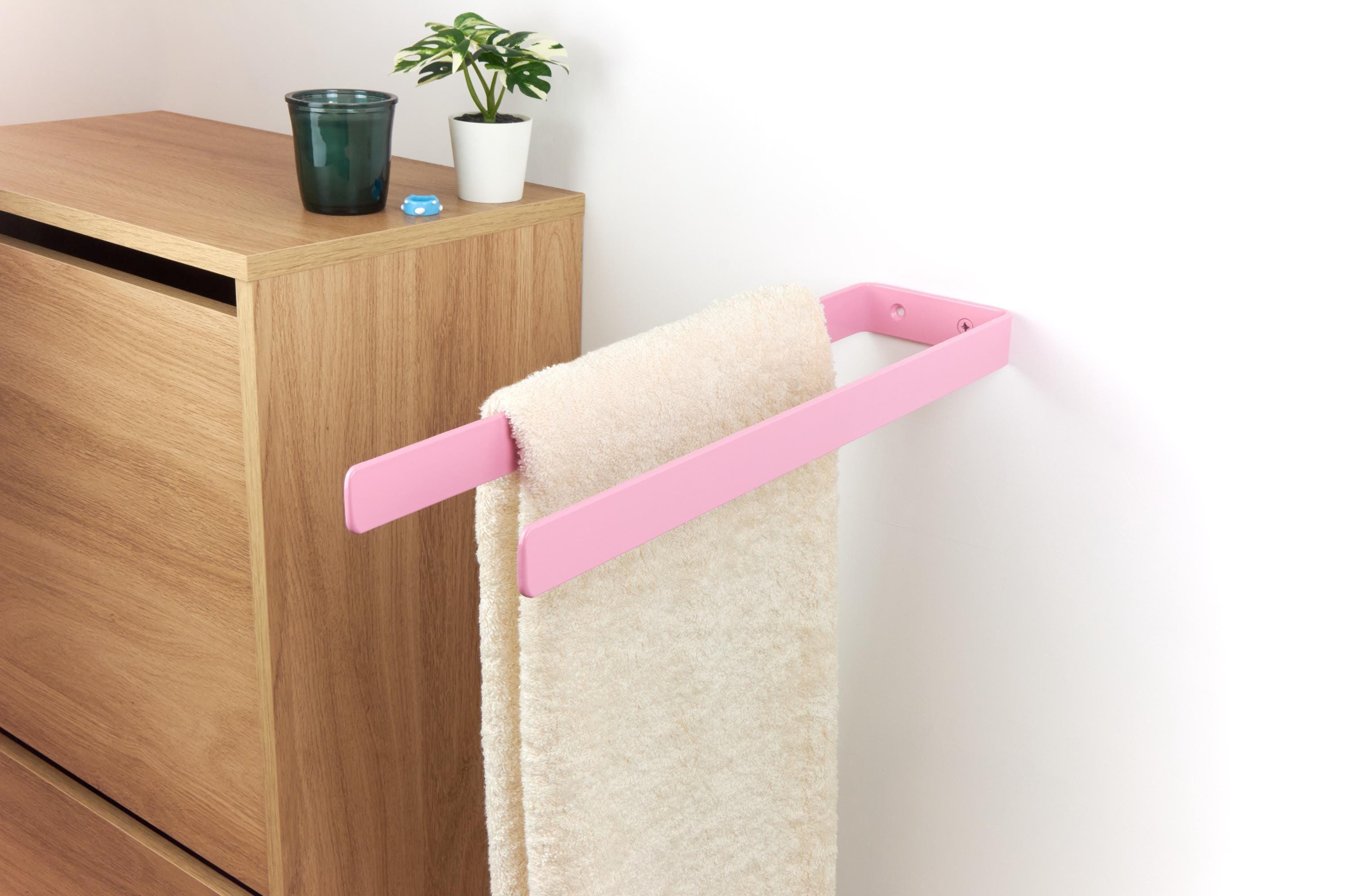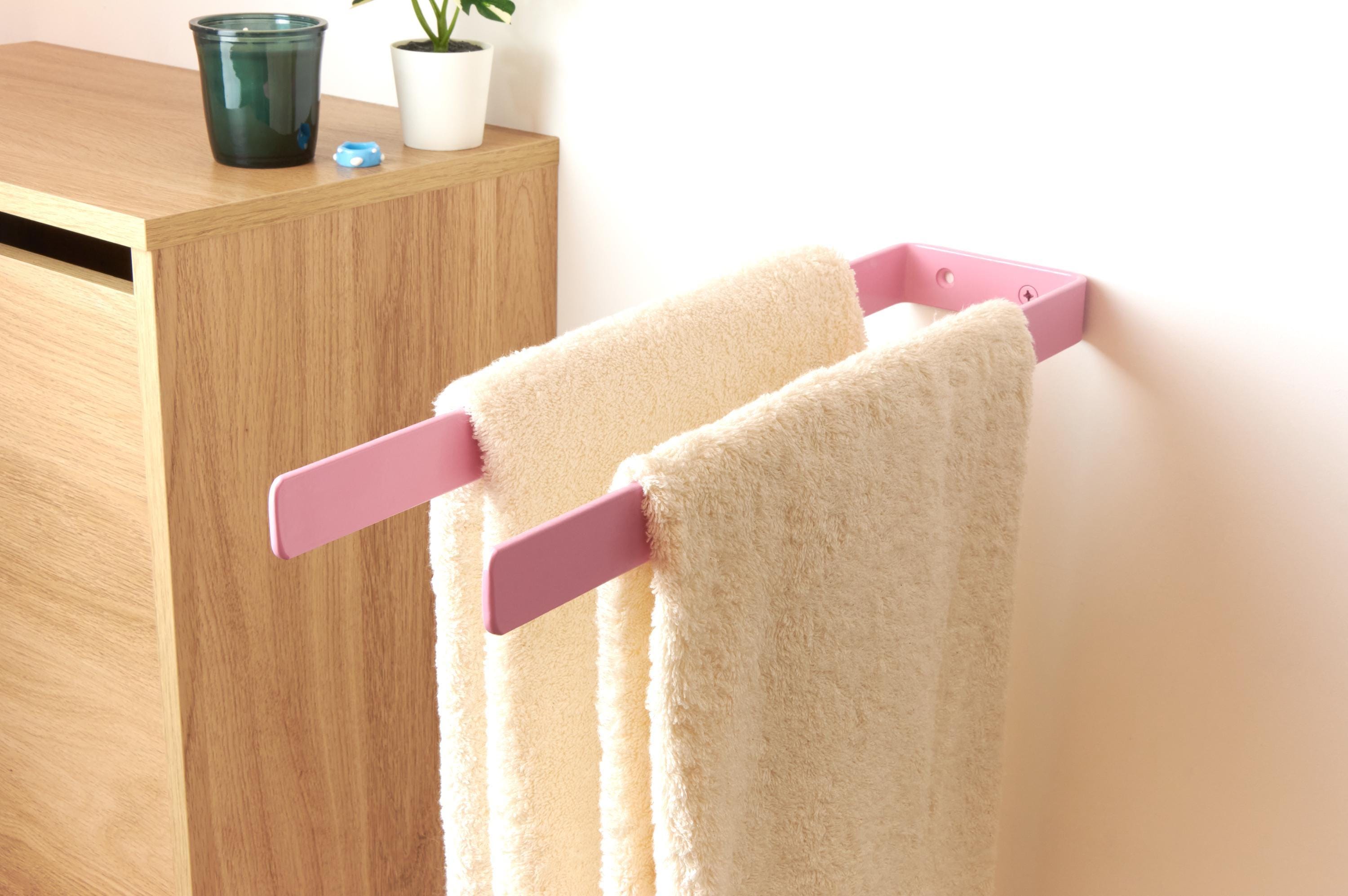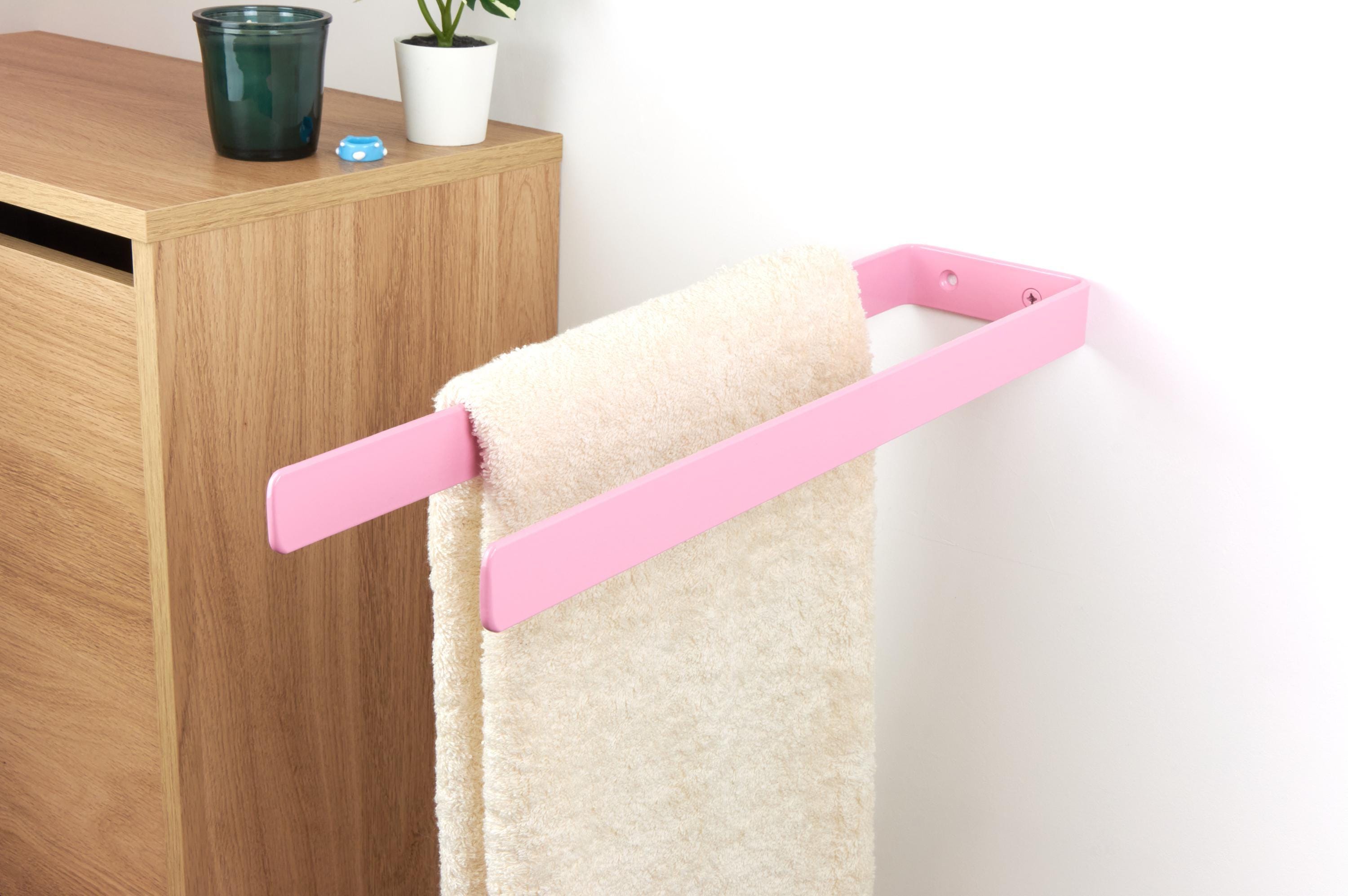 This double towel hanger is a space saving modern metal towel rack, providing a practical and stylish bathroom storage solution! The color of the product in the pictures is Pastel Pink.