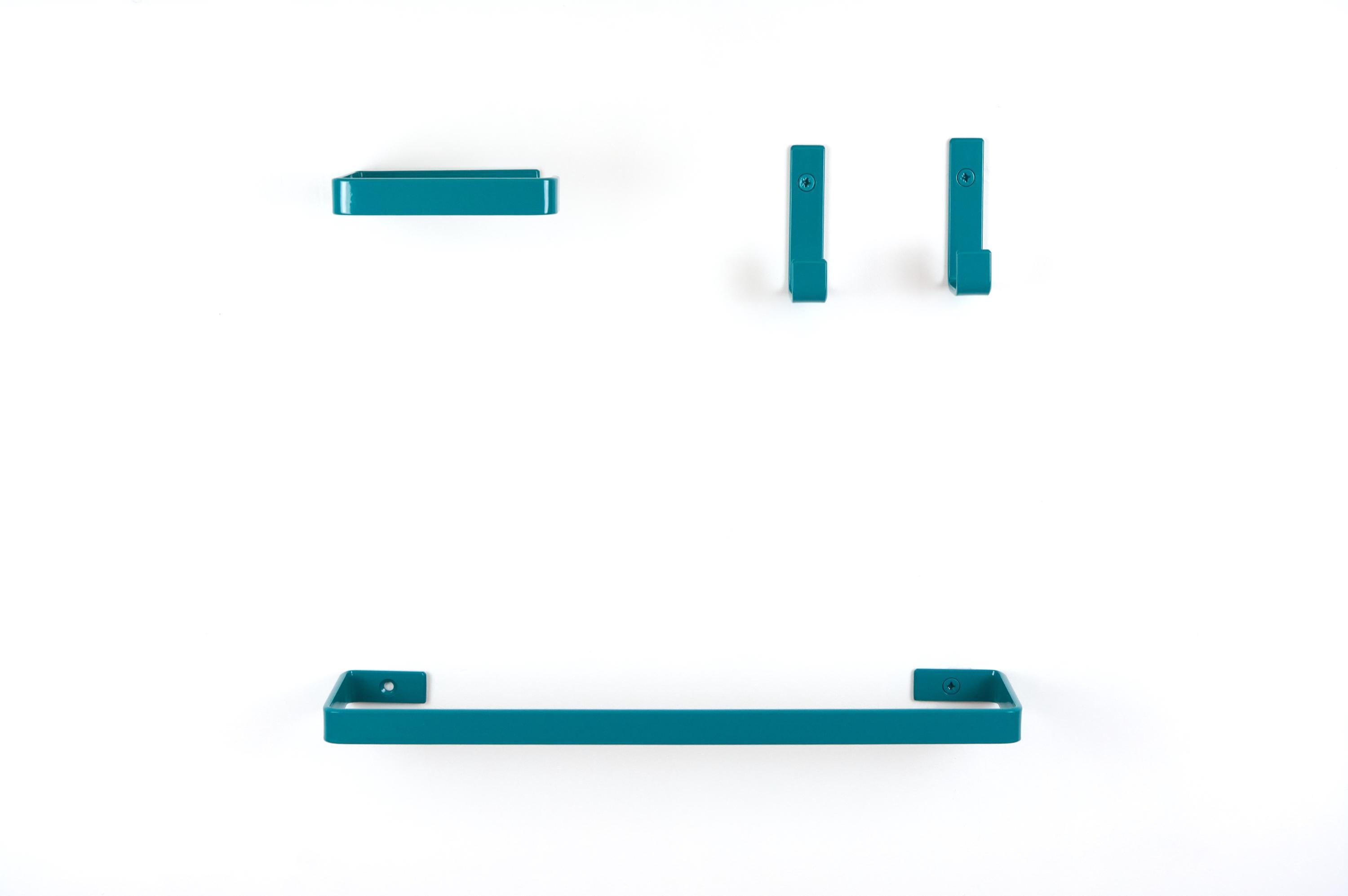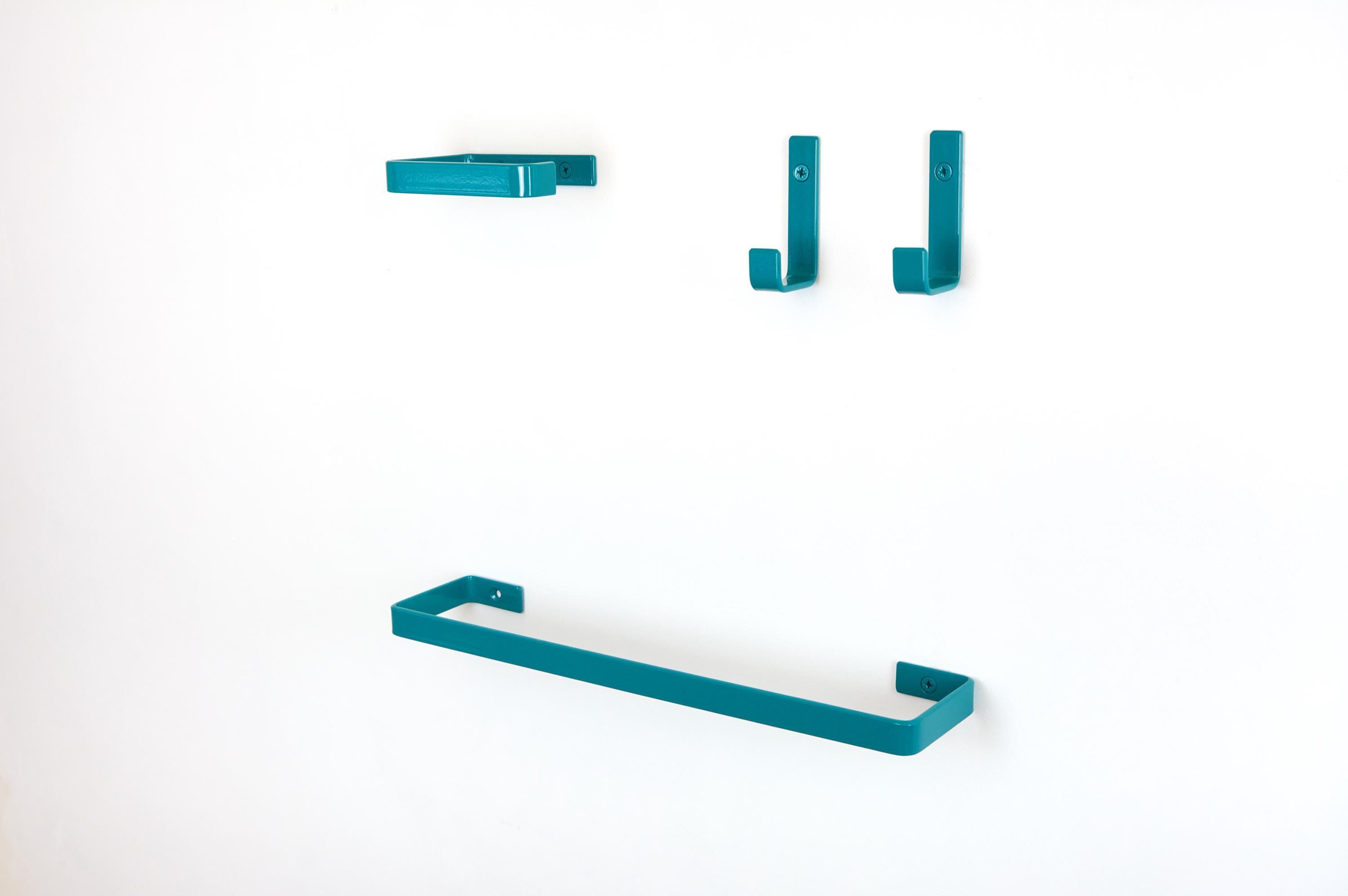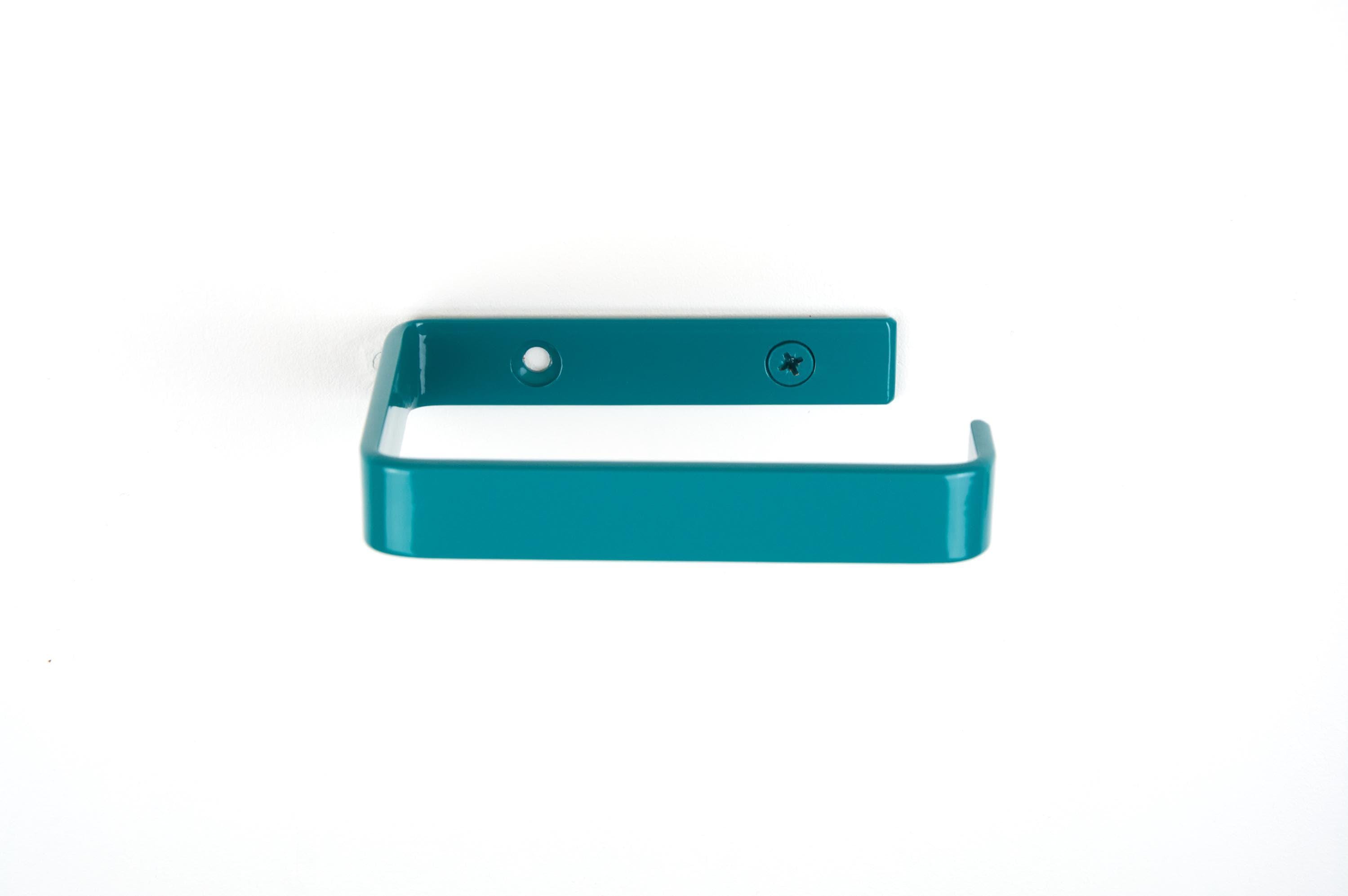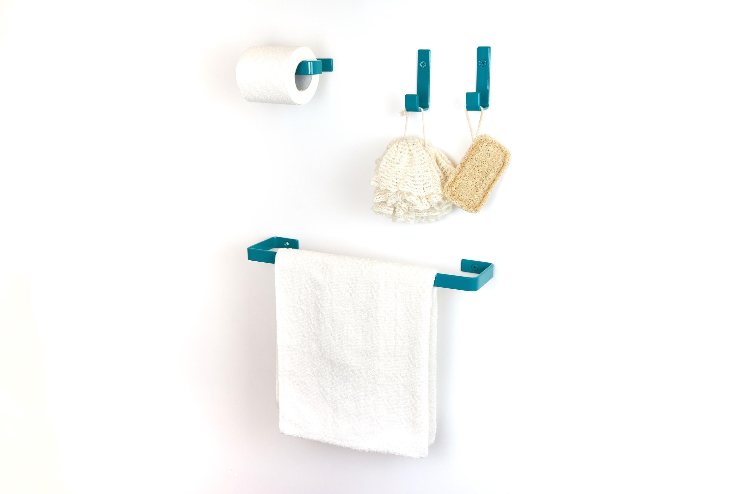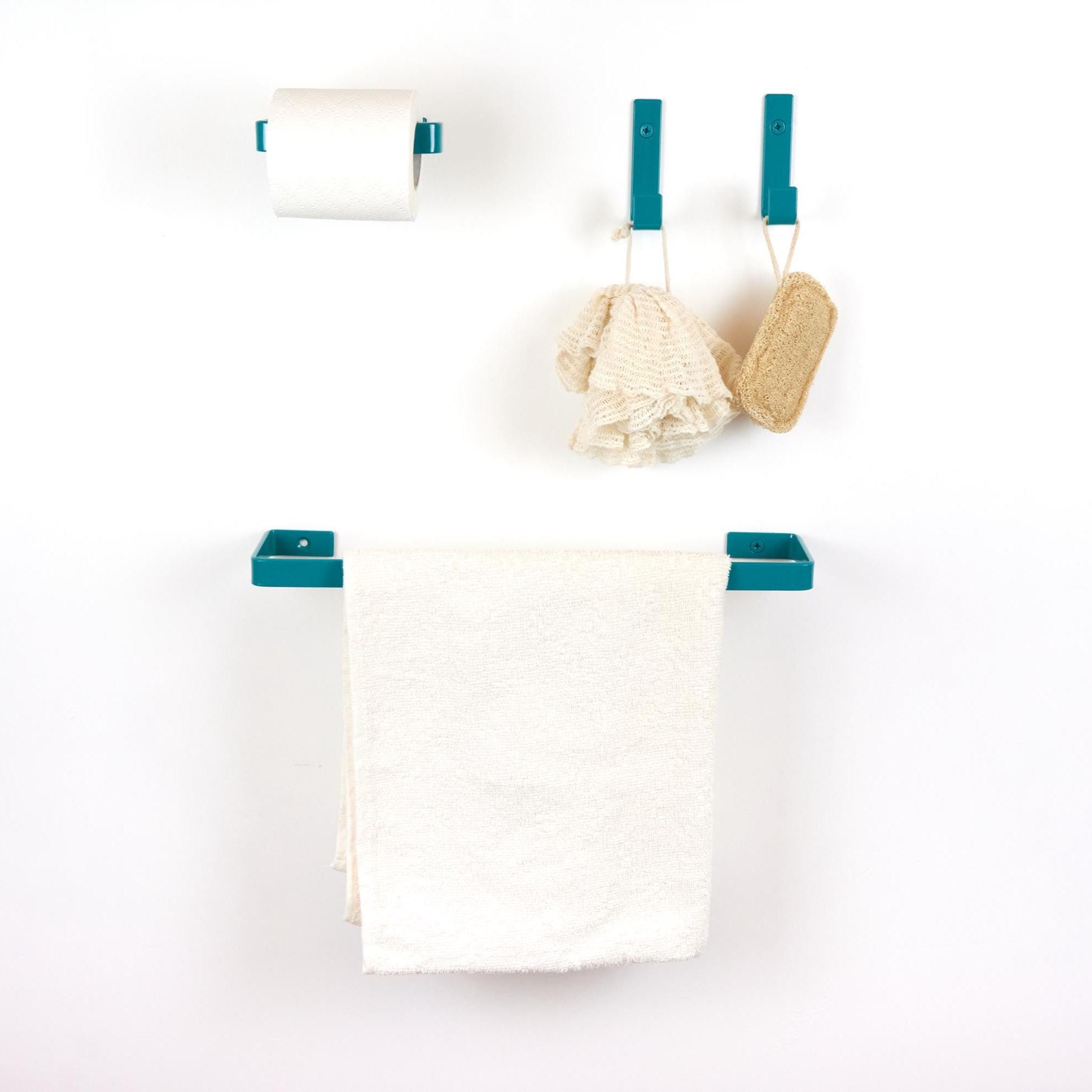 Liven up your space with this vibrant bathroom accessories set - complete with a toilet paper holder, towel holder, and hooks for stylish modern bathroom decor! Color of the set pictured - Turquoise.