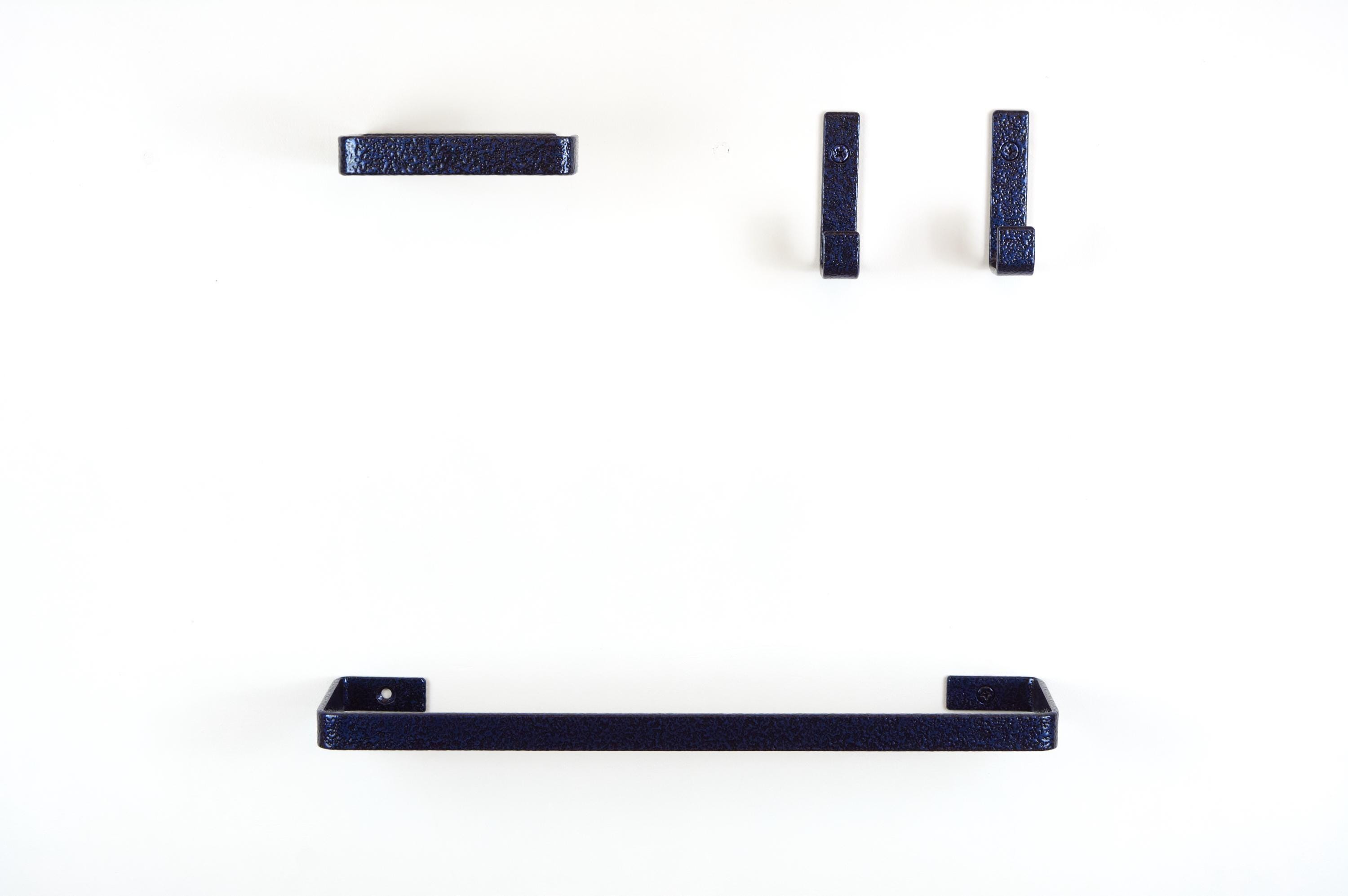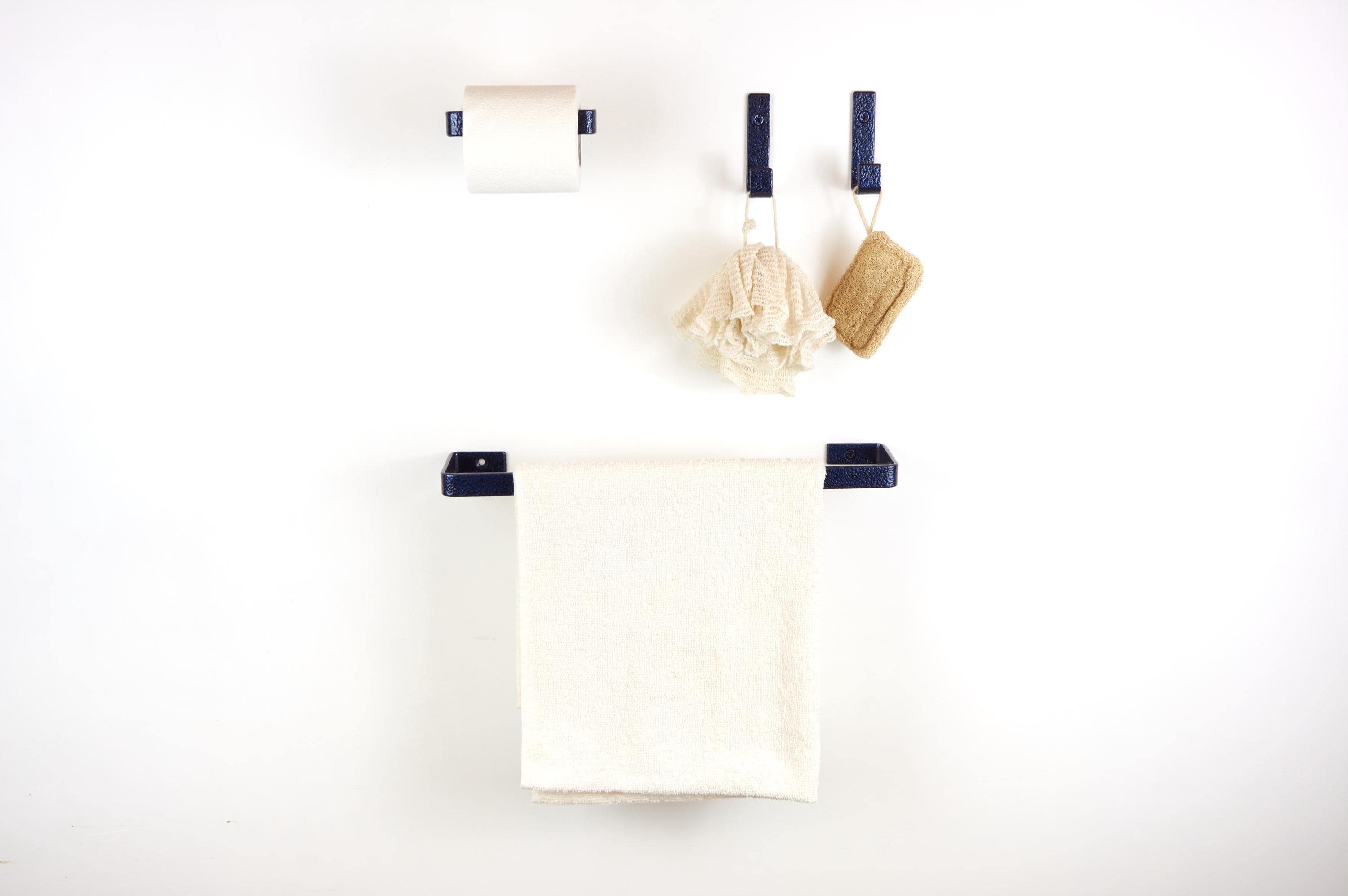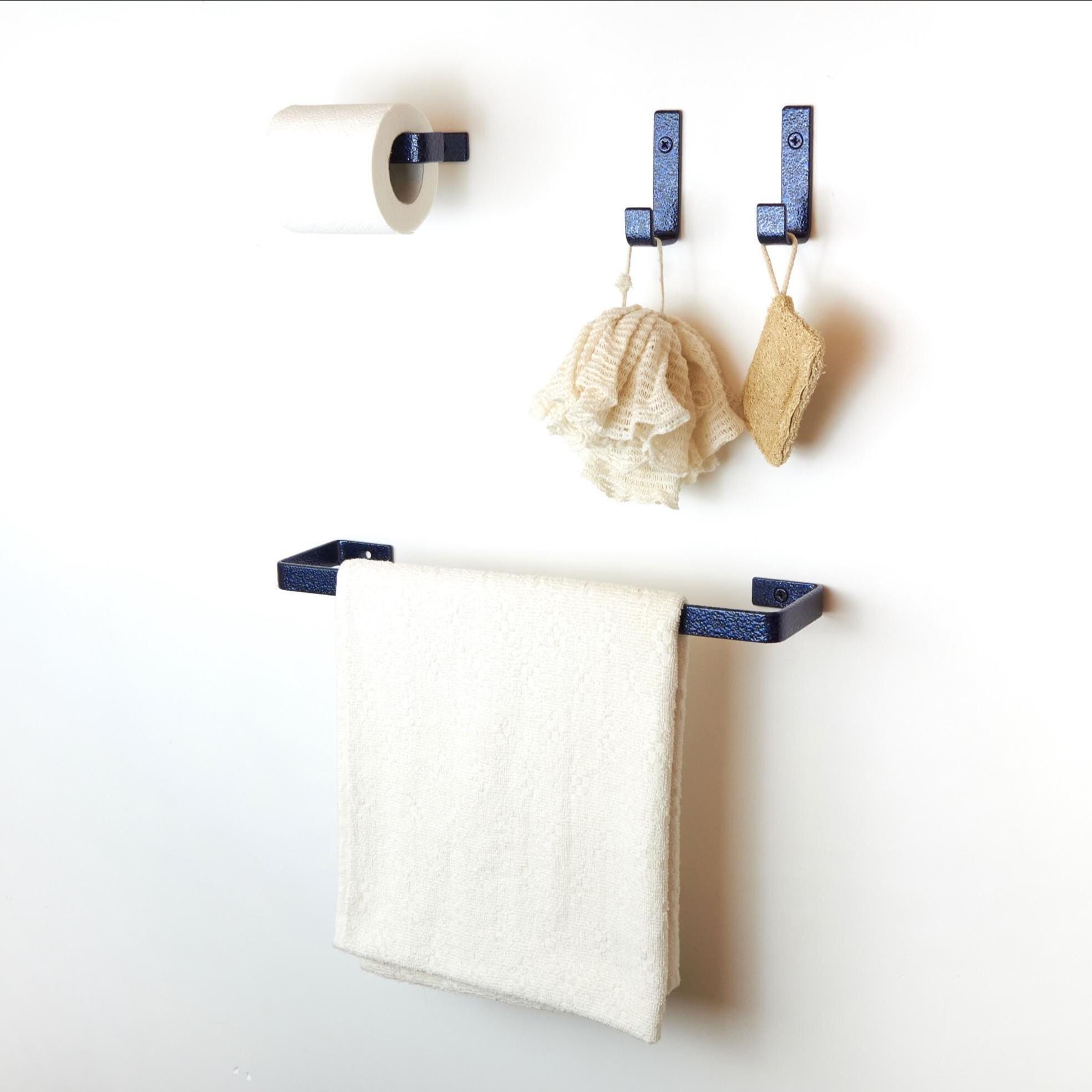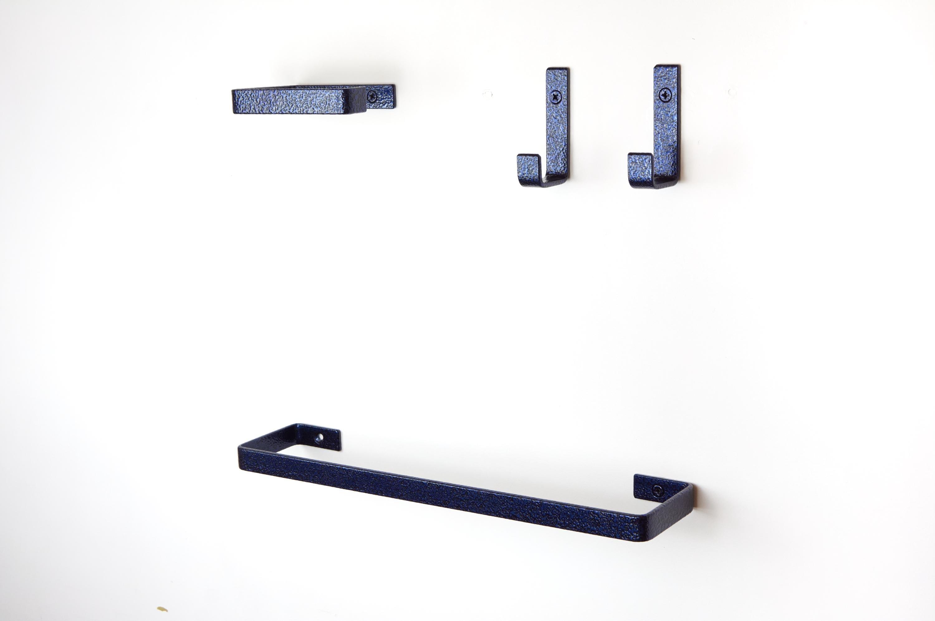 Upgrade your space with this bathroom accessories set - including a contemporary toilet paper holder, towel holder, and hooks for practical bathroom storage! Color of the set pictured - Antique Blue.