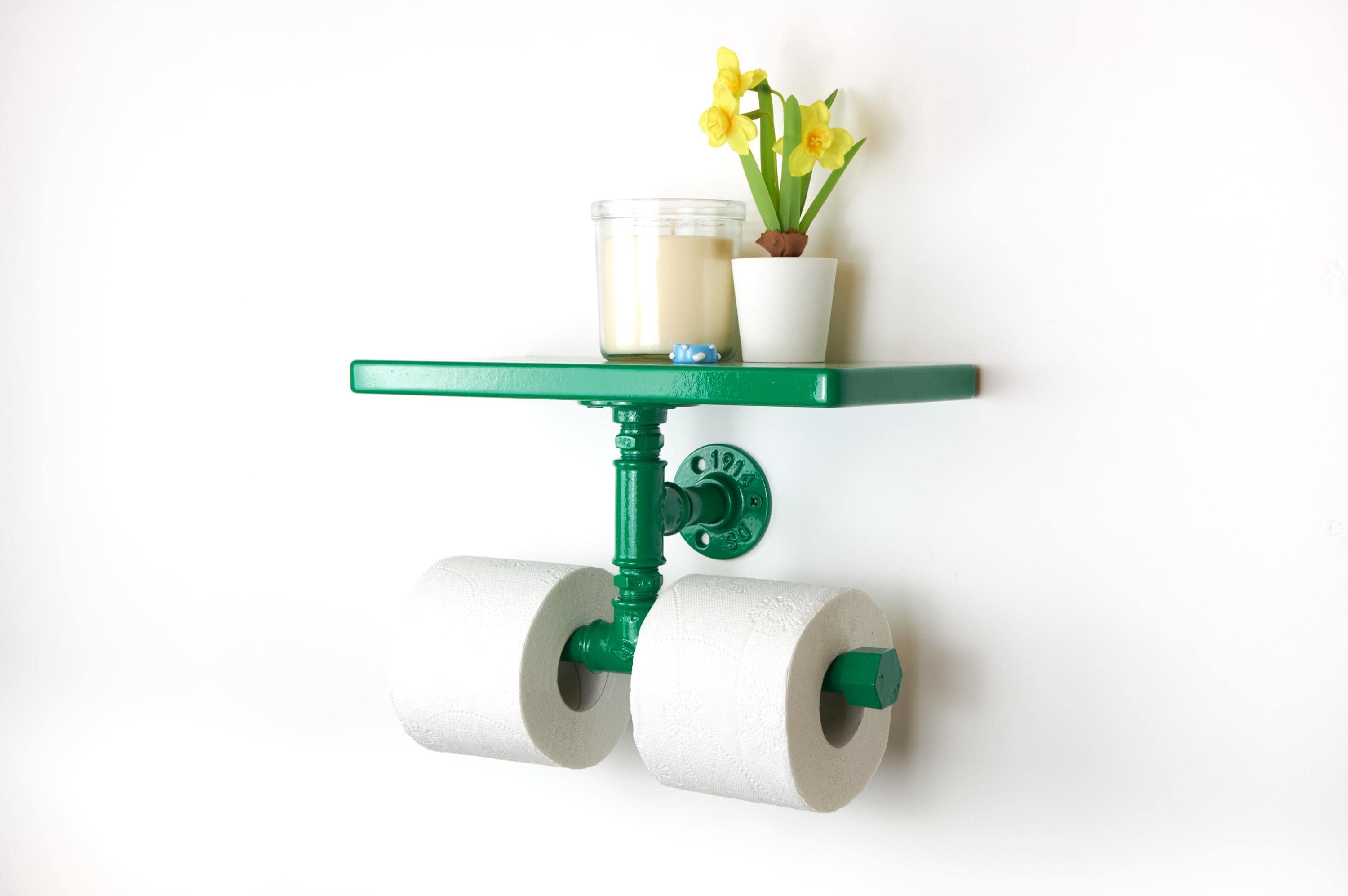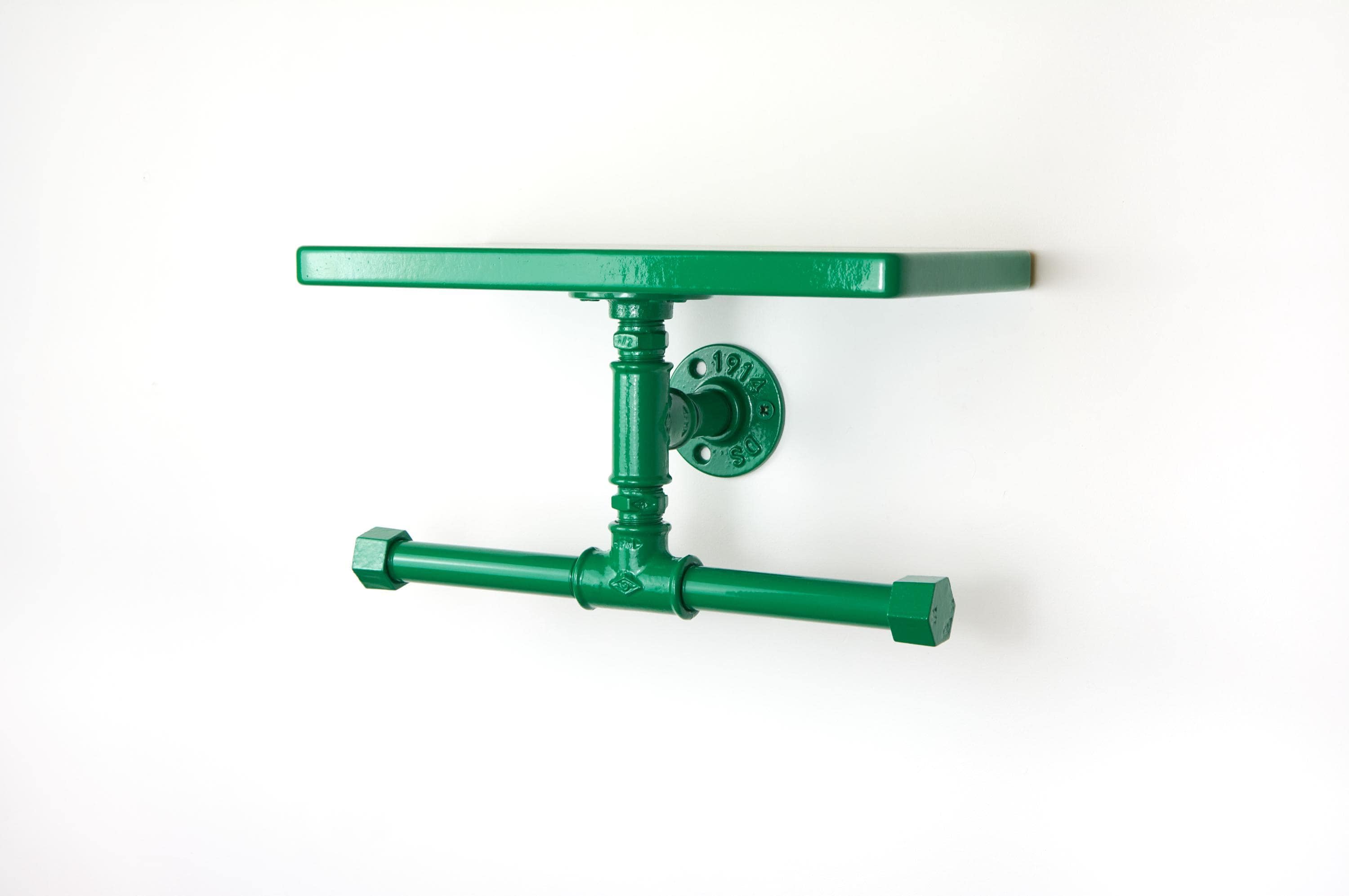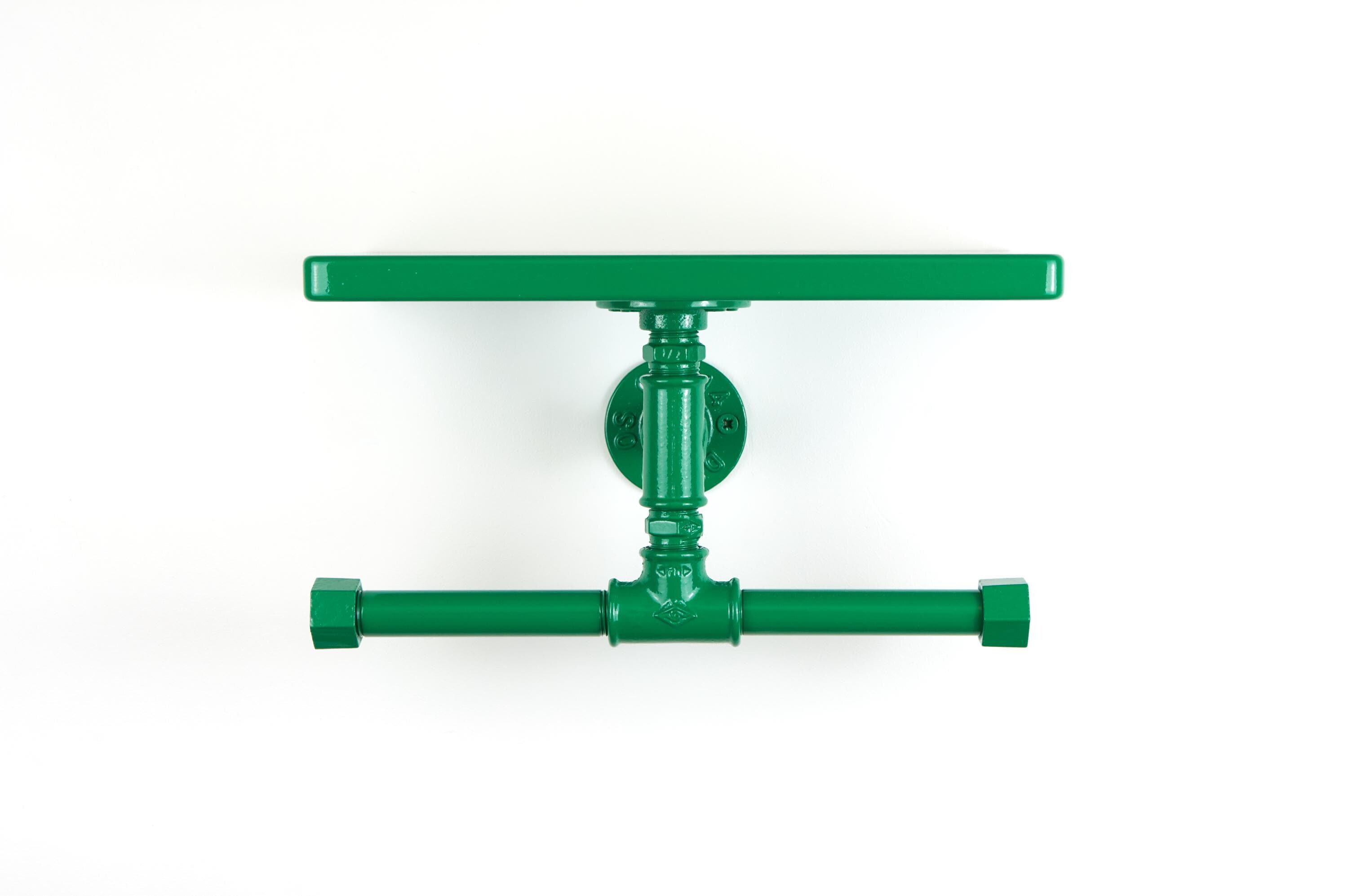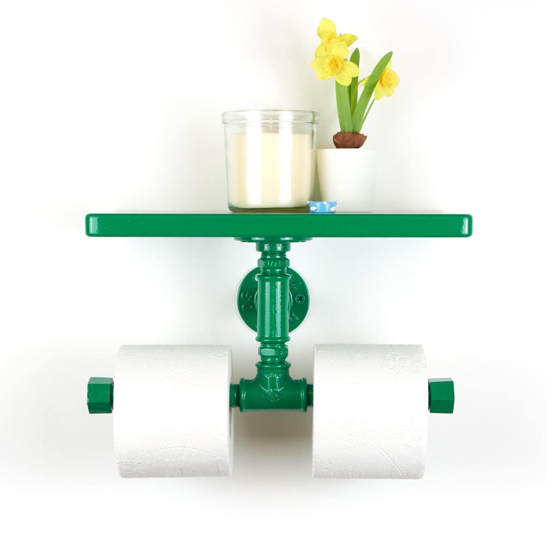 Keep your space tidy with this double toilet paper holder with shelf, a space-saving bathroom storage solution for toilet paper and essentials! Color shown in pictures - Dark Green Gloss.