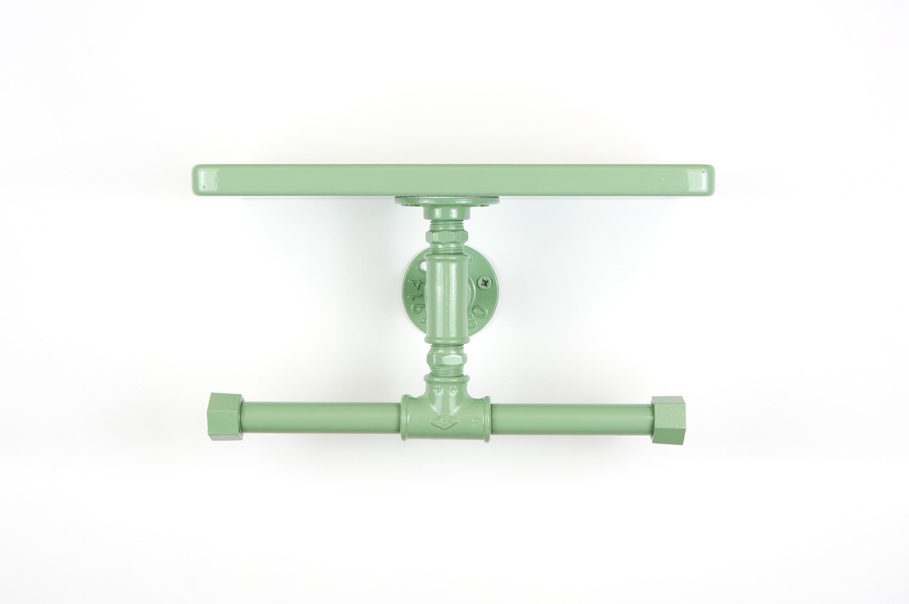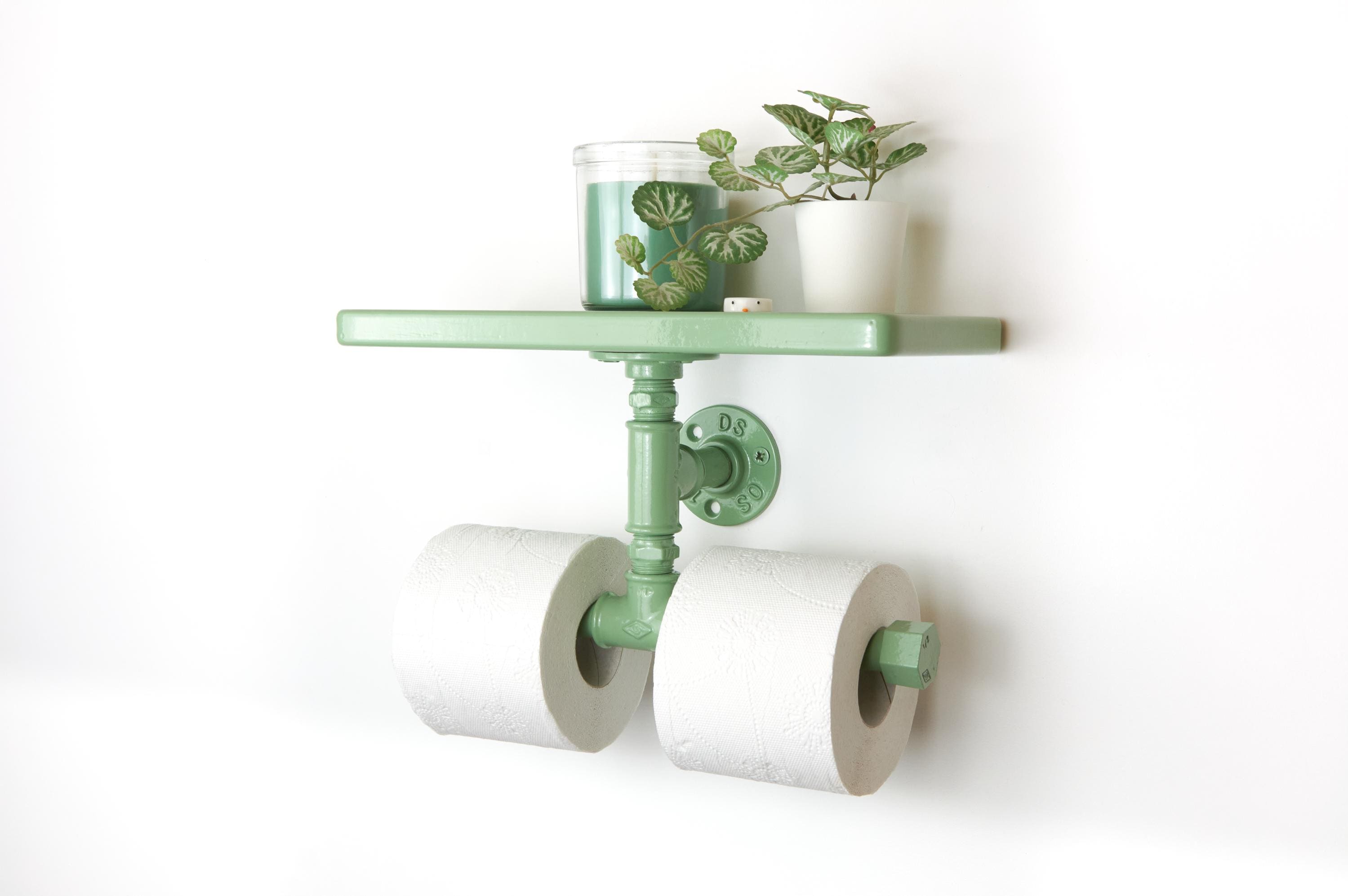Brighten up your space with a pastel double toilet paper holder with shelf, a stylish bathroom organizer that keeps essentials within easy reach! Shown here in Pale Green.