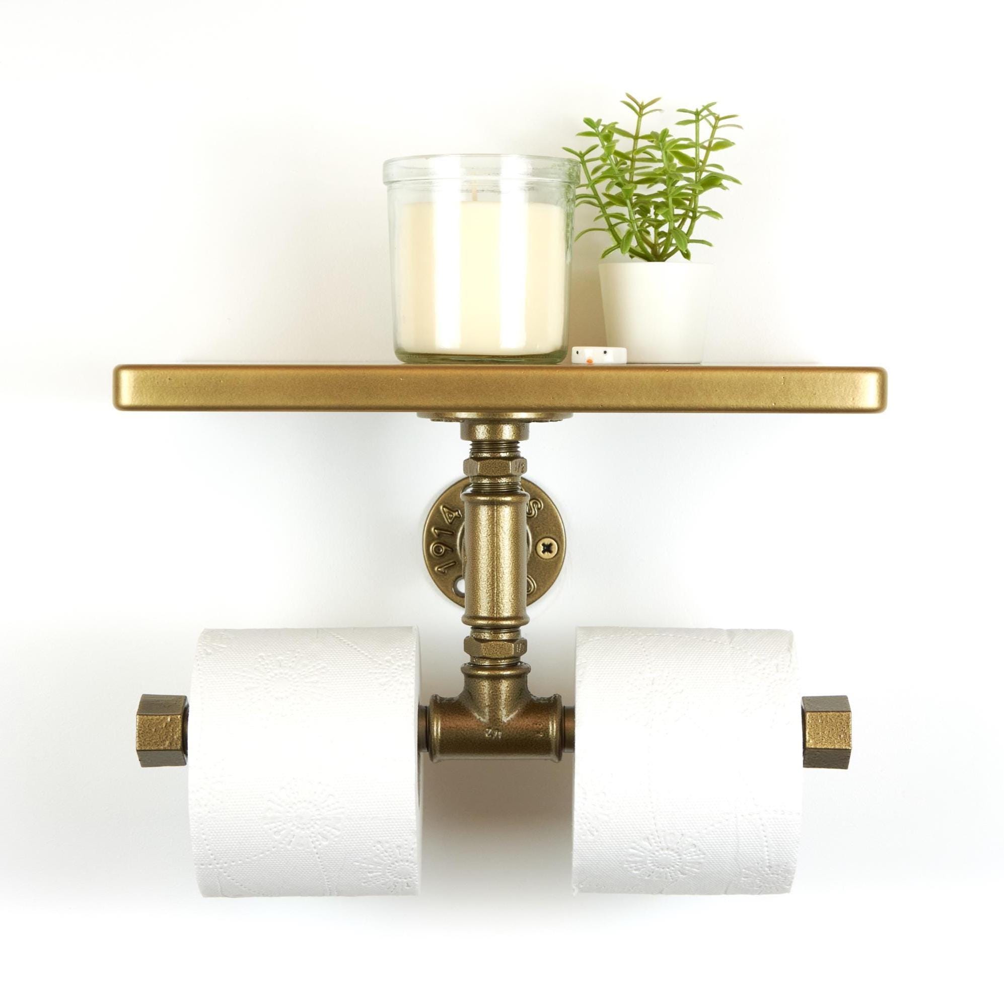 Double Toilet Paper Holder with Shelf Stylish - Bathroom Organizer for Bathroom Essentials, Color Pictured - Aged Brass