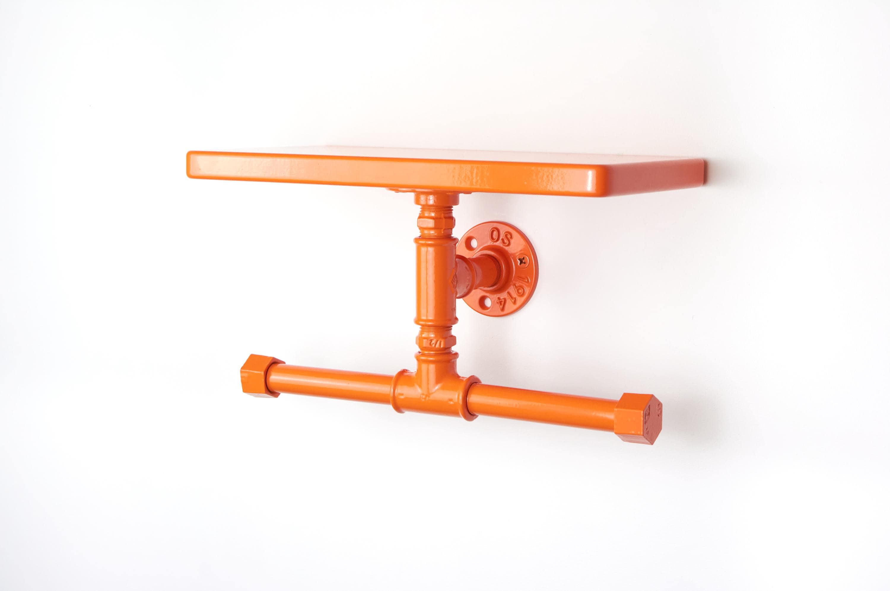 Add a touch of color and functionality to your bathroom with this double toilet paper holder with shelf, designed for convenient storage and everyday style! Color shown in pictures - Orange Gloss.