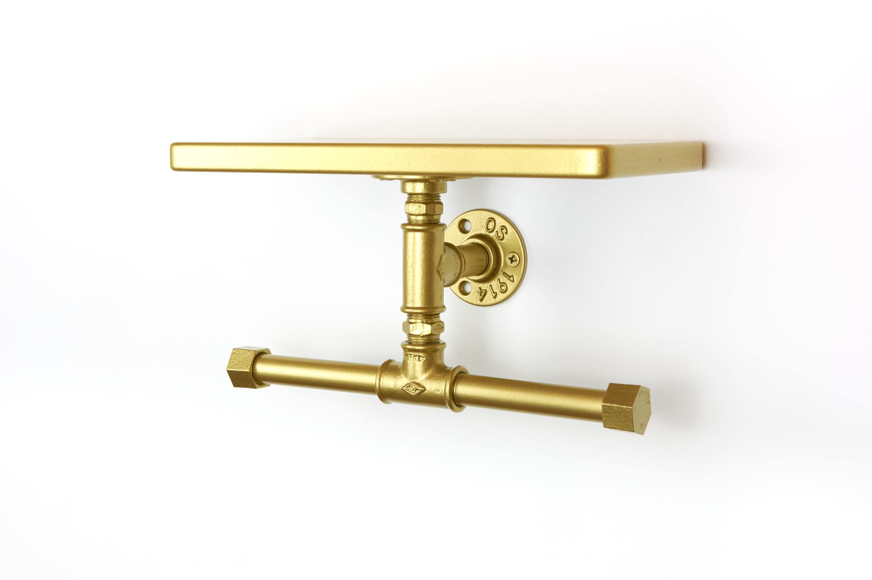 Keep your bathroom organized with this double toilet paper holder with shelf, a modern storage solution for toilet paper and other essentials! Color shown in pictures - Gold/Brass.