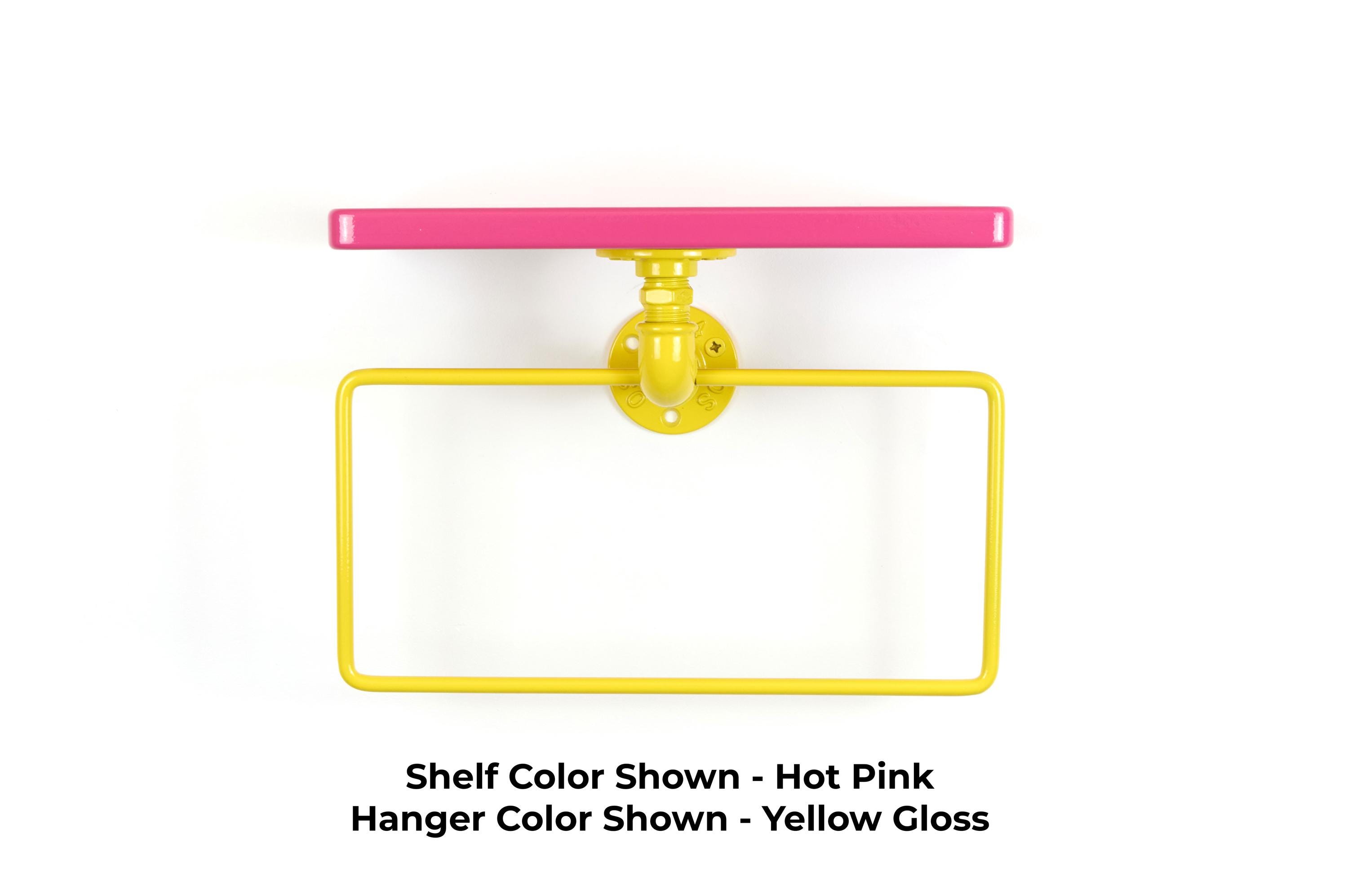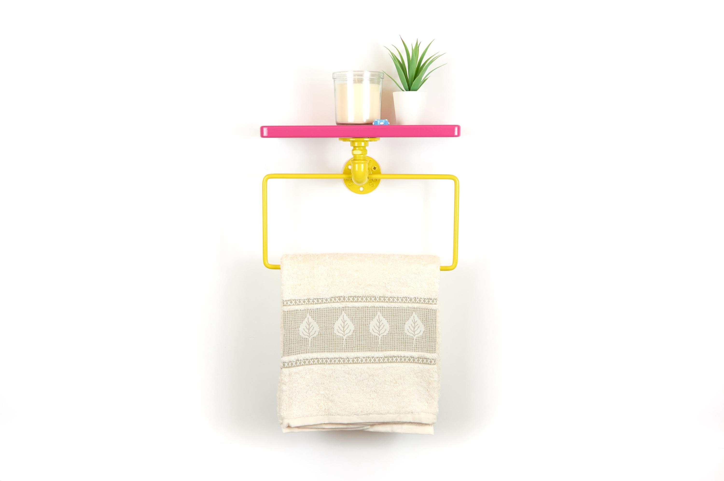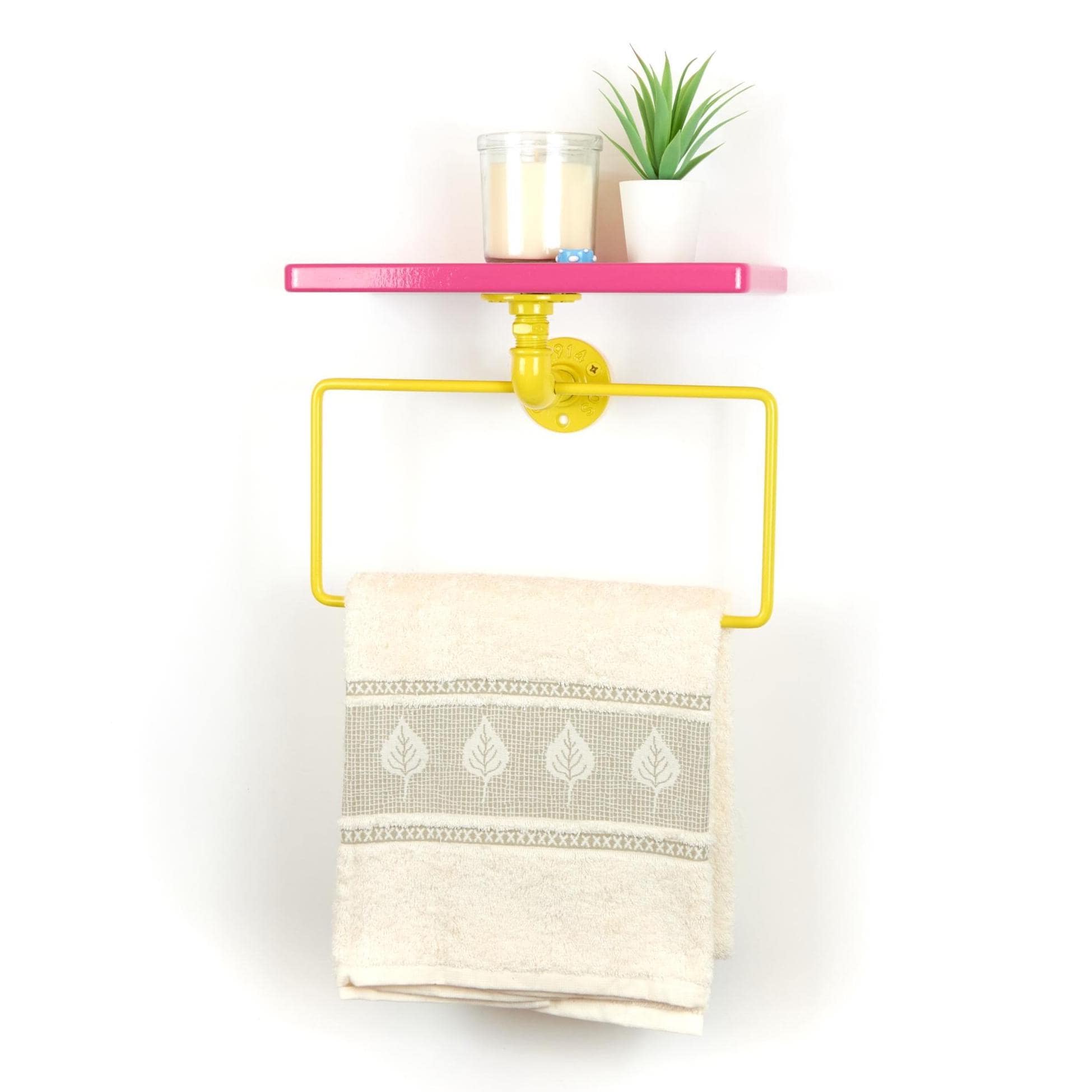 Bring cheerful style and practicality to your bathroom with this colorful towel hanger with shelf, perfect for keeping towels and essentials neatly organized!