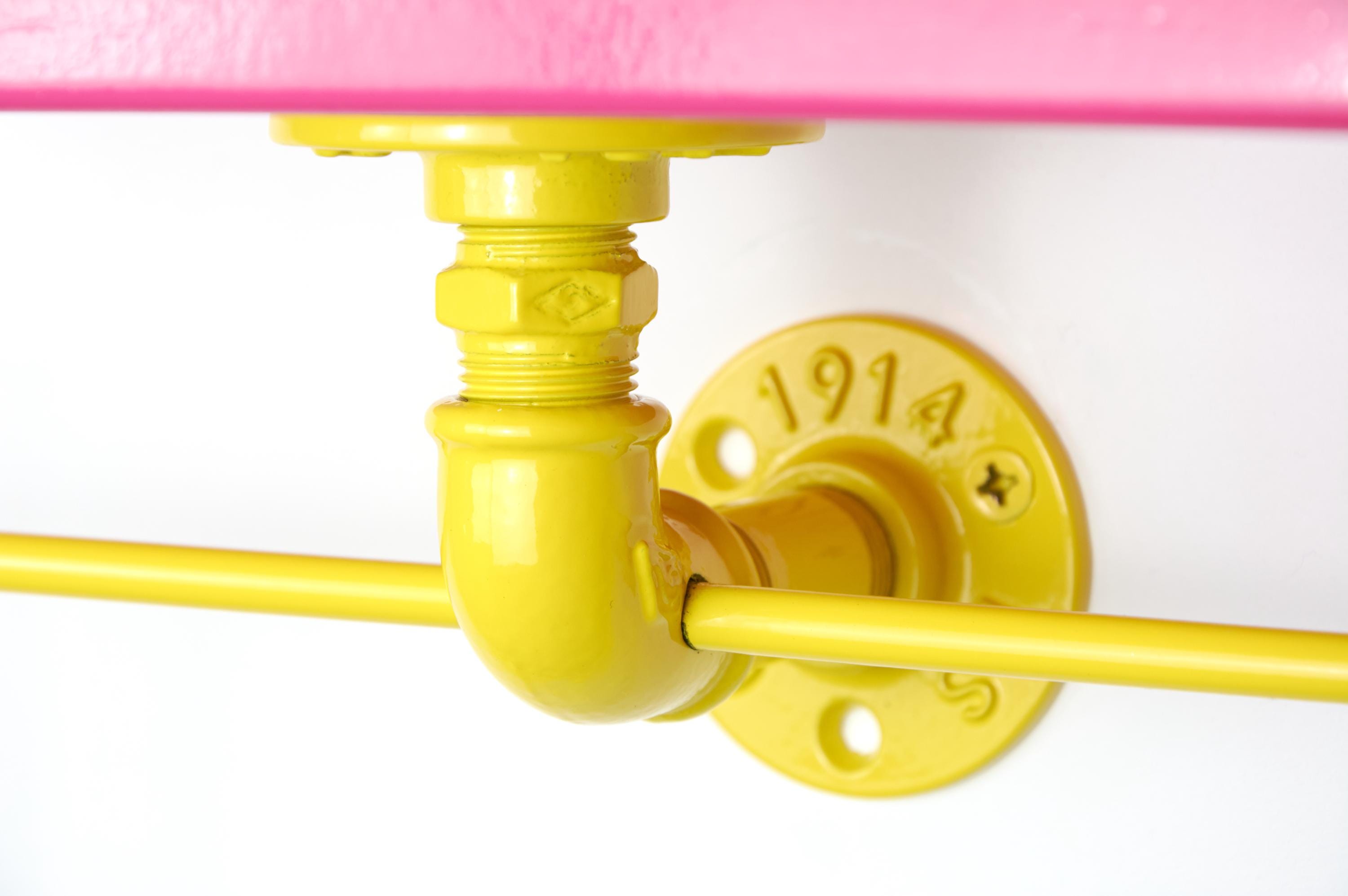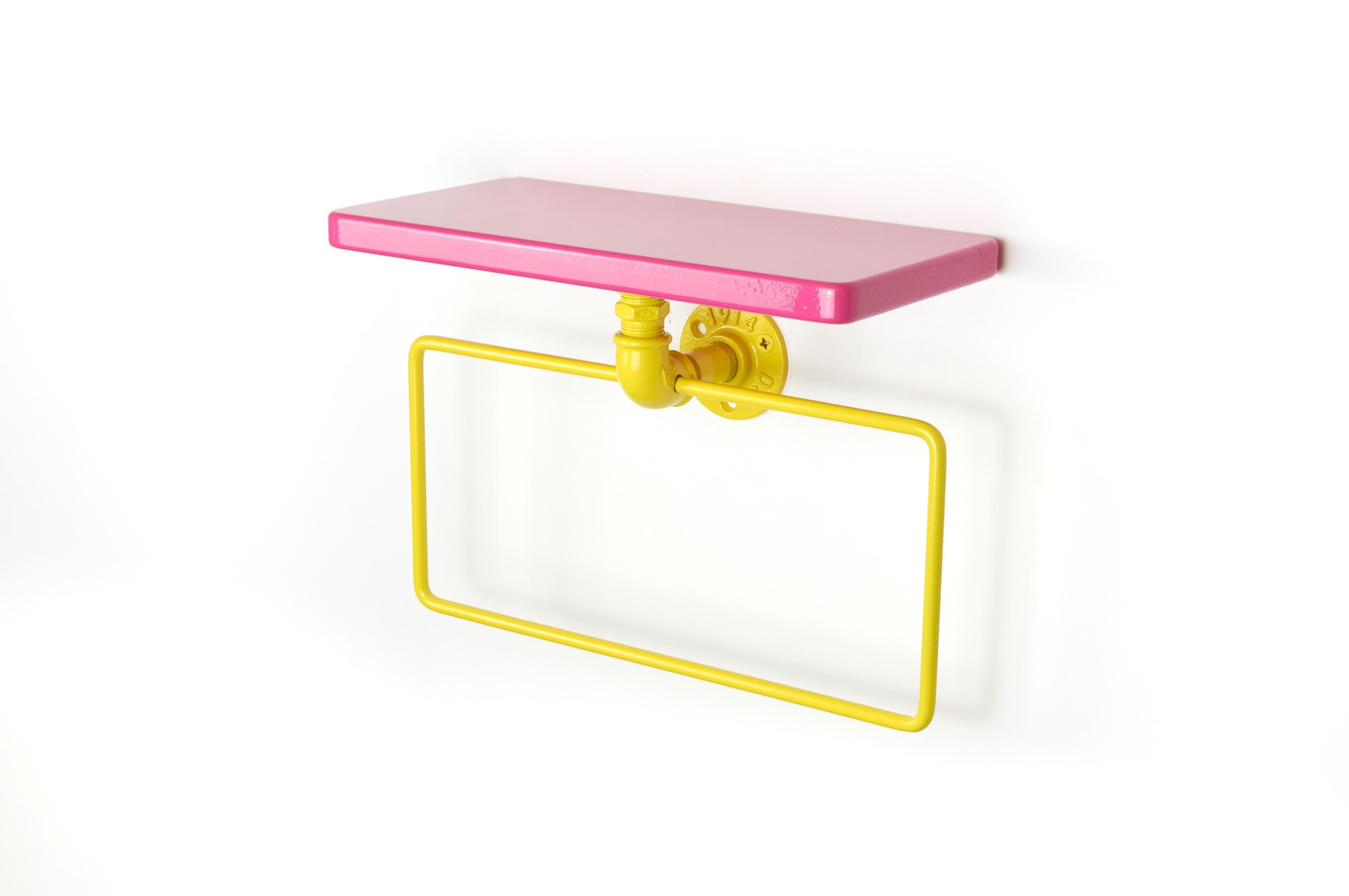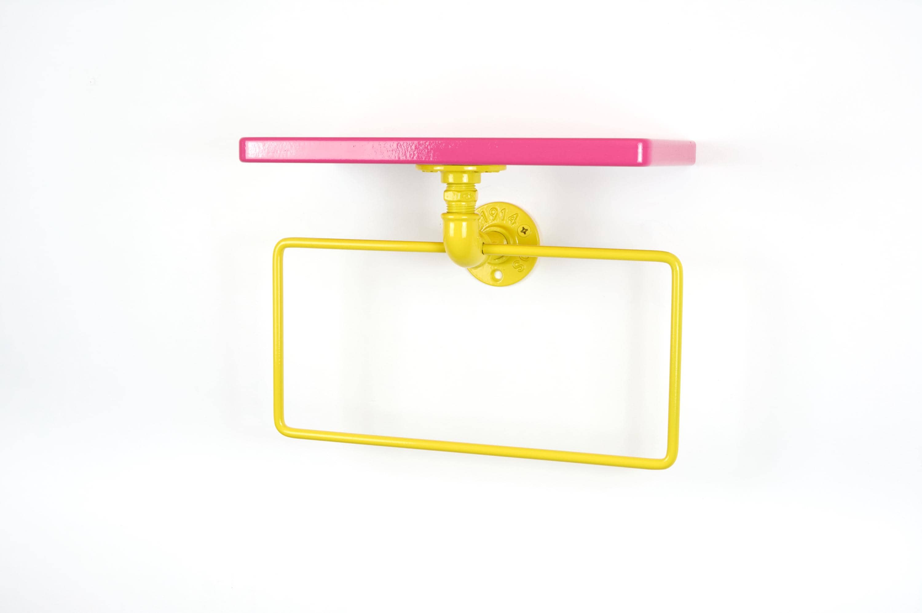 Bring cheerful style and practicality to your bathroom with this colorful towel hanger with shelf, perfect for keeping towels and essentials neatly organized!
