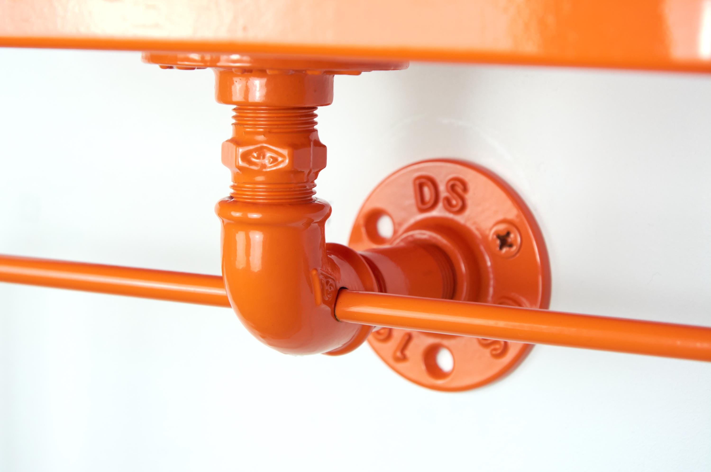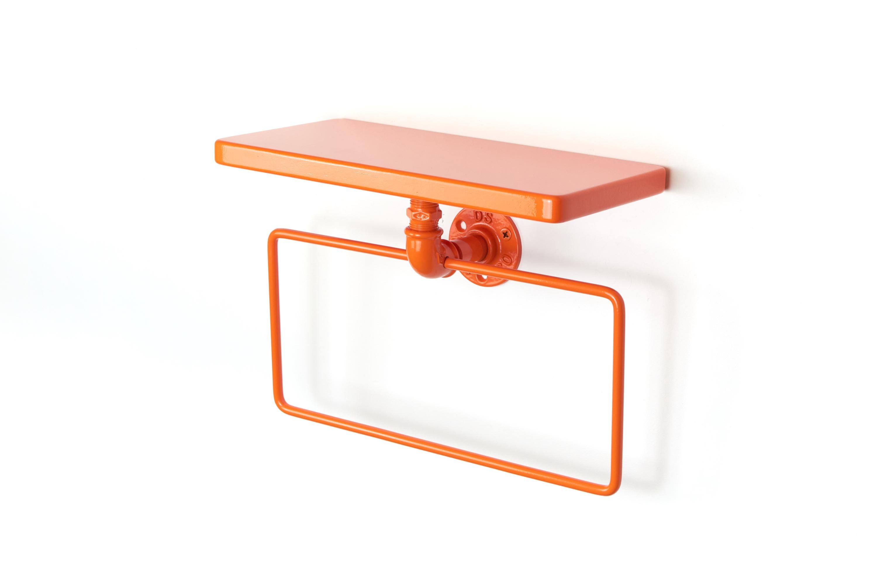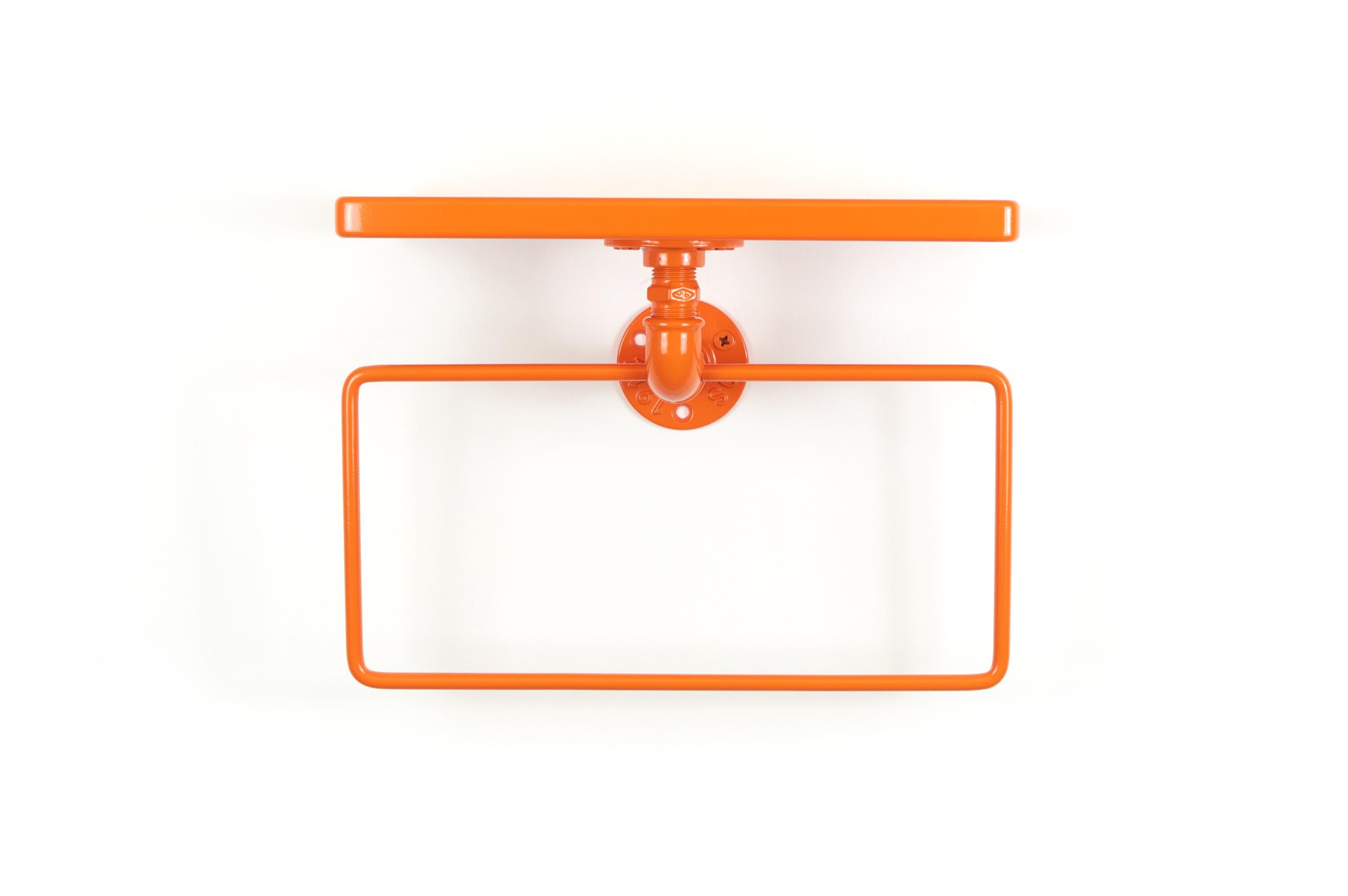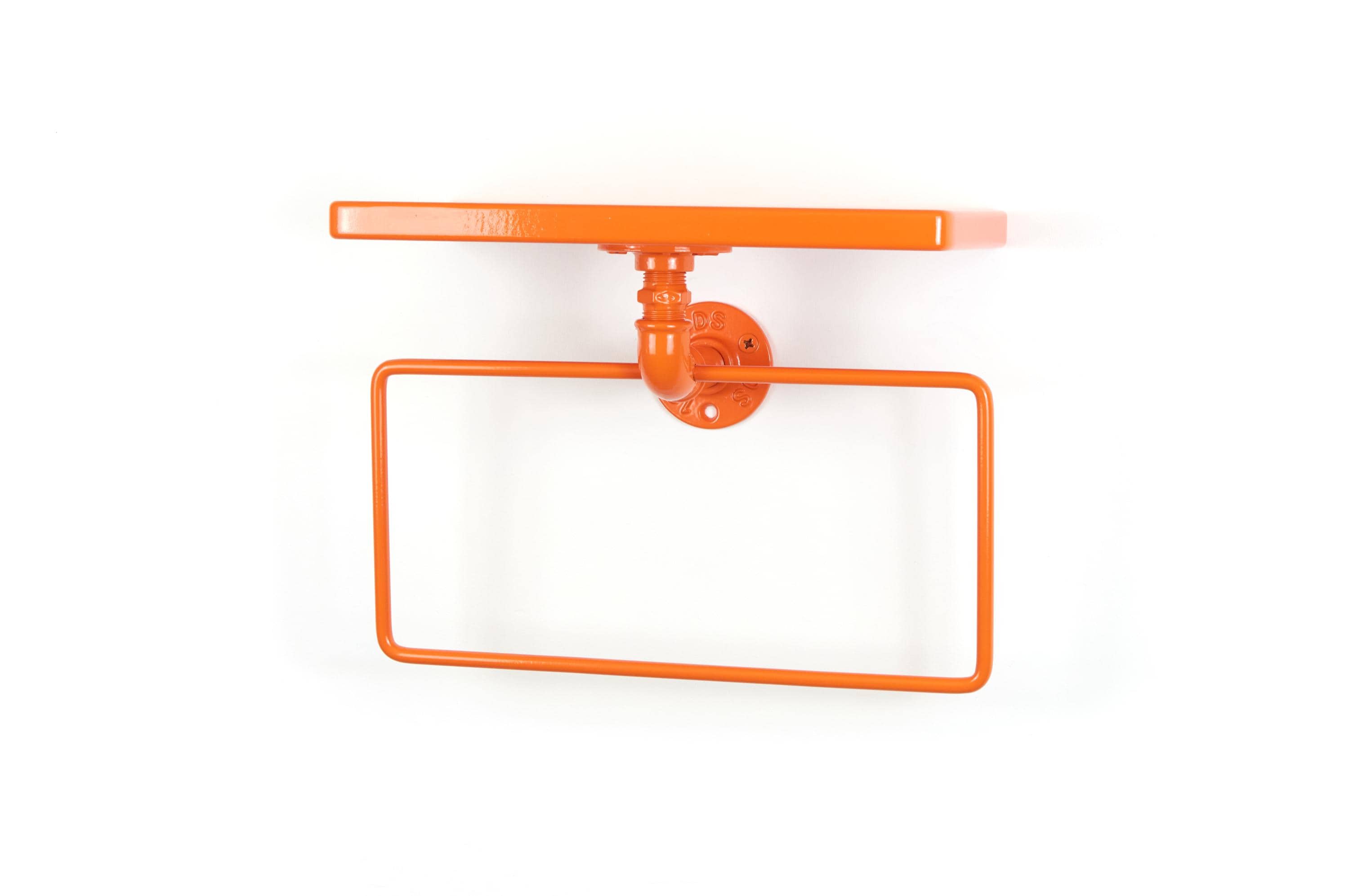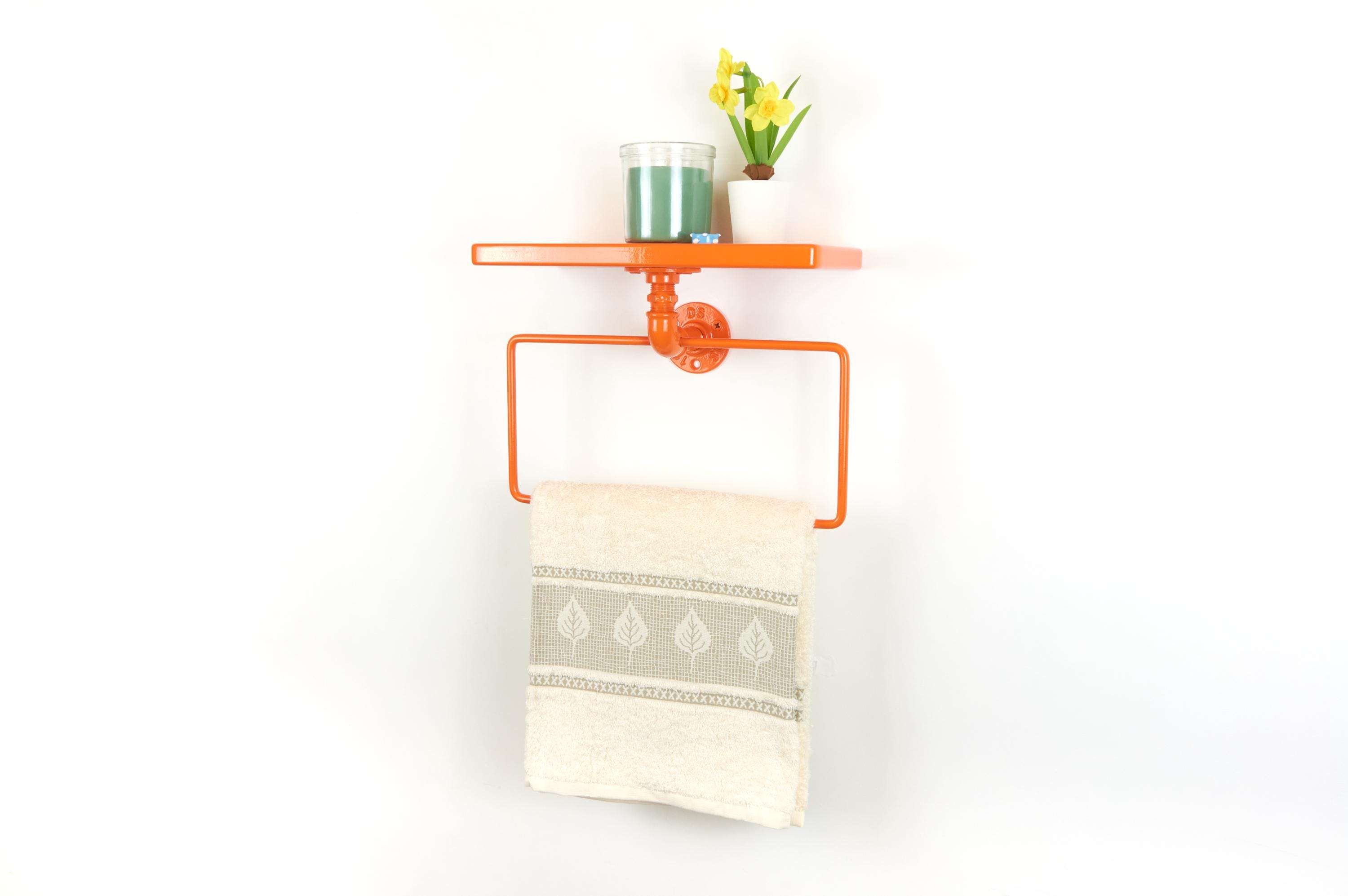 Elevate your bathroom with this sleek minimalist towel holder with shelf, combining modern design with practical everyday storage! Color shown in pictures - Orange Gloss.
